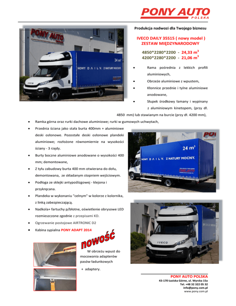 Produkcja nadwozi dla Twojego biznesu IVECO DAILY 35S15 ( nowy model ) ZESTAW MIĘDZYNARODOWY 4850*2280*2200 - 24,33 m3 4200*2280*2200 - 21,06 m3 Rama pośrednia z lekkich profili aluminiowych, Obrzeże aluminiowe z wpustem, Kłonnice przednie i tylne aluminiowe anodowane, Słupek środkowy łamany i wypinany z aluminiowym kinetopem, (przy dł. 4850 mm) lub stawianym na burcie (przy dł. 4200 mm), Ramka górna oraz rurki dachowe aluminiowe; rurki w gumowych uchwytach, Przednia ściana jako stała burta 400mm + aluminiowe deski osłonowe. Pozostałe deski osłonowe plandeki aluminiowe; rozłożone równomiernie na wysokości ściany - 3 rzędy. Burty boczne aluminiowe anodowane o wysokości 400 mm; demontowane, Z tyłu zabudowy burta 400 mm otwierana do dołu, demontowana, ze składanym stopniem wejściowym. Podłoga ze sklejki antypoślizgowej - klejona i przykręcana. Plandeka w wykonaniu "celnym" w kolorze z kolornika, z linką zabezpieczającą. Nadkola+ fartuchy p/błotne, oświetlenie obrysowe LED rozmieszczone zgodnie z przepisami KD. Ogrzewanie postojowe AIRTRONIC D2 Kabina sypialna PONY ADAPT 2014 W obrzeżu wpust do mocowania adapterów pasów ładunkowych + adaptery. PONY AUTO POLSKA 43-170 Łaziska Górne, ul. Wyrska 15a Tel. +48 32 322 05 32 [email protected] www.pony.com.pl Dane techniczne dla podwozia 35C15: Typ nadwozia Nowa skrzynia zamknięta z pełnym systemem aluminiowym ze stelażem i plandeką Wymiar wewnętrzny Waga zabudowy z osprzętem w [kg] Kod Dł. [mm] Szer. [mm] Wys. [mm] Ilość burt na stronie [szt.] SKP 4222 4200 2280 2200 1 520 1226 SKP 4822 4850 2280 2200 2 598 1156 Ładowność [kg] * * waga samochodu wraz z osprzętem (kabina sypialna, ogrzewanie postojowe, pojemnik na wodę, skrzynka narzędziowa, osłony p/najazdowe) bez paliwa i kierowcy Opcje dodatkowe (poza standardem) Burty o wysokości 500 mm Burty o wysokości 600 mm Burty o wysokości 800 mm 2 burty ( zamiast jednej ) z wypinaną kłonicą ( dla nadwozi o długości 4200 mm) Adaptery do pasów ładunkowych 1 para ( 2 szt.) – dodatkowe ponad standard Przednia ściana ze sklejki H = 1250 mm (zamiast przedniej burty) Przednia ściana pełna z paneli aluminiowych Stelaż regulowany w zakresie 0-250 m, podnoszony ręcznie (mechanicznie) – 3 słupkowy Stelaż regulowany w zakresie 0-250 m, podnoszony pneumatycznie (siłowniki gazowe),(mechanicznie) – 3 słupkowy Winda załadowcza +klapa do windy Drzwi tylne pełne z wypełnieniem panelowym Boczna firanka dla 1-go boku lub 2 boków bez systemu napinania ( plandeka zapinana standardowo na chwytki i paski) Boczna firanka dla 1-go boku lub 2 boków z napinaniem plandeki Skrzynka narzędziowa 450 – wodoszczelna zamykana na klucz dodatkowa Skrzynka narzędziowa 600- wodoszczelna zamykana na klucz zamiast skrzynki 450 Poduszki pneumatyczne osi tylnej z manometrem w kabinie kierowcy ( dostawcze )- BEZ KOMPRESORA Poduszki pneumatyczne osi tylnej z manometrem w kabinie kierowcy ( dostawcze )- Z KOMPRESOREM Spojler dachowy standardowy – biały z bocznymi owiewkami (w pakiecie z nadwoziem) zamiast kabiny sypialnej Lakierownie spojlera / kabiny sypialnej na inny kolor niż biały (kolor metalik do ustalenia indywidualnie) Reklama zewnętrzna w dowolnej technice Skontaktuj się z nami: [email protected], Tel. kom. 501 136 996 oddział PONY -MP Group [email protected] tel. kom. 609 60 60 00 Poznaj naszą ofertę: www. pony.com.pl PONY AUTO POLSKA 43-170 Łaziska Górne, ul. Wyrska 15a Tel. +48 32 322 05 32 [email protected] www.pony.com.pl