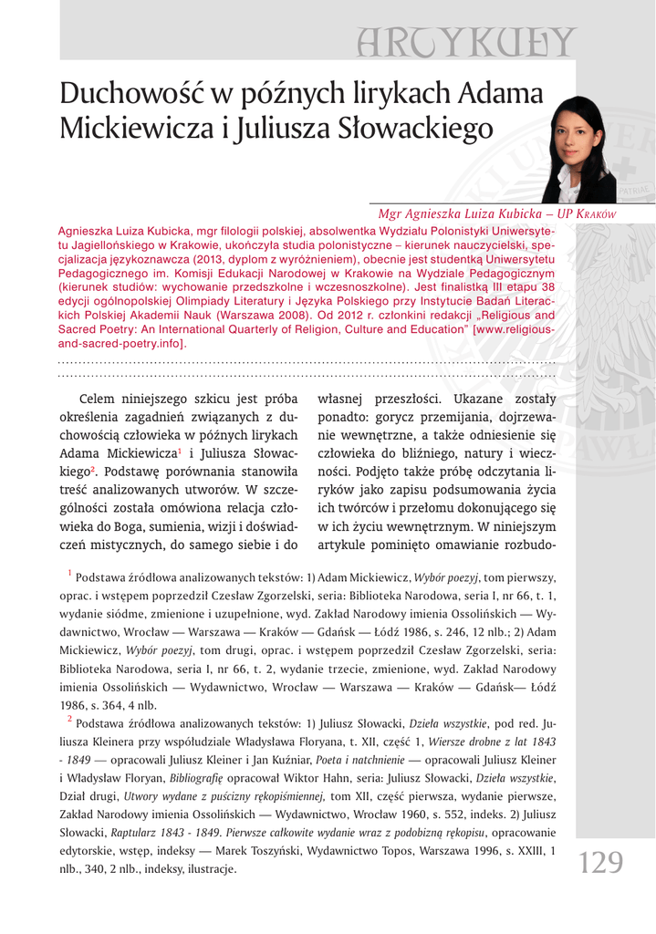 ARTYKUŁY Duchowość w późnych lirykach Adama Mickiewicza i Juliusza Słowackiego Mgr Agnieszka Luiza Kubicka – UP K raków Agnieszka Luiza Kubicka, mgr filologii polskiej, absolwentka Wydziału Polonistyki Uniwersytetu Jagiellońskiego w Krakowie, ukończyła studia polonistyczne – kierunek nauczycielski, specjalizacja językoznawcza (2013, dyplom z wyróżnieniem), obecnie jest studentką Uniwersytetu Pedagogicznego im. Komisji Edukacji Narodowej w Krakowie na Wydziale Pedagogicznym (kierunek studiów: wychowanie przedszkolne i wczesnoszkolne). Jest finalistką III etapu 38 edycji ogólnopolskiej Olimpiady Literatury i Języka Polskiego przy Instytucie Badań Literackich Polskiej Akademii Nauk (Warszawa 2008). Od 2012 r. członkini redakcji „Religious and Sacred Poetry: An International Quarterly of Religion, Culture and Education” [www.religiousand-sacred-poetry.info]. Celem niniejszego szkicu jest próba określenia zagadnień związanych z duchowością człowieka w późnych lirykach Adama Mickiewicza1 i Juliusza Słowackiego2. Podstawę porównania stanowiła treść analizowanych utworów. W szczególności została omówiona relacja człowieka do Boga, sumienia, wizji i doświadczeń mistycznych, do samego siebie i do 1 własnej przeszłości. Ukazane zostały ponadto: gorycz przemijania, dojrzewanie wewnętrzne, a także odniesienie się człowieka do bliźniego, natury i wieczności. Podjęto także próbę odczytania liryków jako zapisu podsumowania życia ich twórców i przełomu dokonującego się w ich życiu wewnętrznym. W niniejszym artykule pominięto omawianie rozbudo- Podstawa źródłowa analizowanych tekstów: 1) Adam Mickiewicz, Wybór poezyj, tom pierwszy, oprac. i wstępem poprzedził Czesław Zgorzelski, seria: Biblioteka Narodowa, seria I, nr 66, t. 1, wydanie siódme, zmienione i uzupełnione, wyd. Zakład Narodowy imienia Ossolińskich — Wydawnictwo, Wrocław — Warszawa — Kraków — Gdańsk — Łódź 1986, s. 246, 12 nlb.; 2) Adam Mickiewicz, Wybór poezyj, tom drugi, oprac. i wstępem poprzedził Czesław Zgorzelski, seria: Biblioteka Narodowa, seria I, nr 66, t. 2, wydanie trzecie, zmienione, wyd. Zakład Narodowy imienia Ossolińskich — Wydawnictwo, Wrocław — Warszawa — Kraków — Gdańsk— Łódź 1986, s. 364, 4 nlb. 2 Podstawa źródłowa analizowanych tekstów: 1) Juliusz Słowacki, Dzieła wszystkie, pod red. Ju- liusza Kleinera przy współudziale Władysława Floryana, t. XII, część 1, Wiersze drobne z lat 1843 - 1849 — opracowali Juliusz Kleiner i Jan Kuźniar, Poeta i natchnienie — opracowali Juliusz Kleiner i Władysław Floryan, Bibliografię opracował Wiktor Hahn, seria: Juliusz Słowacki, Dzieła wszystkie, Dział drugi, Utwory wydane z puścizny rękopiśmiennej, tom XII, część pierwsza, wydanie pierwsze, Zakład Narodowy imienia Ossolińskich — Wydawnictwo, Wrocław 1960, s. 552, indeks. 2) Juliusz Słowacki, Raptularz 1843 - 1849. Pierwsze całkowite wydanie wraz z podobizną rękopisu, opracowanie edytorskie, wstęp, indeksy — Marek Toszyński, Wydawnictwo Topos, Warszawa 1996, s. XXIII, 1 nlb., 340, 2 nlb., indeksy, ilustracje. 129 ARTICLES wanego stanu badań nad lirykami obydwu polskich romantyków3 (z powodów obiektywnych: ograniczone ramy artykułu), przytaczając niektóre pozycje w przypisach i bibliografii. Niniejszy artykuł powstał przy użyciu tzw. metody analizy dokumentu (historiograficzna metodologia badań). 1. Liryki lozańskie Adama Mickiewicza Najważniejszymi późnymi lirykami Adama Mickiewicza są niewątpliwie tzw. Liryki lozańskie (tytuł cyklu nadano wtórnie)4. A. Relacja człowieka do Boga Wiersz Mickiewicza Nad wodą wielką i czystą5 jest utworem religijnym, mistycznym, mówiącym o spotkaniu człowieka z Bogiem, który to Bóg objawia się poprzez stworzoną przez siebie przyrodę. Stwórca jest „wielki i czysty” niczym woda, niewidoczny, trwały, niezniszczalny; ponad wszystko i we wszystkim — przenika całą rzeczywistość. Człowiek 3 (dusza) przemija jak woda i równocześnie trwa jak ona (paradoks — jeden ze stałych elementów liryki mistycznej). Podmiot liryczny ukazuje uniwersalny, konieczny cel dążeń człowieka: „płynięcie”, czyli ruch duchowy, podążanie ku Bogu, ujmowalnemu w słowie jedynie przez paradoksy. Ukazano tu, zatem, dosłowne znaczenie wody, a także wodę jako symbol Boga oraz symbol przemijalności i nieśmiertelności człowieka. J. Kleiner w swojej pracy zauważył: „Sam się czuje poeta wobec przyrody i wobec losu; odpadają zewnętrzne i historyczne uwarunkowania jaźni; znika z horyzontu to, co wyznaczało potężne koleje życia: związek ze zbiorowością, z narodem; w cień usuwa się (...) twórczość poetycka. Zostaje czysta osobowość: indywidualna i wszechludzka [uniwersalna]”6. Liczy się więc tylko „ja” (dusza) i Bóg, „ja” wobec Boga obecnego w przyrodzie (nawiązanie do myśli św. Augustyna). Por. 1) Juliusz Kleiner, Liryki lozańskie, [w:] Liryki lozańskie Adama Mickiewicza. Strona Lemanu. Antologia, oprac. Marian Stala, wyd. Universitas, Kraków 1998, s. 127-135, przyp.; 2) Marian Maciejewski, Mickiewiczowskie „czucia wieczności” (czas i przestrzeń w liryce lozańskiej). Przestrzenne pojmowanie wieczności [w:] Liryki lozańskie Adama Mickiewicza. Strona Lemanu. Antologia, oprac. Marian Stala, Kraków 1998, s. 203-256, przyp.; 3) Marian Stala (oprac., red.), Liryki lozańskie Adama Mickiewicza. Strona Lemanu. Antologia, Kraków 1998, s. 416, 4 nlb., przyp.; 4) Alina Witkowska, Ryszard Przybylski, Romantyzm III. Juliusz Słowacki, Warszawa 2002, s. 743, przyp., indeks, il.; 5) Krystyna Zamącińska, O kilku motywach wierszy Słowackiego, „Roczniki Humanistyczne”, „Prace z Polonistyki” [wyd. Towarzystwo Naukowe Katolickiego Uniwersytetu Lubelskiego, Lublin 1961], t. IX: 1960, zesz. 1, s. 35-54, przyp.; 6) Czesław Zgorzelski, Liryka w pełni romantyczna. Studia i szkice o 