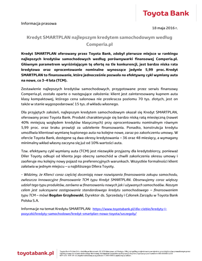 Informacja prasowa 18 maja 2016 r. Kredyt SMARTPLAN najlepszym kredytem samochodowym według Comperia.pl Kredyt SMARTPLAN oferowany przez Toyota Bank, zdobył pierwsze miejsce w rankingu najlepszych kredytów samochodowych według porównywarki finansowej Comperia.pl. Głównym parametrem wyróżniającym tę ofertę na tle konkurencji, jest bardzo niska rata kredytowa oraz oprocentowanie nominalne wynoszące jedynie 5,99 proc. Kredyt SMARTPLAN to finansowanie, które jednocześnie pozwala na efektywny cykl wymiany auta na nowe, co 3-4 lata (TCM). Zestawienie najlepszych kredytów samochodowych, przygotowane przez serwis finansowy Comperia.pl, zostało oparte o następujące założenia: klient jest zainteresowany kupnem auta klasy kompaktowej, którego cena salonowa nie przekracza poziomu 70 tys. złotych, jest on także w stanie wygospodarować 15 tys. zł wkładu własnego. Dla przyjętych założeń, najlepszym kredytem samochodowym okazał się Kredyt SMARTPLAN, oferowany przez Toyota Bank. Produkt charakteryzuje się bardzo niską ratą miesięczną (nawet 40% mniejszą względem kredytów klasycznych) przy oprocentowaniu nominalnym równym 5,99 proc. oraz braku prowizji za udzielenie finansowania. Ponadto, konstrukcja kredytu umożliwia klientowi wymianę kupionego auta na kolejne nowe, zaraz po zakończeniu umowy. W ofercie Toyota Bank, dostępne są dwa okresy kredytowania – 36 oraz 48 miesięcy, a wymagany minimalny wkład własny zaczyna się już od 10% wartości auta. Tzw. efektywny cykl wymiany auta (TCM) jest niezwykle przyjazny dla kredytobiorcy, ponieważ Diler Toyoty odkupi od klienta jego obecny samochód w chwili zakończenia okresu umowy i zaoferuje mu kolejny nowy pojazd na preferencyjnych warunkach. Wszystkie formalności klient załatwia w jednym miejscu – u najbliższego Dilera Toyoty. - Widzimy, że Klienci coraz częściej doceniają nowe rozwiązania finansowania zakupu samochodu, zwłaszcza innowacyjne finansowanie TCM typu Kredyt SMARTPLAN. Obserwujemy coraz większy udział tego typu produktów, zarówno w finansowaniu nowych jak i używanych samochodów. Naszym celem jest sukcesywne zastępowanie standardowego kredytu samochodowego – finansowaniem typu TCM – mówi Bogdan Grzybowski, Dyrektor ds. Sprzedaży i Członek Zarządu w Toyota Bank Polska S.A. Informacje na temat Kredytu SMARTPLAN: https://www.toyotabank.pl/dla-ciebie/kredyty-ipozyczki/kredyty-samochodowe/kredyt-smartplan-nowa-toyota/szczegoly/ Informacja o banku: Toyota Bank Polska S.A. prowadzi działalność na krajowym rynku od 2001 roku. W 2002 bank uruchomił także działalność leasingową w spółce Toyota Leasing Polska Sp. z o.o. Oferta banku skupia się głównie wokół finansowania zakupu samochodów Toyota. Usługi banku skierowane są zarówno do Klientów indywidualnych, jak i przedsiębiorstw. W 2007 roku bank uruchomił platformę bankowości elektronicznej. Oferta banku została rozszerzona o konta osobiste i oszczędnościowe, lokaty, pożyczki i karty płatnicze, a także systemy obsługi poprzez Internet, telefon i SMS. Kontakt prasowy: Maciej Sitarski Dominika Cepek [email protected] +48.511.414.178 [email protected]