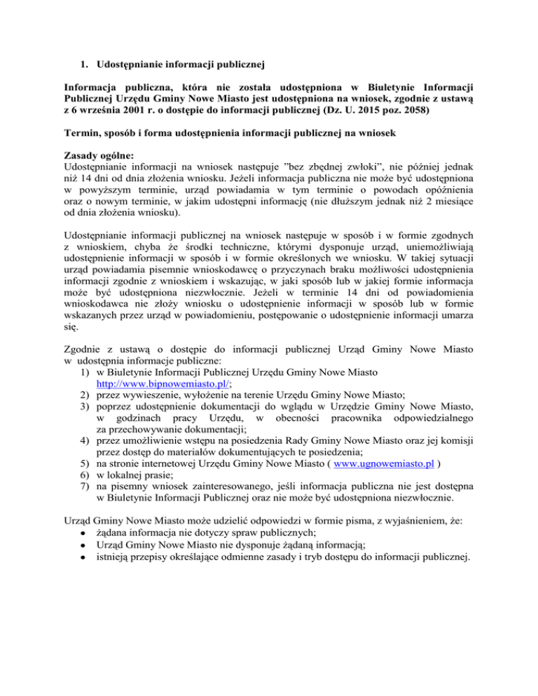1. Udostępnianie informacji publicznej Informacja publiczna, która nie została udostępniona w Biuletynie Informacji Publicznej Urzędu Gminy Nowe Miasto jest udostępniona na wniosek, zgodnie z ustawą z 6 września 2001 r. o dostępie do informacji publicznej (Dz. U. 2015 poz. 2058) Termin, sposób i forma udostępnienia informacji publicznej na wniosek Zasady ogólne: Udostępnianie informacji na wniosek następuje ”bez zbędnej zwłoki”, nie później jednak niż 14 dni od dnia złożenia wniosku. Jeżeli informacja publiczna nie może być udostępniona w powyższym terminie, urząd powiadamia w tym terminie o powodach opóźnienia oraz o nowym terminie, w jakim udostępni informację (nie dłuższym jednak niż 2 miesiące od dnia złożenia wniosku). Udostępnianie informacji publicznej na wniosek następuje w sposób i w formie zgodnych z wnioskiem, chyba że środki techniczne, którymi dysponuje urząd, uniemożliwiają udostępnienie informacji w sposób i w formie określonych we wniosku. W takiej sytuacji urząd powiadamia pisemnie wnioskodawcę o przyczynach braku możliwości udostępnienia informacji zgodnie z wnioskiem i wskazując, w jaki sposób lub w jakiej formie informacja może być udostępniona niezwłocznie. Jeżeli w terminie 14 dni od powiadomienia wnioskodawca nie złoży wniosku o udostępnienie informacji w sposób lub w formie wskazanych przez urząd w powiadomieniu, postępowanie o udostępnienie informacji umarza się. Zgodnie z ustawą o dostępie do informacji publicznej Urząd Gminy Nowe Miasto w udostępnia informacje publiczne: 1) w Biuletynie Informacji Publicznej Urzędu Gminy Nowe Miasto http://www.bipnowemiasto.pl/; 2) przez wywieszenie, wyłożenie na terenie Urzędu Gminy Nowe Miasto; 3) poprzez udostępnienie dokumentacji do wglądu w Urzędzie Gminy Nowe Miasto, w godzinach pracy Urzędu, w obecności pracownika odpowiedzialnego za przechowywanie dokumentacji; 4) przez umożliwienie wstępu na posiedzenia Rady Gminy Nowe Miasto oraz jej komisji przez dostęp do materiałów dokumentujących te posiedzenia; 5) na stronie internetowej Urzędu Gminy Nowe Miasto ( www.ugnowemiasto.pl ) 6) w lokalnej prasie; 7) na pisemny wniosek zainteresowanego, jeśli informacja publiczna nie jest dostępna w Biuletynie Informacji Publicznej oraz nie może być udostępniona niezwłocznie. Urząd Gminy Nowe Miasto może udzielić odpowiedzi w formie pisma, z wyjaśnieniem, że: żądana informacja nie dotyczy spraw publicznych; Urząd Gminy Nowe Miasto nie dysponuje żądaną informacją; istnieją przepisy określające odmienne zasady i tryb dostępu do informacji publicznej. Jak dostarczyć wniosek: Wniosek o udzielenie informacji publicznej można przekazać do Urzędu Gminy Nowe Miasto w jeden z niżej wymienionych sposobów: przesłać pocztą na adres: Urząd Gminy Nowe Miasto, ul. Apteczna 8, 09-120 Nowe Miasto; złożyć osobiście w sekretariacie Urzędu Gminy Nowe Miasto; przesłać na numer fax.: 23 661 49 23 przesłać pocztą elektroniczną na adres e-mail: [email protected] Wniosek o informację publiczną powinien zawierać podstawę prawną. Każdy pracownik Urzędu Gminy jest zobowiązany i odpowiedzialny za udostępnianie informacji publicznej. Granicę ujawniania informacji określa art. 5 ustawy o dostępie do informacji publicznej, który ogranicza możliwość udostępniania informacji ze względu na przepisy o ochronie informacji niejawnych oraz o ochronie tajemnic ustawowo chronionych (ust. 1), a także ze względu na prywatność osoby fizycznej lub tajemnicy przedsiębiorcy (ust. 2). Rejestr wniosków o dostęp do informacji publicznej prowadzony jest w formie papierowej w sekretariacie Urzędu Gminy. Opłaty: Dostęp do informacji publicznej jest bezpłatny z wyjątkiem sytuacji, gdy w wyniku udostępnienia informacji publicznej na wniosek urząd ma ponieść dodatkowe koszty związane ze wskazanym we wniosku sposobem udostępnienia lub koniecznością przekształcenia informacji w formę wskazaną we wniosku. Wówczas urząd może pobrać od wnioskodawcy opłatę w wysokości odpowiadającej tym kosztom. W takim przypadku urząd, w terminie 14 dni od dnia złożenia wniosku, powiadomi wnioskodawcę o wysokości opłaty. Udostępnienie informacji zgodnie z wnioskiem następuje po upływie 14 dni od dnia powiadomienia wnioskodawcy, chyba że wnioskodawca dokona w tym terminie zmiany wniosku w zakresie sposobu lub formy udostępnienia informacji albo wycofa wniosek. Tryb odwoławczy: Odmowa udostępnienia informacji publicznej oraz umorzenie postępowania o udostępnienie informacji następują w drodze decyzji Wójta Gminy Nowe Miasto, na którą przysługuje odwołanie do Samorządowego Kolegium Odwoławczego w Ciechanowie.
