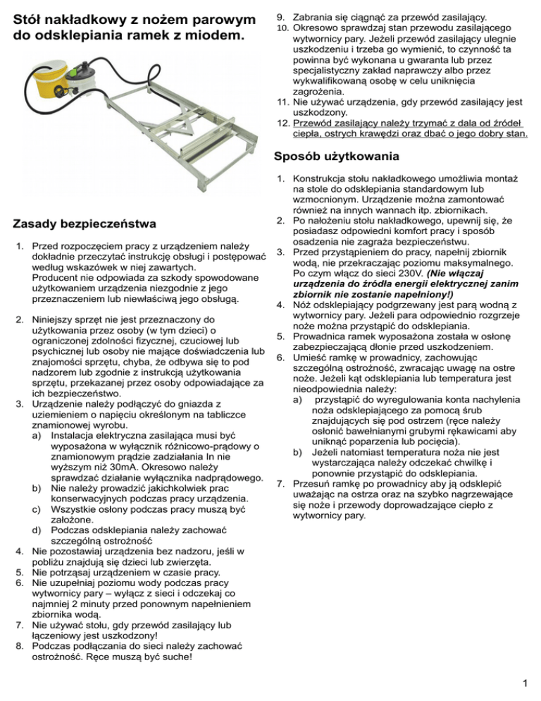 Stół nakładkowy z nożem parowym do odsklepiania ramek z miodem. 9. Zabrania się ciągnąć za przewód zasilający. 10. Okresowo sprawdzaj stan przewodu zasilającego wytwornicy pary. Jeżeli przewód zasilający ulegnie uszkodzeniu i trzeba go wymienić, to czynność ta powinna być wykonana u gwaranta lub przez specjalistyczny zakład naprawczy albo przez wykwalifikowaną osobę w celu uniknięcia zagrożenia. 11. Nie używać urządzenia, gdy przewód zasilający jest uszkodzony. 12. Przewód zasilający należy trzymać z dala od źródeł ciepła, ostrych krawędzi oraz dbać o jego dobry stan. Sposób użytkowania Zasady bezpieczeństwa 1. Przed rozpoczęciem pracy z urządzeniem należy dokładnie przeczytać instrukcję obsługi i postępować według wskazówek w niej zawartych. Producent nie odpowiada za szkody spowodowane użytkowaniem urządzenia niezgodnie z jego przeznaczeniem lub niewłaściwą jego obsługą. 2. Niniejszy sprzęt nie jest przeznaczony do użytkowania przez osoby (w tym dzieci) o ograniczonej zdolności fizycznej, czuciowej lub psychicznej lub osoby nie mające doświadczenia lub znajomości sprzętu, chyba, że odbywa się to pod nadzorem lub zgodnie z instrukcją użytkowania sprzętu, przekazanej przez osoby odpowiadające za ich bezpieczeństwo. 3. Urządzenie należy podłączyć do gniazda z uziemieniem o napięciu określonym na tabliczce znamionowej wyrobu. a) Instalacja elektryczna zasilająca musi być wyposażona w wyłącznik różnicowo-prądowy o znamionowym prądzie zadziałania In nie wyższym niż 30mA. Okresowo należy sprawdzać działanie wyłącznika nadprądowego. b) Nie należy prowadzić jakichkolwiek prac konserwacyjnych podczas pracy urządzenia. c) Wszystkie osłony podczas pracy muszą być założone. d) Podczas odsklepiania należy zachować szczególną ostrożność 4. Nie pozostawiaj urządzenia bez nadzoru, jeśli w pobliżu znajdują się dzieci lub zwierzęta. 5. Nie potrząsaj urządzeniem w czasie pracy. 6. Nie uzupełniaj poziomu wody podczas pracy wytwornicy pary – wyłącz z sieci i odczekaj co najmniej 2 minuty przed ponownym napełnieniem zbiornika wodą. 7. Nie używać stołu, gdy przewód zasilający lub łączeniowy jest uszkodzony! 8. Podczas podłączania do sieci należy zachować ostrożność. Ręce muszą być suche! 1. Konstrukcja stołu nakładkowego umożliwia montaż na stole do odsklepiania standardowym lub wzmocnionym. Urządzenie można zamontować również na innych wannach itp. zbiornikach. 2. Po nałożeniu stołu nakładkowego, upewnij się, że posiadasz odpowiedni komfort pracy i sposób osadzenia nie zagraża bezpieczeństwu. 3. Przed przystąpieniem do pracy, napełnij zbiornik wodą, nie przekraczając poziomu maksymalnego. Po czym włącz do sieci 230V. (Nie włączaj urządzenia do źródła energii elektrycznej zanim zbiornik nie zostanie napełniony!) 4. Nóż odsklepiający podgrzewany jest parą wodną z wytwornicy pary. Jeżeli para odpowiednio rozgrzeje noże można przystąpić do odsklepiania. 5. Prowadnica ramek wyposażona została w osłonę zabezpieczającą dłonie przed uszkodzeniem. 6. Umieść ramkę w prowadnicy, zachowując szczególną ostrożność, zwracając uwagę na ostre noże. Jeżeli kąt odsklepiania lub temperatura jest nieodpowiednia należy: a) przystąpić do wyregulowania konta nachylenia noża odsklepiającego za pomocą śrub znajdujących się pod ostrzem (ręce należy osłonić bawełnianymi grubymi rękawicami aby uniknąć poparzenia lub pocięcia). b) Jeżeli natomiast temperatura noża nie jest wystarczająca należy odczekać chwilkę i ponownie przystąpić do odsklepiania. 7. Przesuń ramkę po prowadnicy aby ją odsklepić uważając na ostrza oraz na szybko nagrzewające się noże i przewody doprowadzające ciepło z wytwornicy pary. 1 Uwaga! Stół posiada ostre krawędzie. Przechowywać z dala od dzieci dobrze osłonięte. Zachowaj szczególną ostrożność, ostrza noży są bardzo ostre i szybko się nagrzewają. Urządzenie zrobione jest z nierdzewnej, kwasoodpornej stali. Stół dostępny w opcji 1000mm lub 1500mm. Śruby do regulacji noża odsklepiającego pod spodem noża Konserwacja 1. Przed przystąpieniem do konserwacji należy koniecznie odłączyć urządzenie z sieci!!! 2. Stół należy umyć za pomocą środków myjących przeznaczonych od kontaktu z żywnością. 3. Po umyciu osuszamy zabezpieczamy i przechowujemy w suchym pomieszczeniu 2