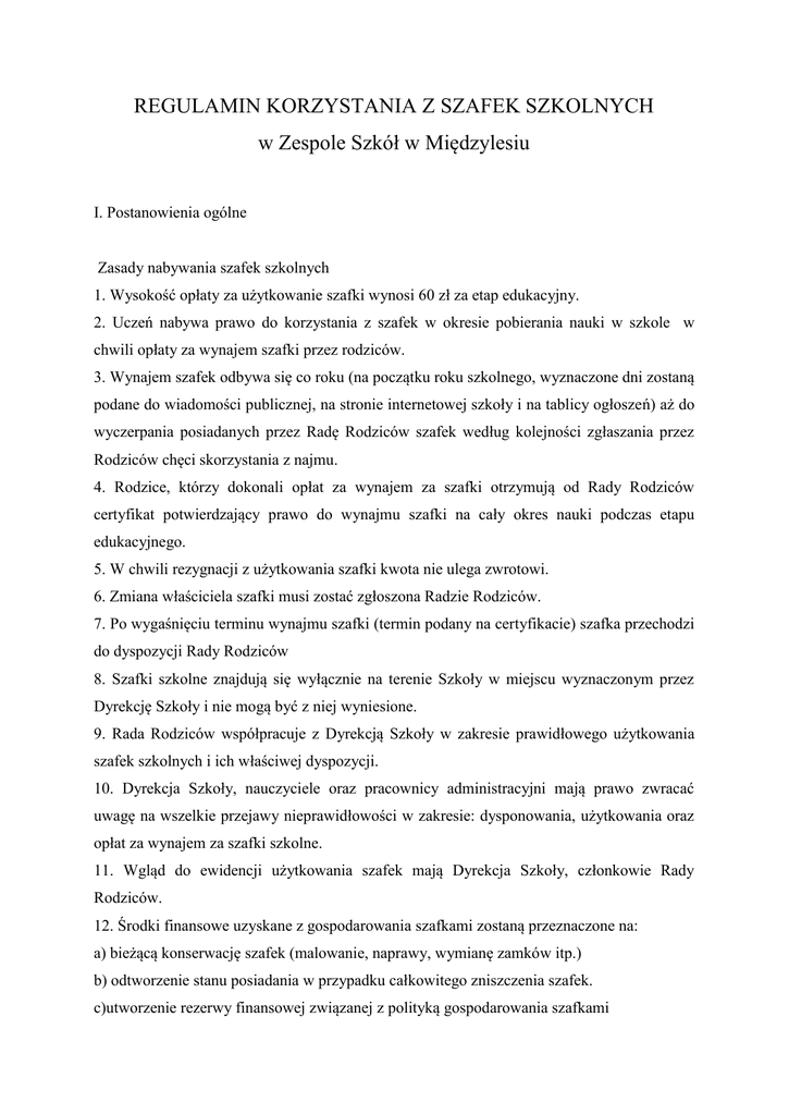 REGULAMIN KORZYSTANIA Z SZAFEK SZKOLNYCH w Zespole Szkół w Międzylesiu I. Postanowienia ogólne Zasady nabywania szafek szkolnych 1. Wysokość opłaty za użytkowanie szafki wynosi 60 zł za etap edukacyjny. 2. Uczeń nabywa prawo do korzystania z szafek w okresie pobierania nauki w szkole w chwili opłaty za wynajem szafki przez rodziców. 3. Wynajem szafek odbywa się co roku (na początku roku szkolnego, wyznaczone dni zostaną podane do wiadomości publicznej, na stronie internetowej szkoły i na tablicy ogłoszeń) aż do wyczerpania posiadanych przez Radę Rodziców szafek według kolejności zgłaszania przez Rodziców chęci skorzystania z najmu. 4. Rodzice, którzy dokonali opłat za wynajem za szafki otrzymują od Rady Rodziców certyfikat potwierdzający prawo do wynajmu szafki na cały okres nauki podczas etapu edukacyjnego. 5. W chwili rezygnacji z użytkowania szafki kwota nie ulega zwrotowi. 6. Zmiana właściciela szafki musi zostać zgłoszona Radzie Rodziców. 7. Po wygaśnięciu terminu wynajmu szafki (termin podany na certyfikacie) szafka przechodzi do dyspozycji Rady Rodziców 8. Szafki szkolne znajdują się wyłącznie na terenie Szkoły w miejscu wyznaczonym przez Dyrekcję Szkoły i nie mogą być z niej wyniesione. 9. Rada Rodziców współpracuje z Dyrekcją Szkoły w zakresie prawidłowego użytkowania szafek szkolnych i ich właściwej dyspozycji. 10. Dyrekcja Szkoły, nauczyciele oraz pracownicy administracyjni mają prawo zwracać uwagę na wszelkie przejawy nieprawidłowości w zakresie: dysponowania, użytkowania oraz opłat za wynajem za szafki szkolne. 11. Wgląd do ewidencji użytkowania szafek mają Dyrekcja Szkoły, członkowie Rady Rodziców. 12. Środki finansowe uzyskane z gospodarowania szafkami zostaną przeznaczone na: a) bieżącą konserwację szafek (malowanie, naprawy, wymianę zamków itp.) b) odtworzenie stanu posiadania w przypadku całkowitego zniszczenia szafek. c)utworzenie rezerwy finansowej związanej z polityką gospodarowania szafkami 13. Szafek nie wolno odsprzedawać innym osobom. 14. Dopuszcza się korzystanie z jednej szafki przez 2 uczniów na wniosek ich rodziców. 15. Szafki szkolne służą uczniom do przechowywania stroju na w-f oraz innych przedmiotów związanych z funkcjonowaniem ucznia w szkole( książki, bloki, kredki itp.). 16. Uczeń, który otrzymał szafkę szkolną zobowiązany jest do jej należytego użytkowania i poszanowania. 17. Uczniowie korzystający z szafek zobowiązani są znać i stosować postanowienia niniejszego Regulaminu. 18. Kolejne dziecko przejmuje szafkę po starszym rodzeństwie, czyli rodzice wynajmując szafkę płacą tylko raz. II. Obowiązki użytkowników szafek 1. Użytkownik szafki ponosi odpowiedzialność za jej zawartość. 2. Uczniowie mają obowiązek utrzymywać szafki w czystości. 3. Niedopuszczalne jest przechowywanie w szafkach szkolnych substancji chemicznych, np. wytwarzających nieprzyjemne zapachy, żrących, itp. 4. Zabrania się dokonywać wewnątrz i na zewnątrz szafki napisów, rysunków, przyklejania plakatów, zdjęć. 5. Uczeń nie może udostępniać przydzielonej szafki innym uczniom, a także zamieniać się z nimi na szafki. 6. Ewentualne kradzieże mienia oraz wszelkie uszkodzenia szafki powinny być natychmiast zgłaszane przez ucznia wychowawcy, a w przypadku jego nieobecności Dyrekcji. 7. Sprawca umyślnego uszkodzenia lub zniszczenia szkolnej szafki ponosi całkowity koszt związany z jej naprawą lub zakupem nowej. 8. Uczeń nie powinien przechowywać w szafce: przedmiotów szklanych, niezjedzonych kanapek i innej żywności, napojów z niezabezpieczonym zamknięciem, brudnej odzieży. 9. Pod koniec roku szkolnego uczeń zobowiązany jest, przed oddaniem klucza wychowawcy do opróżnienia szafki. III. Klucze i zasady ich użytkowania 1. Uczeń otrzymuje klucz do szafki, który podlega zwrotowi przed zakończeniem roku szkolnego. Zwrotu dokonuje się na ręce wychowawcy. 2. Uczniowie kontynuujący naukę w szkole ponownie otrzymują klucz do szafki po rozpoczęciu roku szkolnego. Regulamin zatwierdzono po konsultacjach z Radą Rodziców, Radą Pedagogiczną w dniu 18.02.2015r. Wchodzi w życie z dniem podpisania. Dyrektor Przewodniczący Rady Rodziców