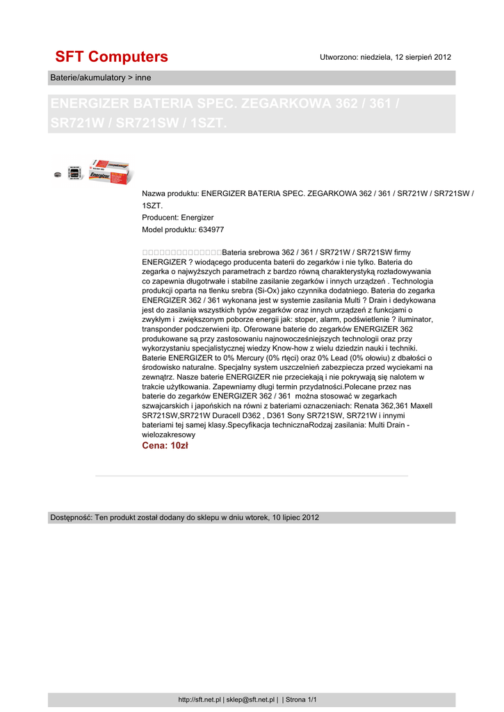 SFT Computers Utworzono: niedziela, 12 sierpień 2012 Baterie/akumulatory > inne ENERGIZER BATERIA SPEC. ZEGARKOWA 362 / 361 / SR721W / SR721SW / 1SZT. Nazwa produktu: ENERGIZER BATERIA SPEC. ZEGARKOWA 362 / 361 / SR721W / SR721SW / 1SZT. Producent: Energizer Model produktu: 634977 Bateria srebrowa 362 / 361 / SR721W / SR721SW firmy ENERGIZER ? wiodącego producenta baterii do zegarków i nie tylko. Bateria do zegarka o najwyższych parametrach z bardzo równą charakterystyką rozładowywania co zapewnia długotrwałe i stabilne zasilanie zegarków i innych urządzeń . Technologia produkcji oparta na tlenku srebra (Si-Ox) jako czynnika dodatniego. Bateria do zegarka ENERGIZER 362 / 361 wykonana jest w systemie zasilania Multi ? Drain i dedykowana jest do zasilania wszystkich typów zegarków oraz innych urządzeń z funkcjami o zwykłym i zwiększonym poborze energii jak: stoper, alarm, podświetlenie ? iluminator, transponder podczerwieni itp. Oferowane baterie do zegarków ENERGIZER 362 produkowane są przy zastosowaniu najnowocześniejszych technologii oraz przy wykorzystaniu specjalistycznej wiedzy Know-how z wielu dziedzin nauki i techniki. Baterie ENERGIZER to 0% Mercury (0% rtęci) oraz 0% Lead (0% ołowiu) z dbałości o środowisko naturalne. Specjalny system uszczelnień zabezpiecza przed wyciekami na zewnątrz. Nasze baterie ENERGIZER nie przeciekają i nie pokrywają się nalotem w trakcie użytkowania. Zapewniamy długi termin przydatności.Polecane przez nas baterie do zegarków ENERGIZER 362 / 361 można stosować w zegarkach szwajcarskich i japońskich na równi z bateriami oznaczeniach: Renata 362,361 Maxell SR721SW,SR721W Duracell D362 , D361 Sony SR721SW, SR721W i innymi bateriami tej samej klasy.Specyfikacja technicznaRodzaj zasilania: Multi Drain wielozakresowy Cena: 10zł Dostępność: Ten produkt został dodany do sklepu w dniu wtorek, 10 lipiec 2012 http://sft.net.pl | [email protected] | | Strona 1/1
