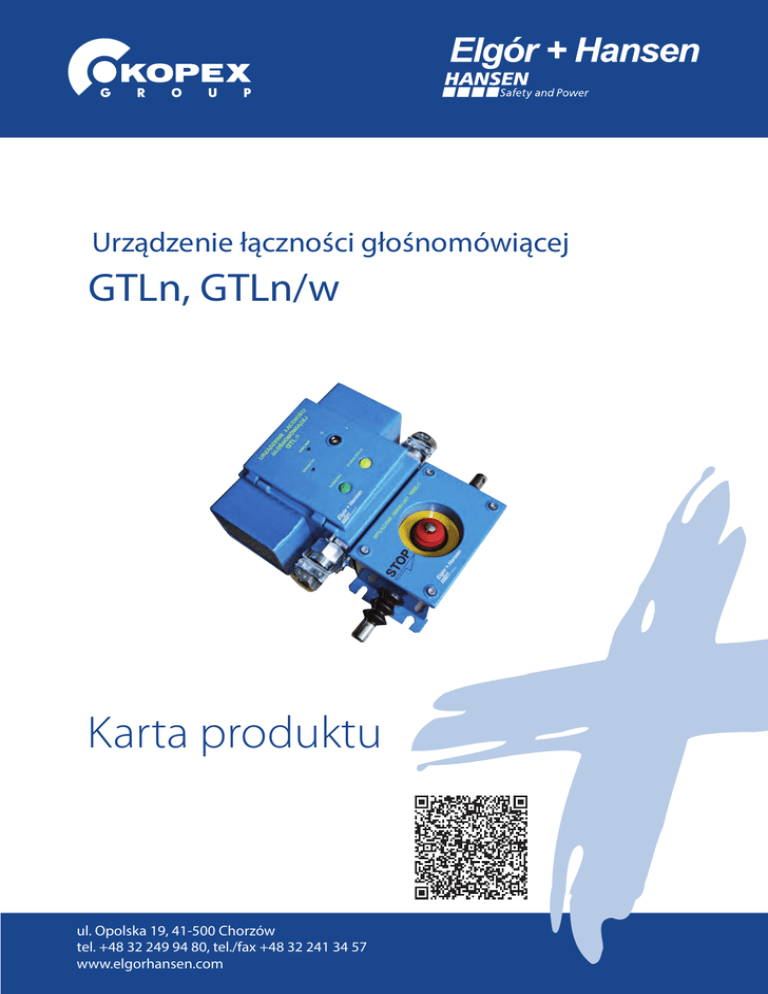 Urządzenie łączności głośnomówiącej GTLn, GTLn/w Karta produktu ul. Opolska 19, 41-500 Chorzów tel. +48 32 249 94 80, tel./fax +48 32 241 34 57 www.elgorhansen.com CECHY CHARAKTERYSTYCZNE Urządzenie GTLn służy do prowadzenia łączności głośnomówiącej oraz do emitowania sygnałów ostrzegawczych i porozumiewawczych wzdłuż zautomatyzowanych tras przenośników taśmowych, zgrzebłowych, kolejek szynowych, podwieszonych i spągowych, kłowrotów itp. Przystosowane jest do współpracy z układami automatyzacji przenośników (np. USPP) oraz układami sterowania kolejkami podwieszonymi głównie w podziemiach kopalń metanowych. Urządzenie GTLn, GTLn/w jest zaliczany do urządzeń elektrycznych grupy I. Przy zasilaniu z sieciowych zasilaczy iskrobezpiecznych posiada kategorię M@, a po wyłączeniu zasilacza sieciowego staje się urządzeniem kategorii M1. Ponadto urządzenie GTLn/w posiada zintegrowany wyłącznik linkowy typu WAR-1 z możliwością zabudowy nadajnika identyfikacji, umożliwiający awaryjne zatrzymanie napędu urządzenia z opcjonalną możliwością identyfikacji miejsca zadziałania blokady. Dzięki kompatybilności linii sygnałowych „0”, „a”, „c” i „d”, urządzenie GTLn zastępuje dotychczasowe systemy GTL-4k, GTL-5, GTL-5s, GTL-iz(/L), GTL-im oraz GTL i GTLw przy zachowaniu warunków stosowania zawartych w dopuszczeniu poszczególnych systemów łączności. BUDOWA Urządzenie GTLn posiada obudowę stalową, na której bokach umieszczono obudowane głośniki przemysłowe o dużej skuteczności oraz wpusty kablowe. Wpusty kablowe służą do zadławienia kabla dopuszczonego typu, łączącego poszczególne urządzenia GTLn (GTLn/w). W wersji GTLn/w do dolnej części obudowy za pomocą śrub jest zamocowany wyłącznik linkowy WAR-1. Wewnątrz obudowy znajduje się moduł zawierający układy elektroniczne i akumulatory oraz listwa zaciskowa do podłączenia kabla 16-żyłowego. Oprócz zacisków wykorzystywanych w łączności głośnomówiącej jest możliwość przyłączenia obwodów bezpieczeństwa i sterowania. Zaciski WA+ i WA- służą do przyłączenia linii blokady w obwodach sterowania, są one na stałe połączone ze stykiem normalnie zwartym wyłącznika WAR- oraz normalnie otwartym stykiem przekaźnika kontroli sprawności PSK. Styki tego przekaźnika zostają rozwarte, gdy nastąpi: • brak napięcia zasilania z zasilacza magistralnego, • n ieprawidłowe napiecie zasilajace układy elektroniczne, • u szkodzenie elementów odpowiedzialnych za generowanie sygnałów rozruchowych, • uszkodzenie głośnikówp • przerwanie obwodów linii c. Zaciski ID+ oraz ID- służą do przyłączenia linii identyfikacji blokad. Miejsce i zaciski do przyłączenia nadajników znajdują się w komorze wyłącznika WAR-1. Dodatkowo istnieją dwie pary styków (CT+, CT-, ZAL+, ZAL-). Można podłączyć do nich obwody max 30 V. W obwodach sterowania przenośników taśmowych można do nich podłączyć czujnik temperatury bębna na zwrotni bezpośrednio do systemu USPP oraz wyprowadzić obwód sterowania uruchomienia następnego przenośnika w ciągu sterowania. Obudowa wyłącznika, zamknięta z czoła pokrywą z osadzonym w niej przyciskiem, posiada z obu stron cięgna zakończone otworami służącymi do mocowania linek. Wejścia cięgien do jej wnętrza chronione są przed pyłem i wilgocią gumowymi mieszkami. Wszystkie obwody wyłącznika WAR-1 wyprowadzone są na listwę zaciskową urządzenia GTLn/w. Na otwieranej płycie czołowej znajdują się przyciski ROZMOWA i SYGNALIZACJA, dioda kontroli napięcia zasilania, mikrofon oraz zatrzask zamka. Na wewnętrznej części pokrywy umieszczono potencjometr do regulacji amplitudy sygnału z mikrofonu, aby wyeliminować niepożądane sprzężenia podczas prowadzenia rozmów. CECHA BUDOWY PRZECIWWYBUCHOWEJ I M1/M2 Ex ia/ib I Ma/Mb Certyfikat badania typu WE: KDB 06 ATEX 072 www.elgorhansen.com Urządzenie łączności głośnomówiącej GTLn, GTLn/w DANE TECHNICZNE Typ GTLn, GTLn/w Napięcie zasilania 12,0V ÷ 15,0 V - DC Prąd pobierany z zasilacza max 65mA Maksymalna moc wyjściowa elektryczna ≥ 800mW Maksymalne napięcia iskrobezpieczne w linii: linia „d” ≤8,6VDC linia „a” i „c” ≤5Vss Częstotliwość sygnału porozumiewawczego Natężenie dźwięku dla sygnału ostrzegawczego oraz porozumiewawczego Maksymalny czas pracy po wyłączeniu napięcia zasilającego 600Hz 20% > 90 dB w odl. 1m ≥ 8 h przy stosunku czasu rozmowy do przerwy 1 ÷ 6 Rodzaj akumulatorów 4 ogniwa 1,2 V - 0,9Ah Maksymalny prąd rozładowania akumulatorów w stanie oczekiwania na działanie przy braku napięcia zasilającego ≤ 35µA Ilość urządzeń GTLn dołączona do linii a max. 60szt. Ilość urządzeń GTLn dołączona do linii c, d max. 40szt. Zakres temperatur pracy -5°C ÷ 40°C Stopień ochrony obudowy IP 54 Wymiary zewnętrzne (GTLn) 290 x 230 x 135mm Wymiary zewnętrzne (GTLn/w) 354 x 330 x 135mm Masa (GTLn)/ (GTL/w) 6,8 kg / 10,8kg Napięcie maksymalne przyłączone do zacisków 30VAC/DC WAR-1 Siła załączania - cięgna 80 ÷ 120N Siła załączania i wyłączania przełącznik dłoniowy 25 ÷ 60N ul. Opolska 19, 41-500 Chorzów tel. +48 32 249 94 80, tel./fax +48 32 241 34 57 www.elgorhansen.com Urządzenie łączności głośnomówiącej GTLn, GTLn/w SCHEMAT URZĄDZENIA ul. Grabowa 1, 40-172 Katowice tel. +48 32 604 70 00, tel./fax +48 32 604 71 00 www.kopex.com.pl