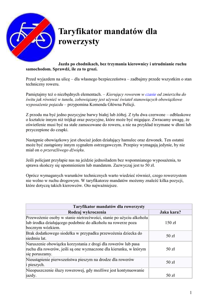 Taryfikator mandatów dla rowerzysty Jazda po chodnikach, bez trzymania kierownicy i utrudnianie ruchu samochodom. Sprawdź, ile za to grozi. Przed wyjazdem na ulicę – dla własnego bezpieczeństwa – zadbajmy przede wszystkim o stan techniczny roweru. Pamiętajmy też o niezbędnych elementach. – Kierujący rowerem w czasie od zmierzchu do świtu jak również w tunelu, zobowiązany jest używać świateł stanowiących obowiązkowe wyposażenie pojazdu – przypomina Komenda Główna Policji. Z przodu ma być jedno pozycyjne barwy białej lub żółtej. Z tyłu dwa czerwone – odblaskowe o kształcie innym niż trójkąt oraz pozycyjne, które może być migające. Zwracamy uwagę, że oświetlenie musi być na stałe zamocowane do roweru, a nie na przykład trzymane w dłoni lub przyczepione do czapki. Następnie obowiązkowy jest chociaż jeden działający hamulec oraz dzwonek. Ten ostatni może być zastąpiony innym sygnałem ostrzegawczym. Przepisy wymagają jedynie, by nie miał on o przeraźliwego dźwięku. Jeśli policjant przyłapie nas na jeździe jednośladem bez wspomnianego wyposażenia, to sprawa skończy się upomnieniem lub mandatem. Zazwyczaj jest to 50 zł. Oprócz wymaganych warunków technicznych warto wiedzieć również, czego rowerzystom nie wolno w ruchu drogowym. W taryfikatorze mandatów możemy znaleźć kilka pozycji, które dotyczą takich kierowców. Oto najważniejsze. Taryfikator mandatów dla rowerzysty Rodzaj wykroczenia Przewożenie osoby w stanie nietrzeźwości, stanie po użyciu alkoholu lub środka działającego podobnie do alkoholu na rowerze poza bocznym wózkiem. Brak dodatkowego siodełka w przypadku przewożenia dziecka do siedmiu lat. Naruszenie obowiązku korzystania z drogi dla rowerów lub pasa ruchu dla rowerów, jeśli są one wyznaczone dla kierunku, w którym się poruszamy. Nieustąpienie pierwszeństwa pieszym na drodze dla rowerów i pieszych. Nieopuszczenie śluzy rowerowej, gdy możliwe jest kontynuowanie jazdy. Jaka kara? 150 zł 50 zł 50 zł 50 zł 50 zł 1 Utrudnianie poruszania się innym uczestnikom ruchu, gdy jedziemy po jezdni obok innego roweru. Jazda bez trzymania co najmniej jednej ręki na kierownicy oraz nóg na pedałach lub podnóżkach. Naruszenie zakazu czepiania się pojazdów. Jazda chodnikiem dla pieszych, gdy jest to zabronione. Przejazd na czerwonym świetle Wyjeżdżanie na przejeździe dla rowerzystów bezpośrednio pod jadący pojazd Korzystanie podczas jazdy z telefonu wymagające trzymania słuchawki lub mikrofonu w ręku przez kierującego pojazdem w tym rowerem Nieustąpienie przez kierującego pojazdem pierwszeństwa pieszym przy przejeżdżaniu przez chodnik lub drogę dla pieszych albo podczas jazdy po placu, na którym ruch pieszych i pojazdów odbywa się po tej samej powierzchni Zajmowanie więcej niż jednego, wyznaczonego na jezdni, pasa ruchu Hamowanie w sposób powodujący zagrożenie bezpieczeństwa ruchu lub jego utrudnienie Utrudnianie lub tamowanie ruchu Niezatrzymanie się przed znakiem STOP Brak niezbędnego wyposażenia roweru (światła przednie - w kolorze białym lub żółtym niepulsujące, tylne w kolorze czerwonym, brak hamulców lub brak sprawnych hamulców) 200 zł 50 zł 100 zł 50 zł 100 zł 150 zł 200 zł 350 zł 150 zł 100- 300 zł 100 – 300 zł 100 zł 20- 500 zł Źródło: www.mmlodz.pl 2