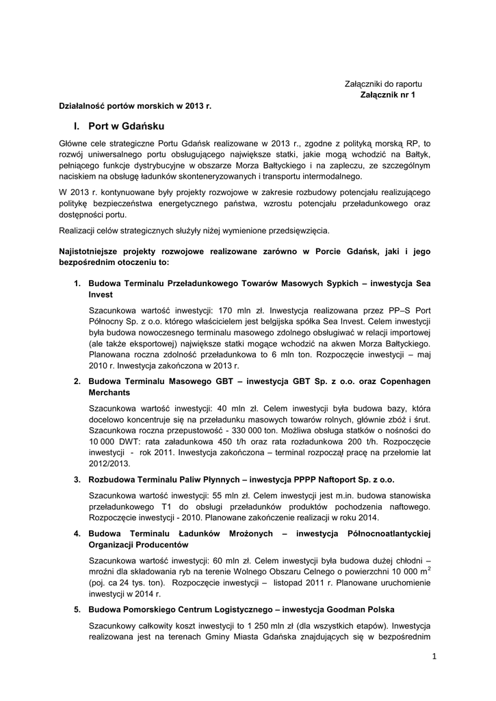 Załączniki do raportu Załącznik nr 1 Działalność portów morskich w 2013 r. I. Port w Gdańsku Główne cele strategiczne Portu Gdańsk realizowane w 2013 r., zgodne z polityką morską RP, to rozwój uniwersalnego portu obsługującego największe statki, jakie mogą wchodzić na Bałtyk, pełniącego funkcje dystrybucyjne w obszarze Morza Bałtyckiego i na zapleczu, ze szczególnym naciskiem na obsługę ładunków skonteneryzowanych i transportu intermodalnego. W 2013 r. kontynuowane były projekty rozwojowe w zakresie rozbudowy potencjału realizującego politykę bezpieczeństwa energetycznego państwa, wzrostu potencjału przeładunkowego oraz dostępności portu. Realizacji celów strategicznych służyły niżej wymienione przedsięwzięcia. Najistotniejsze projekty rozwojowe realizowane zarówno w Porcie Gdańsk, jaki i jego bezpośrednim otoczeniu to: 1. Budowa Terminalu Przeładunkowego Towarów Masowych Sypkich – inwestycja Sea Invest Szacunkowa wartość inwestycji: 170 mln zł. Inwestycja realizowana przez PP–S Port Północny Sp. z o.o. którego właścicielem jest belgijska spółka Sea Invest. Celem inwestycji była budowa nowoczesnego terminalu masowego zdolnego obsługiwać w relacji importowej (ale także eksportowej) największe statki mogące wchodzić na akwen Morza Bałtyckiego. Planowana roczna zdolność przeładunkowa to 6 mln ton. Rozpoczęcie inwestycji – maj 2010 r. Inwestycja zakończona w 2013 r. 2. Budowa Terminalu Masowego GBT – inwestycja GBT Sp. z o.o. oraz Copenhagen Merchants Szacunkowa wartość inwestycji: 40 mln zł. Celem inwestycji była budowa bazy, która docelowo koncentruje się na przeładunku masowych towarów rolnych, głównie zbóż i śrut. Szacunkowa roczna przepustowość - 330 000 ton. Możliwa obsługa statków o nośności do 10 000 DWT: rata załadunkowa 450 t/h oraz rata rozładunkowa 200 t/h. Rozpoczęcie inwestycji - rok 2011. Inwestycja zakończona – terminal rozpoczął pracę na przełomie lat 2012/2013. 3. Rozbudowa Terminalu Paliw Płynnych – inwestycja PPPP Naftoport Sp. z o.o. Szacunkowa wartość inwestycji: 55 mln zł. Celem inwestycji jest m.in. budowa stanowiska przeładunkowego T1 do obsługi przeładunków produktów pochodzenia naftowego. Rozpoczęcie inwestycji - 2010. Planowane zakończenie realizacji w roku 2014. 4. Budowa Terminalu Ładunków Organizacji Producentów Mrożonych – inwestycja Północnoatlantyckiej Szacunkowa wartość inwestycji: 60 mln zł. Celem inwestycji była budowa dużej chłodni – 2 mroźni dla składowania ryb na terenie Wolnego Obszaru Celnego o powierzchni 10 000 m (poj. ca 24 tys. ton). Rozpoczęcie inwestycji – listopad 2011 r. Planowane uruchomienie inwestycji w 2014 r. 5. Budowa Pomorskiego Centrum Logistycznego – inwestycja Goodman Polska Szacunkowy całkowity koszt inwestycji to 1 250 mln zł (dla wszystkich etapów). Inwestycja realizowana jest na terenach Gminy Miasta Gdańska znajdujących się w bezpośrednim 1 zapleczu Terminalu Kontenerowego DCT. W kwietniu 2013 r. pierwszym klientom 2 powstającego centrum logistycznego udostępniono 14 tys. m powierzchni magazynowej. W pierwszej fazie zakłada się, w miarę pojawiającego się zapotrzebowania, budowę ok. 65 2 tys. m powierzchni magazynowej. Docelowo na przestrzeni kilkunastu lat powierzchnia 2 Pomorskiego Centrum Logistyczne ma zostać powiększona do 500 tys. m w przypadku powierzchni magazynowej oraz 40 tys. w przypadku powierzchni biurowej. 6. Budowa Bazy Składowania Ropy i Produktów Naftowych PERN – inwestycja PERN Przyjaźń S.A. Szacunkowa wartość inwestycji: 700 mln zł. Umowa dzierżawy podpisana w dniu 10 kwietnia 2013 r. W ramach realizacji inwestycji planowana jest budowa, na powierzchni ok. 3 28 ha, 24 zbiorników na ropę i produkty ropopochodne o pojemności ok. 700 tys. m z infrastrukturą techniczną, torami, bocznicą kolejową, rurociągami i budynkami. Terminal Naftowy będzie wyposażony w urządzenia do obsługi kilku rodzajów produktów: różnych gatunków ropy naftowej, oleju napędowego, benzyn, benzyn lotniczych i produktów chemicznych. Od podpisania umowy dzierżawy do chwili obecnej trwają prace projektowe. Planowany termin zakończenia pierwszego etapu inwestycji, umożliwiającego dostawy ropy naftowej, to rok 2015. 7. Rozbudowa terminalu kontenerowego DCT – inwestycja DCT Gdańsk S.A. Szacunkowa wartość inwestycji: 1 050 mln zł. W dniu 19 marca 2013 r. pomiędzy ZMPG S.A. oraz DCT Gdańsk S.A. podpisana została umowa dzierżawy dodatkowych 27 ha terenów portowych przewidzianych do zagospodarowania przez terminal kontenerowy. Celem inwestycji jest zwiększenie zdolności przeładunkowej terminalu do 4 mln TEU rocznie. Zakres inwestycji obejmuje m.in. budowę 600 metrowego odcinka nabrzeża umożliwiającego obsługę największych kontenerowców świata oraz instalację nowoczesnych urządzeń przeładunkowych, tj. siedmiu dźwigów klasy Super–Post–Panamax o wysięgu 25 rzędów kontenerów każdy. Planowane zakończenie inwestycji to rok 2016. Obecnie trwają prace projektowe. 8. Budowa Głębokowodnego Terminalu Uniwersalnego przy południowej stronie Pirsu Rudowego, w tym do przeładunku towarów pochodzenia roślinnego z wyłączeniem ropy i produktów ropopochodnych – inwestycja OT Logistics S.A. Szacunkowa wartość inwestycji: min. 300 mln zł. Celem inwestycji jest budowa na terenie o powierzchni ok. 23,5 ha, głębokowodnego terminalu umożliwiającego m.in. przeładunki zboża, śrut, pasz i biomasy. W dniu 15 maja 2013 r. ZMPG S.A. zakończył postępowanie przetargowe, którego celem było wyłonienie wykonawcy i operatora przyszłego terminalu. Najkorzystniejsza ofertę złożyła spółka OT Logistics S.A. Trwają prace koncepcyjne oraz negocjacje warunków umowy dzierżawy. 9. Budowa Terminalu Produktów Olejowych – inwestycja Noba Poland Real Estate Szacunkowa wartość inwestycji: 30 mln zł. W maju br. ZMPG S.A. rozstr