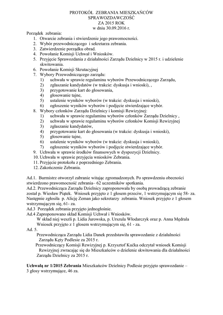 PROTOKÓŁ ZEBRANIA MIESZKAŃCÓW SPRAWOZDAWCZOŚĆ ZA 2015 ROK w dniu 30.09.2016 r. Porządek zebrania: 1. Otwarcie zebrania i stwierdzenie jego prawomocności. 2. Wybór przewodniczącego i sekretarza zebrania. 3. Zatwierdzenie porządku obrad. 4. Powołanie Komisji Uchwał i Wniosków. 5. Przyjęcie Sprawozdania z działalności Zarządu Dzielnicy w 2015 r. i udzielenie skwitowania. 6. Powołanie Komisji Skrutacyjnej 7. Wybory Przewodniczącego zarządu: 1) uchwała w sprawie regulaminu wyborów Przewodniczącego Zarządu, 2) zgłaszanie kandydatów (w trakcie: dyskusja i wnioski), , 3) przygotowanie kart do głosowania, 4) głosowanie tajne, 5) ustalenie wyników wyborów (w trakcie: dyskusja i wnioski), 6) ogłoszenie wyników wyborów i podjęcie stwierdzające wybór. 8. Wybory członków Zarządu Dzielnicy i komisji Rewizyjnej: 1) uchwała w sprawie regulaminu wyborów członków Zarządu Dzielnicy , 2) uchwała w sprawie regulaminu wyborów członków Komisji Rewizyjnej 3) zgłaszanie kandydatów, 4) przygotowanie kart do głosowania (w trakcie: dyskusja i wnioski), 5) głosowanie tajne, 6) ustalenie wyników wyborów (w trakcie: dyskusja i wnioski), 7) ogłoszenie wyników wyborów i podjęcie stwierdzające wybór. 9. Uchwała w sprawie środków finansowych w dyspozycji Dzielnicy. 10. Uchwała w sprawie przyjęcia wniosków Zebrania. 11. Przyjęcie protokołu z poprzedniego Zebrania. 12. Zakończenie Zebrania. Ad.1. Burmistrz otworzył zabranie witając zgromadzonych. Po sprawdzeniu obecności stwierdzono prawomocność zebrania– 62 uczestników spotkania. Ad.2. Przewodnicząca Zarządu Dzielnicy zaproponowała by osobą prowadzącą zebranie został p. Wiesław Piątek. Wniosek przyjęto z 1 głosem przeciw, 1 wstrzymującym się 58- za. Następnie zgłosiła p. Alicję Zeman jako sekretarzy zebrania. Wniosek przyjęto z 1 głosem wstrzymującym się, 61- za. Ad.3 Porządek zebrania przyjęto jednogłośnie. Ad.4 Zaproponowano skład Komisji Uchwał i Wniosków. W skład niej weszli p. Lidia Jurowska, p. Urszula Włodarczyk oraz p. Anna Mędrala Wniosek przyjęto z 1 głosem wstrzymującym się, 61 - za. Ad. 5. Przewodnicząca Zarządu Lidia Danek przedstawiła sprawozdanie z działalności Zarządu Kęty Podlesie za 2015 r. Przewodniczący Komisji Rewizyjnej p. Krzysztof Kućka odczytał wniosek Komisji Rewizyjnej zwracając się do Mieszkańców o dzielenie skwitowania dla działalności Zarządu Dzielnicy za 2015 r. Uchwałą nr 1/2015 Zebrania Mieszkańców Dzielnicy Podlesie przyjęto sprawozdanie – 3 głosy wstrzymujące, 46 za. Ad.6. Następnie przystąpiono do zgłaszania kandydatów do Komisji Skrutacyjnej. W skład w/w Komisji weszli: p. Maciej Hejnowicz, Kasolik Joanna, Bogusław Baścik, Żaneta Górecka, Jakub Nowak 4 głosami wstrzymującymi się i 48 za. Ad.7 W dalszej części spotkania, po odczytaniu Regulaminu wyborów Przewodniczącego Zarządu Dzielnicy wprowadzonego Uchwałą nr 2/2016, przyjętego przy 48 głosach za, bez wstrzymujących się, zwrócono się do uczestników spotkania o podanie kandydatów na przewodniczącego. Zgłoszona została p. Lidia Danek. Komisja przystąpiła do prac związanych z wyborem przewodniczącego. W tym czasie p. Burmistrz informował mieszkańców o zrealizowanych zadaniach na terenie Dzielnicy Podlesie i całej Gminy Kęty – prezentacja w załączeniu. Komisja skrutacyjna po zliczeniu głosów Uchwałą nr 3/2016 Zebrania Mieszkańców Dzielnicy Kęty Podlesie z dnia 30 sierpnia 2016 stwierdza, że w wyniku tajnego głosowania Przewodniczącym Zarządu Dzielnicy została p. Lidia Danek . W wyniku głosowania oddano 54 głosy, w tym 52 ważne, 2 nieważne. Kandydat uzyskał 48 głosów za, 3 przeciw i 1 wstrzymujący się. Ad.8 W punkcie ósmym rozpoczęto prace nad wyborem członków Zarządu Dzielnicy oraz Komisji rewizyjnej. Na wstępie odczytano regulamin (Uchwała nr 4/2016 Zebrania Mieszkańców Dzielnicy Kęty Podlesie z dnia 30.08.2016r.) i przystąpiono do zgłaszania kandydatów. Wśród nich znaleźli się: Wiesław Piątek, Beniamin Goliasz, Tomasz Chowaniec, Anna Mędrala, Alicja Zeman, Jurowska Lida, Urszula Włodarczyk, Mieczysław Mieszczak, Agnieszka Kubica-Potoczny oraz Łukasz Plewniak. Komisja skrutacyjna zajęła się czynnościami związanymi z wyborem członków w/w Komisji. W trakcie tych czynności Burmistrz kontynuował prezentację dotyczącą rozwoju Kęt w 2015 r. Po zakończeniu oddał głos prowadzącemu zebranie, który zaproponował mieszkańcom, aby rozpoczęli zgłaszanie wniosków. p. Tadeusz Surma zgłosił 5 wniosków: - uzupełnić chodnik od p.Kaima do granicy Kóz; - wprowadzić znak „droga wewnętrzna” na ul, Młynek; - wykonać ścieżkę rowerowo-pieszą wzdłuż potoku Leśnówka; - dokonać budowy rowów wzdłuż drogi między domem nr 16 – 18; - zgłosić do Aqua wyciek z sieci wodociągowej przy ul. Młynek 18 Pan Surma w swojej wypowiedzi stwierdził, że Radni nie interesują się ul. Młynek. W tym momencie otrzymał odpowiedź od p. Łukasza Plewniaka, który poinformował mieszkańców, że w roku 2015 wraz z p. Włodarczyk pojawili się tam m.in. w sprawach dotyczących oświetlenia i odwodnienia rowów. p. Jan Wójcik wniósł o: - usunięcie barierek i zasypanie rowów przy ul Żeromskiego. W tym miejscu przerwano rozmowy, bowiem Komisja skrutacyjna zakończyła prace dotyczące wybory członków Zarządu. Przewodniczący Komisji odczytał Uchwałę nr 5/2015 w sprawie stwierdzenia wyboru członków Zarządu Dzielnicy. Oddano 51 głosów, w tym 2 nieważne Zgłoszeni kandydaci uzyskali następującą ilość głosów: Tomasz Chowaniec – 32, Goliasz Beniamin – 33, Jurowska Lidia – 16, Agnieszka Kubica-Potoczny – 11, Mędrala Anna – 25, Mieszczak Mieczysław – 31, Piątek Wiesław- 25, Plewniak Łukasz – 28, Urszula Włodarczyk -34, Zeman Alicja 32. W następnej kadencji Zarządu działać będą: Urszula Włodarczyk, Beniamin Goliasz, Tom