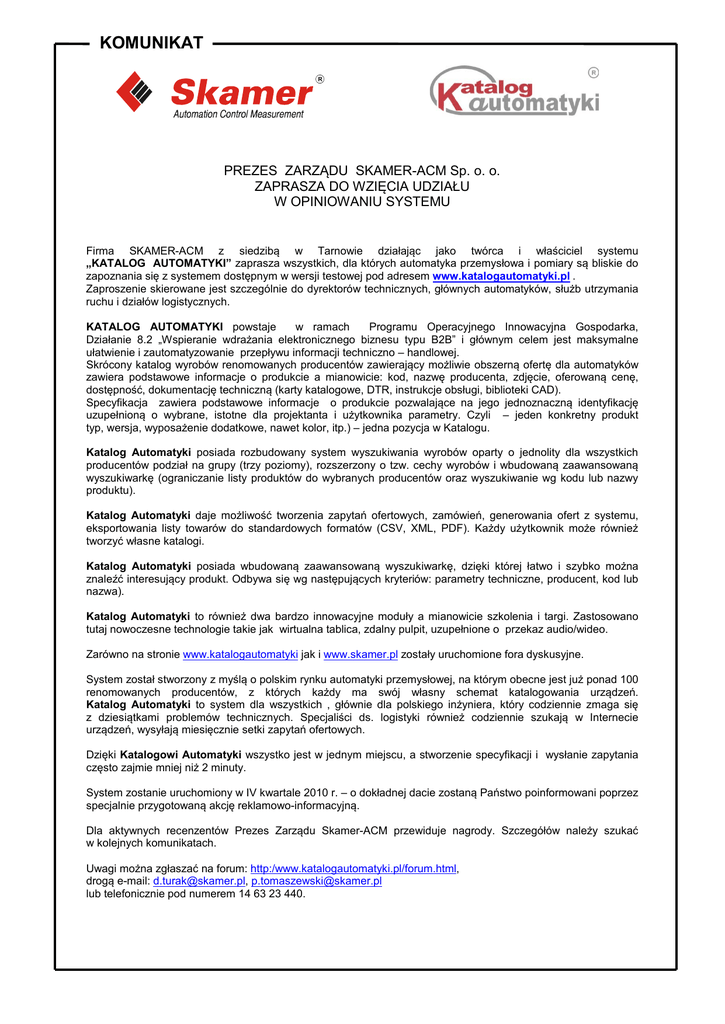 KOMUNIKAT PREZES ZARZĄDU SKAMER-ACM Sp. o. o. ZAPRASZA DO WZIĘCIA UDZIAŁU W OPINIOWANIU SYSTEMU Firma SKAMER-ACM z siedzibą w Tarnowie działając jako twórca i właściciel systemu „KATALOG AUTOMATYKI” zaprasza wszystkich, dla których automatyka przemysłowa i pomiary są bliskie do zapoznania się z systemem dostępnym w wersji testowej pod adresem www.katalogautomatyki.pl . Zaproszenie skierowane jest szczególnie do dyrektorów technicznych, głównych automatyków, służb utrzymania ruchu i działów logistycznych. KATALOG AUTOMATYKI powstaje w ramach Programu Operacyjnego Innowacyjna Gospodarka, Działanie 8.2 „Wspieranie wdrażania elektronicznego biznesu typu B2B” i głównym celem jest maksymalne ułatwienie i zautomatyzowanie przepływu informacji techniczno – handlowej. Skrócony katalog wyrobów renomowanych producentów zawierający możliwie obszerną ofertę dla automatyków zawiera podstawowe informacje o produkcie a mianowicie: kod, nazwę producenta, zdjęcie, oferowaną cenę, dostępność, dokumentację techniczną (karty katalogowe, DTR, instrukcje obsługi, biblioteki CAD). Specyfikacja zawiera podstawowe informacje o produkcie pozwalające na jego jednoznaczną identyfikację uzupełnioną o wybrane, istotne dla projektanta i użytkownika parametry. Czyli – jeden konkretny produkt typ, wersja, wyposażenie dodatkowe, nawet kolor, itp.) – jedna pozycja w Katalogu. Katalog Automatyki posiada rozbudowany system wyszukiwania wyrobów oparty o jednolity dla wszystkich producentów podział na grupy (trzy poziomy), rozszerzony o tzw. cechy wyrobów i wbudowaną zaawansowaną wyszukiwarkę (ograniczanie listy produktów do wybranych producentów oraz wyszukiwanie wg kodu lub nazwy produktu). Katalog Automatyki daje możliwość tworzenia zapytań ofertowych, zamówień, generowania ofert z systemu, eksportowania listy towarów do standardowych formatów (CSV, XML, PDF). Każdy użytkownik może również tworzyć własne katalogi. Katalog Automatyki posiada wbudowaną zaawansowaną wyszukiwarkę, dzięki której łatwo i szybko można znaleźć interesujący produkt. Odbywa się wg następujących kryteriów: parametry techniczne, producent, kod lub nazwa). Katalog Automatyki to również dwa bardzo innowacyjne moduły a mianowicie szkolenia i targi. Zastosowano tutaj nowoczesne technologie takie jak wirtualna tablica, zdalny pulpit, uzupełnione o przekaz audio/wideo. Zarówno na stronie www.katalogautomatyki jak i www.skamer.pl zostały uruchomione fora dyskusyjne. System został stworzony z myślą o polskim rynku automatyki przemysłowej, na którym obecne jest już ponad 100 renomowanych producentów, z których każdy ma swój własny schemat katalogowania urządzeń. Katalog Automatyki to system dla wszystkich , głównie dla polskiego inżyniera, który codziennie zmaga się z dziesiątkami problemów technicznych. Specjaliści ds. logistyki również codziennie szukają w Internecie urządzeń, wysyłają miesięcznie setki zapytań ofertowych. Dzięki Katalogowi Automatyki wszystko jest w jednym miejscu, a stworzenie specyfikacji i wysłanie zapytania często zajmie mniej niż 2 minuty. System zostanie uruchomiony w IV kwartale 2010 r. – o dokładnej dacie zostaną Państwo poinformowani poprzez specjalnie przygotowaną akcję reklamowo-informacyjną. Dla aktywnych recenzentów Prezes Zarządu Skamer-ACM przewiduje nagrody. Szczegółów należy szukać w kolejnych komunikatach. Uwagi można zgłaszać na forum: http:/www.katalogautomatyki.pl/forum.html, drogą e-mail: [email protected], [email protected] lub telefonicznie pod numerem 14 63 23 440.