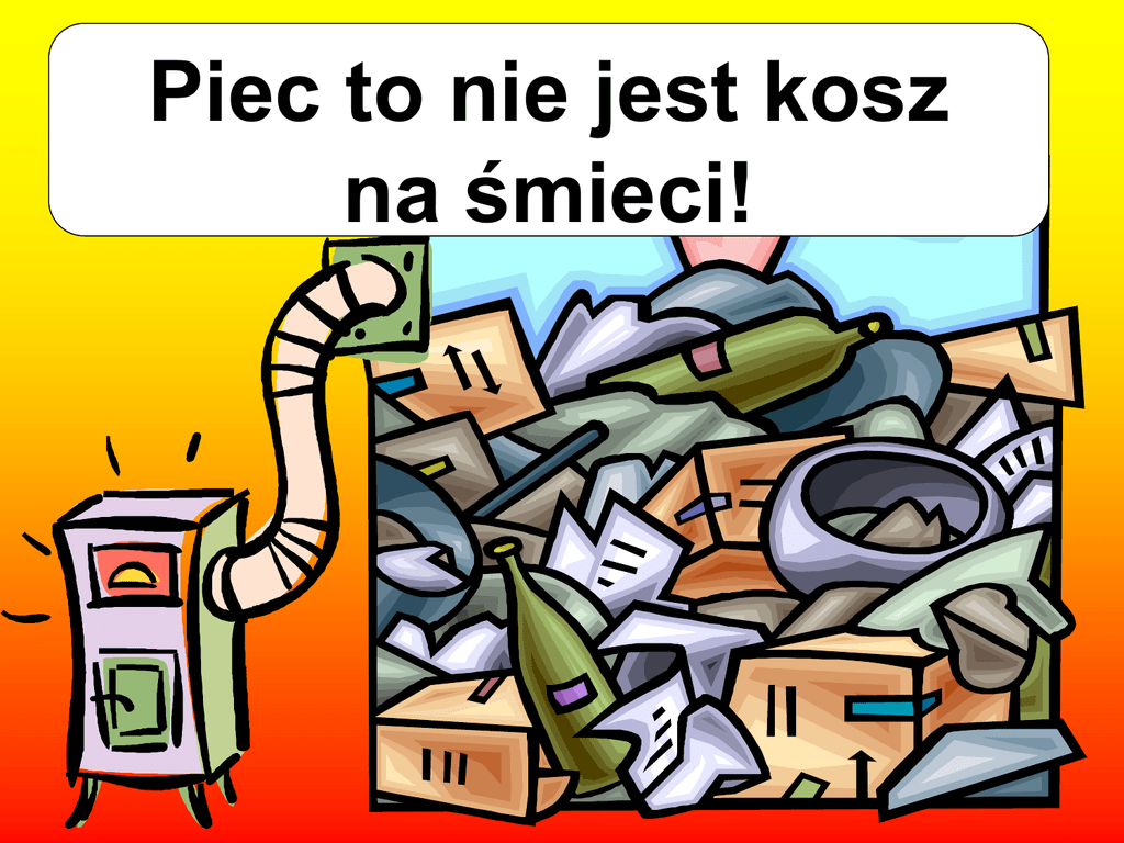 Piec to nie jest kosz na śmieci! Zaczęły się jesienne chłody, przed nami zima. Dymiące kominy świadczą o tym, że sezon grzewczy już się rozpoczął. Niektórzy „oszczędni” właściciele domów ogrzewają mieszkania paląc w piecach śmieciami. W świadomości tych osób, takie postępowanie to czysty zysk – pozbywają się odpadów, nie płacąc za ich wywóz i jeszcze uzyskują z tego ciepło. Niestety, jest to tylko pozorna oszczędność. Według danych Polskiej Zielonej Sieci, Polacy produkują rocznie około 10 mln ton odpadów komunalnych. Taka ilość powoduje, że niektórzy ze śmieci uczynili główny materiał opałowy, a do sezonu grzewczego przygotowują się cały rok pieczołowicie gromadząc wszelkie zużyte opakowania. Jak bardzo jest to rozpowszechniony proceder, świadczą wielkie chmury czarnego dymu nad całą Polską – czy to mała wieś, czy wielkie miasto, ogromna willa czy biedna chatynka. W niektórych miejscach dochodzi nawet do tego, że zwykłe wyjście na spacer staje się wręcz niemożliwe z powodu ogromnych ilości dymu i pyłu w powietrzu. W listopadzie po raz VI obchodzimy Dzień Czystego Powietrza Co robić, aby przekonać tych „oszczędnych”, że palenie śmieci się nie opłaca? prosić straszyć edukować Czym były śmieci, zanim wynaleziono tworzywa sztuczne? W większości odpadkami organicznymi, które rozkładały się bez szkody dla środowiska – resztki jedzenia, drewniane lub gliniane przedmioty i sprzęty, skrawki materiałów (bawełny, lnu). Jednak z postępem technicznym pojawiały się coraz to nowe rodzaje tworzyw, przesyconych chemią i coraz wolniej rozkładających się. Teraz śmieci to w zdecydowanej większości plastik, folia albo guma. Czego nie wolno spalać! Drewno impregnowane i lakierowane Meble tapicerskie Sztucznej i naturalnej skóry Pojemników i butelek z tworzyw sztucznych po napojach, farbach, lakierach, rozpuszczalnikach, środkach ochrony roślin czy olejach silnikowych Zużytych opon Odpadów z gumy Impregnowanej tektury Śmieci spalane w warunkach domowych palone są w niskich temperaturach, co powoduje wydzielanie się mnóstwa zanieczyszczeń Dlaczego palenie śmieci jest aż tak szkodliwe? Ponieważ piece domowe nie są przystosowane do spalania materiałów tego typu. W profesjonalnej spalarni odpadów sam proces spalania odbywa się w o wiele wyższej temperaturze, a używane piece wyposażone są w odpowiednie filtry. Natomiast podczas spalania śmieci emitowane są szkodliwe substancje, a kominy często zapychają się sadzą, co może skończyć się zaczadzeniem, albo zapaleniem przewodu kominowego. Co kryje dym z komina? • pył (suchy) • związki organiczne oznaczone jako węgiel całkowity • tlenek węgla (CO) • nieorganiczne związki chloru oznaczone jako HCL • nieorganiczne związki fluoru oznaczone jako HF • tlenki azotu jako NOx • dwutlenek siarki (SO2) • metale ciężkie zaliczane do klasy I (kadm, rtęć, tytan), II (arsen, kobalt, nikiel, selen), III (ołów, chrom). Przeanalizujmy dokładnie te wszystkie zagrożenia. Zastanówmy się, czy dla tej odrobiny ciepła uzyskanego z odpadów warto skazywać siebie i otoczenie na wdychanie zabójczych dymów. Ile warte jest życie i zdrowie człowieka? Szlachetne zdrowie, nikt się nie dowie, jako smakujesz, aż się zepsujesz… Co spalisz, to zjesz Szczególnie wrażliwe na czynniki szkodliwe są organizmy dzieci. Pamiętajmy też, że dioksyny później wędrują do gleby i wód. W wyniku konsumpcji płodów rolnych, mięsa czy ryb związki toksyczne dostają się do naszego organizmu przez układ pokarmowy. Tam rozpuszczają się i stopniowo odkładają w tkance tłuszczowej, by po kilkudziesięciu latach odezwać się w postaci nowotworów. Spalając np. stare opony i gumowe buty, uwalniamy do atmosfery kadm, który powoduje choroby nerek i choroby nowotworowe. Ze spalania opakowań plastikowych pochodzą dioksyny i furany, które powoli, ale skutecznie niszczą nasze narządy i również wywołują choroby nowotworowe. Dioksyny mogą też oddziaływać na dziecko w łonie matki, powodując jego trwałe kalectwo. Podczas spalania odpadów w domowych piecach lub, jeszcze gorzej, na terenie własnego podwórka, do atmosfery uwalniane są też inne groźne związki, np. dwutlenek siarki, tlenki azotu, tlenek węgla, metale ciężkie (kadm, ołów, rtęć) i przeróżne pyły. Naraża nas to na zwiększoną ilość zachorowań na choroby układu oddechowego i innych narządów wewnętrznych, alergie i nowotwory. Oczywiście chorują zwykle najsłabsi – małe dzieci, ludzie w podeszłym wieku oraz osoby o obniżonej odporności. Spalanie śmieci w domach jest nielegalne! Grozi za to kara do 5 000 złotych! 5 tys. Raport Komisji Europejskiej informuje, iż co roku na choroby wywołane złym stanem powietrza umiera 28 tysięcy Polaków. Są jednak takie odpady, które można bezpiecznie spalać w piecach, ponieważ nie spowodują negatywnego wpływu na środowisko. PAMIĘTAJ! W gospodarstwach domowych można spalać tylko: odpady z kory… drewna… papieru i tektury… drewna pochodzącego z budowy, remontów i demontażu obiektów budowlanych oraz infrastruktury drogowej,… chyba że są zanieczyszczone impregnatami, albo powłokami ochronnymi. Dziękujemy za uwagę