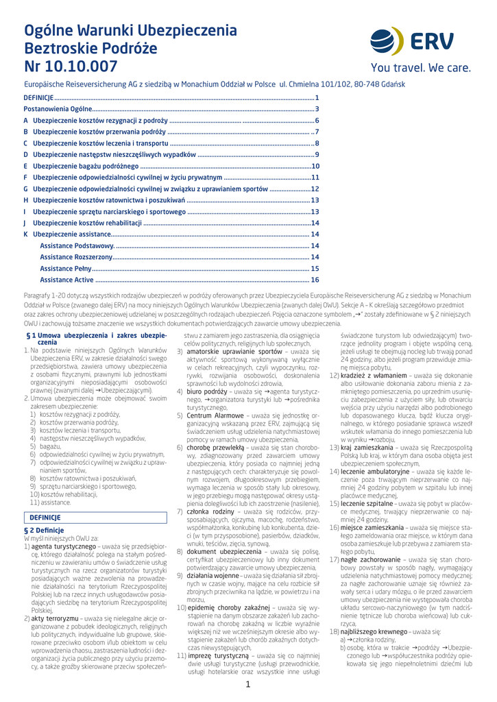 Ogólne Warunki Ubezpieczenia Beztroskie Podróże Nr 10.10.007 Europäische Reiseversicherung AG z siedzibą w Monachium Oddział w Polsce ul. Chmielna 101/102, 80-748 Gdańsk DEFINICJE.........................................................................................................................................................1 Postanowienia Ogólne..................................................................................................................................3 A Ubezpieczenie kosztów rezygnacji z podroży .....................................................................................6 B Ubezpieczenie kosztów przerwania podróży ......................................................................................7 C Ubezpieczenie kosztów leczenia i transportu .....................................................................................8 D Ubezpieczenie następstw nieszczęśliwych wypadków .....................................................................9 E Ubezpieczenie bagażu podróżnego ....................................................................................................10 F Ubezpieczenie odpowiedzialności cywilnej w życiu prywatnym ...................................................11 G Ubezpieczenie odpowiedzialności cywilnej w związku z uprawianiem sportów .........................12 H Ubezpieczenie kosztów ratownictwa i poszukiwań .........................................................................13 I Ubezpieczenie sprzętu narciarskiego i sportowego .........................................................................13 J Ubezpieczenie kosztów rehabilitacji ...................................................................................................14 K Ubezpieczenie assistance.................................................................................................................... 14 Assistance Podstawowy................................................................................................................... 14 Assistance Rozszerzony.................................................................................................................... 14 Assistance Pełny................................................................................................................................ 15 Assistance Active .............................................................................................................................. 16 Paragrafy 1-20 dotyczą wszystkich rodzajów ubezpieczeń w podróży oferowanych przez Ubezpieczyciela Europäische Reiseversicherung AG z siedzibą w Monachium Oddział w Polsce (zwanego dalej ERV) na mocy niniejszych Ogólnych Warunków Ubezpieczenia (zwanych dalej OWU). Sekcje A – K określają szczegółowo przedmiot oraz zakres ochrony ubezpieczeniowej udzielanej w poszczególnych rodzajach ubezpieczeń. Pojęcia oznaczone symbolem „g” zostały zdefiniowane w § 2 niniejszych OWU i zachowują tożsame znaczenie we wszystkich dokumentach potwierdzających zawarcie umowy ubezpieczenia. § 1 Umowa ubezpieczenia i zakres ubezpieczenia 1. Na podstawie niniejszych Ogólnych Warunków Ubezpieczenia ERV, w zakresie działalności swego przedsiębiorstwa, zawiera umowy ubezpieczenia z osobami fizycznymi, prawnymi lub jednostkami organizacyjnymi nieposiadającymi osobowości prawnej (zwanymi dalej gUbezpieczającymi). 2. Umowa ubezpieczenia może obejmować swoim zakresem ubezpieczenie: 1) kosztów rezygnacji z podróży, 2) kosztów przerwania podróży, 3) kosztów leczenia i transportu, 4) następstw nieszczęśliwych wypadków, 5) bagażu, 6) odpowiedzialności cywilnej w życiu prywatnym, 7) odpowiedzialności cywilnej w związku z uprawnianiem sportów, 8) kosztów ratownictwa i poszukiwań, 9) sprzętu narciarskiego i sportowego, 10) kosztów rehabilitacji, 11) assistance. DEFINICJE § 2 Definicje W myśl niniejszych OWU za: 1) agenta turystycznego – uważa się przedsiębiorcę, którego działalność polega na stałym pośredniczeniu w zawieraniu umów o świadczenie usług turystycznych na rzecz organizatorów turystyki posiadających ważne zezwolenia na prowadzenie działalności na terytorium Rzeczypospolitej Polskiej lub na rzecz innych usługodawców posiadających siedzibę na terytorium Rzeczypospolitej Polskiej, 2) akty terroryzmu – uważa się nielegalne akcje organizowane z pobudek ideologicznych, religijnych lub politycznych, indywidualne lub grupowe, skierowane przeciwko osobom i/lub obiektom w celu wprowadzenia chaosu, zastraszenia ludności i dezorganizacji życia publicznego przy użyciu przemocy, a także groźby skierowane przeciw społeczeń- stwu z zamiarem jego zastraszenia, dla osiągnięcia celów politycznych, religijnych lub społecznych, 3) amatorskie uprawianie sportów – uważa się aktywność sportową wykonywaną wyłącznie w celach rekreacyjnych, czyli wypoczynku, rozrywki, rozwijania osobowości, doskonalenia sprawności lub wydolności zdrowia, 4) biuro podróży – uważa się gagenta turystycznego, gorganizatora turystyki lub gpośrednika turystycznego, 5) Centrum Alarmowe – uważa się jednostkę organizacyjną wskazaną przez ERV, zajmującą się świadczeniem usług udzielenia natychmiastowej pomocy w ramach umowy ubezpieczenia, 6) chorobę przewlekłą – uważa się stan chorobowy, zdiagnozowany przed zawarciem umowy ubezpieczenia, który posiada co najmniej jedną z następujących cech: charakteryzuje się powolnym rozwojem, długookresowym przebiegiem, wymaga leczenia w sposób stały lub okresowy, w jego przebiegu mogą następować okresy ustąpienia dolegliwości lub ich zaostrzenie (nasilenie), 7) członka rodziny – uważa się rodziców, przysposabiających, ojczyma, macochę, rodzeństwo, współmałżonka, konkubinę lub konkubenta, dzieci (w tym przysposobione), pasierbów, dziadków, wnuki, teściów, zięcia, synową, 8) dokument ubezpieczenia – uwa