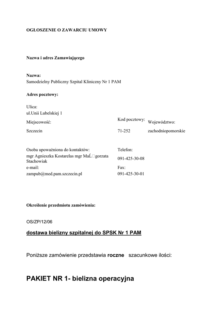 OGŁOSZENIE O ZAWARCIU UMOWY Nazwa i adres Zamawiającego Nazwa: Samodzielny Publiczny Szpital Kliniczny Nr 1 PAM Adres pocztowy: Ulica: ul.Unii Lubelskiej 1 Miejscowość: Kod pocztowy: Szczecin 71-252 Osoba upowaŜniona do kontaktów: mgr Agnieszka Kostarelas mgr MaĹgorzata Stachowiak e-mail: [email protected] Telefon: Województwo: zachodniopomorskie 091-425-30-08 Fax: 091-425-30-01 Określenie przedmiotu zamówienia: OS/ZP/12/06 dostawa bielizny szpitalnej do SPSK Nr 1 PAM PoniŜsze zamówienie przedstawia roczne szacunkowe ilości: PAKIET NR 1- bielizna operacyjna 1. bluza operacyjna – bawełna, kolor zielony, gramatura min.160,rozmiar M,XL,XXL - 240 szt. 2.Spodnie operacyjne z gumką bawełna, kolor zielony, gramatura min.160,rozmiar M,XL,XXL - 240 szt. 3.Podkłady operacyjne bawełna, kolor zielony, gramatura min.160,rozmiar 90x150 - 250 szt. 4.Prześcieradło operacyjne bawełna, kolor zielony, gramatura min.160,rozmiar 150x240 - 300 szt. 5.Sukienka operacyjna dla personelu z kieszenią bawełna, kolor zielony, gramatura min.160,rozmiar M,XL,XXL - 50 szt. 6.Koszula operacyjna dla pacjentów wiązana z tyłu – 20 szt. bawełna, kolor niebieski, gramatura min.160,rozmiar M,XL,XXL 7.Koszula dla połoŜnic bawełna, kolor niebieski, gramatura min.160,rozmiar M,XL,XXL - 50 szt. 8.Czepek lekarski – furaŜerka wiązana bawełna kolor zielony, gramatura min.160,rozmiar XL,XXL - 130szt. Wymagania ogólne dotyczące pakietu Nr 1: - tkanina bawełniana o masie powierzchniowej min. 160 g. - temperatura prania do 95 stopni C, moŜliwość pełnej dezynfekcji i sterylizacji - wyroby muszą spełniać wymagane odrębnymi przepisami normy i standardy PAKIET NR II – bielizna szpitalna 1.Prześcieradło bawełniane trwale oznakowane napisem SPSK Nr 1 bawełna, kolor biały lub inny pastelowy, gramatura min. 160, rozmiar 160 x 240 cm - 720 sztuk 2. Poszwa bawełniana oznakowana napisem SPSK NR 1 bawełna, kolor biały lub inny pastelowy, gramatura min. 160, rozmiar 160 x 210 cm - 500 sztuk 3. Poszewka na poduszkę z zakładką min. 20cm-25 cm oznakowana napisem SPSK Nr 1 bawełna, kolor biały lub inny pastelowy, gramatura min. 160, rozmiar 70cm x 80cm - 800 sztuk 4.Bluza piŜamowa dla dzieci 3-10 lat flanela bawełniana, zapinana z przodu na guziki, długi rękaw , kolorowa - 20 sztuk 5. Spodnie piŜamowe dla dzieci 3-10 lat flanela bawełniana, z gumką w pasie, długie nogawki, kolorowe - 20 sztuk 6. bluza piŜamowa dla dorosłych flanela bawełniana, zapinana z przodu na guziki, długi rękaw , kolorowa , rozmiar: L,XL,XXL - 90 sztuk 7. spodnie piŜamowe dla dorosłych flanela bawełniana, z gumka w pasie, długie nogawki męskie i damskie , kolorowe , rozmiar: L,XL,XXL - 90 sztuk Wymagania ogólne dotyczące pakietu Nr 2: - temperatura prania do 95 stopni C, moŜliwość pełnej dezynfekcji i sterylizacji - wyroby muszą spełniać wymagane odrębnymi przepisami normy i standardy - oznakowanie naleŜy umieścić w czterech naroŜnikach lub na całej długości dłuŜszych krawędzi. PAKIET NR 3 – fartuchy operacyjne 1.Fartuch chirurgiczny barierowy wielokrotnego uŜycia z pojedynczym przodem wykonany w całości z pojedynczej warstwy tkaniny poliestrowej, jednorodnej na całej powierzchni: tkanina nieteflonowana i nieimpregnowana, oddychająca, gramatura max 110 g., posiadająca antystatyczną nitkę węglową, wiązany z tyłu na troki, poły zakładane na siebie, rękawy wykończone elastycznym ściągaczem, kolor niebieski, przeznaczony do zabiegów krótkich i średniokrótkich , rozmiar L, XL 100 sztuk 2. Fartuch chirurgiczny barierowy wielokrotnego uŜycia z podwójnym przodem (podwójna warstwa tkaniny poliestrowej na przedramionach i przednim panelu) wykonany z podwójnej warstwy tkaniny poliestrowej na przedramieniach i panelu przednim, jednorodnej na całej powierzchni: tkanina nieteflonowana , oddychająca, gramatura max 110 g., posiadająca antystatyczną nitkę węglową zapewniajacą nieelektryzowanie się fartucha, wiązany z tyłu na troki, poły zakładane na siebie, rękawy wykończone elastycznym ściągaczem , przeznaczony do długich zabiegów operacyjnych , rozmiar L, XL 50 sztuk 3. Fartuch chirurgiczny barierowy wielokrotnego uŜycia do zabiegów długotrwałych wysokoinwazyjnych , wykonany na bazie dwóch tkanin, w części brzusznej fartucha oraz przedramienia pełnobarierowy laminat trójwarstwowy, gramatura max 180 g., w pozostałej części fartuch wykonany z pojedynczej warstwy tkaniny poliestrowej o gramaturze max 110g: tkanina nieteflonowa, oddychająca posiadająca antystatyczną nitkę węglową zapewniającą nieelektryzowanie się fartucha, wiązany z tyłu na troki, poły zakładane na siebie, rękawy wykończone elastycznym ściągaczem ,kolor niebiesko-zielony , zastosowanie laminatu ma zapewnić 100% ochrony przed przenikaniem wirusów, bakterii i płynów , rekomendowany do zabiegów długotrwałych i wysokoinwazyjnych , rozmiar L, XL 50 szt. Wymagania ogólne dotyczące pakietu Nr 3: - fartuchy muszą być barierowe wykonane zgodnie z normą PN-EN 13795-1, poświadczone oświadczeniem producenta - oznaczone znakiem CE - Ŝywotność fartuchów ma być zagwarantowana na 100 cykli pralniczych oraz sterylizacji, poświadczone oświadczeniem producenta - Zamawiający nie dopuszcza w procesie prania Ŝadnej konserwacji ani impregnacji – wymagane oświadczenie producenta w tym zakresie - Wymagany jest dokument z badania nieprzemakalności po 100 cyklach prania i sterylizacji przez producenta materiałów uŜytych do produkcji fartuchów. Uzasadnienie wyboru wykonawcy(ów): oferty wybrane zgodnie z kryterium określonym w SIWZ NAZWA I ADRES WYKONAWCY NUMER 1 Nazwa: CENTROWET CEZAL Adres pocztowy: Ulica: Słoneczna 16 F Miejscowość: Kod pocztowy: Słupsk 76-200 Telefon: 059 842 42 00 e-mail: Województwo: kujawskopomorskie Fax: 059 841 50 81 NAZWA I ADRES WYKONAWCY NUMER 2 Nazwa: Toruńskie Zakłady Materiałów Opatrunkowych Adres pocztowy: Ulic