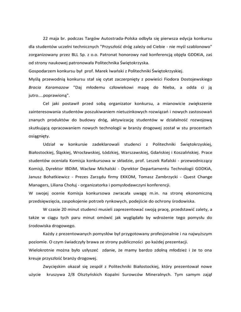 22 maja br. podczas Targów Autostrada-Polska odbyła się pierwsza edycja konkursu dla studentów uczelni technicznych "Przyszłość dróg zależy od Ciebie - nie myśl szablonowo" zorganizowany przez BLL Sp. z o.o. Patronat honorowy nad konferencją objęła GDDKiA, zaś od strony naukowej patronowała Politechnika Świętokrzyska. Gospodarzem konkursu był prof. Marek Iwański z Politechniki Świętokrzyskiej. Myślą przewodnią konkursu stał się cytat zaczerpnięty z powieści Fiodora Dostojewskiego Bracia Karamazow "Daj młodemu człowiekowi mapę do Nieba, a odda ci ją jutro....poprawioną". Cel jaki postawił przed sobą organizator konkursu, a mianowicie zwiększenie zainteresowania studentów poszukiwaniem nietuzinkowych rozwiązań i nowych zastosowań znanych produktów do budowy dróg, aktywizację studentów w działalność rozwojową skutkującą opracowaniem nowych technologii w branży drogowej został w stu procentach osiągnięty. Udział w konkursie zadeklarowali studenci z Politechniki Świętokrzyskiej, Białostockiej, Śląskiej, Wrocławskiej, Łódzkiej, Warszawskiej, Gdańskiej i Koszalińskiej. Prace studentów oceniała Komisja konkursowa w składzie, prof. Leszek Rafalski - przewodniczący Komisji, Dyrektor IBDiM, Wacław Michalski - Dyrektor Departamentu Technologii GDDKiA, Janusz Bohatkiewicz - Prezes Zarządu firmy EKKOM, Tomasz Zambrzycki - Quest Change Managers, Liliana Chołuj - organizatorka i pomysłodawczyni konferencji. W swojej ocenie Komisja konkursowa zwracała uwagę m.in. na stronę ekonomiczną przedsięwzięcia, zaspokojenie potrzeb rynkowych, podejście do ochrony środowiska. W czasie 20 minut studenci musieli zaprezentować swoją pracę, przedstawić zalety, a także w ciągu tych paru minut omówić jak wyglądało by wdrożenie tego pomysłu do środowiska drogowego. Każdy z prezentowanych pomysłów był przygotowany profesjonalnie i na najwyższym poziomie. O czym świadczyły brawa ze strony publiczności po każdej prezentacji. Wielokrotnie można było usłyszeć zdanie, że mamy bardzo zdolną młodzież i że to ona kreuje przyszłość branży drogowej. Zwycięskim okazał się zespół z Politechniki Białostockiej, który prezentował nowe użycie kruszywa 2/8 Olsztyńskich Kopalni Surowców Mineralnych. Tym samym zajął pierwsze historyczne miejsce w pierwszej edycji konkursu i zdobył nagrodę w wysokości 6 tys. złotych oraz stoisko dla Politechniki Białostockiej na targach Autostrada-Polska 2014 r. Drugie miejsce w konkursie zajął zespół z Politechniki Śląskiej, który opracowywał ponowne użycie drutu stalowego odzyskanego z opon pneumatycznych przez firmę Orzeł S.A. W wyniku pracy studentów powstała stalowa mata mająca zastosowanie przy wykonaniu warstwy przeciwspękaniowej. Zespół z Politechniki Łódzkiej za pracę dotyczącą wykorzystania spoiwa Gruntar firmy Lafarge Cement S.A. wzmacnianiu oraz naprawie wałów przeciwpowodziowych poprzez wykonanie ścianek szczelinowych w ich otrzymał trzecie miejsce. Komisja konkursowa postanowiła wyróżnić pracę drugiego zespołu z Politechniki Łódzkiej, który pracował z kruszywem mineralnym pochodzącym z odzysku, produktem firmy Carbo Proces-Recykling. Zespół opracował koncepcję użycia kruszywa do wzmocnienia gruntu pod drogi i nasypy z zastosowaniem kolumn scementowanych w technologii wibrowymiany oraz kamiennych formowanych w technologii wymiany dynamicznej. Nazwiska Laureatów konkursu Wyróżnienie Politechnika Łódzka Opiekun zespołu: dr hab. inż. Renata Kotynia Marek Kołodziejczyk Łukasz Kowalski III miejsce Politechnika Łódzka Opiekun zespołu: dr hab.inż Renata Kotynia Michał Bienias Mateusz Broniarek Artur Bogusiak Adam Adrianowski II miejsce Politechnika Śląska Opiekun zespołu: dr inż. Marcin Grygierek Mateusz Jarzombek Aleksander Pankowski Marta Tomecka I miejsce Politechnika Białostocka Opiekun zespołu: dr inż. Marta Wasilewska Agata Stankiewicz Magdalena Edyta Adadyńska Marcin Macko Maciej Samojłowicz