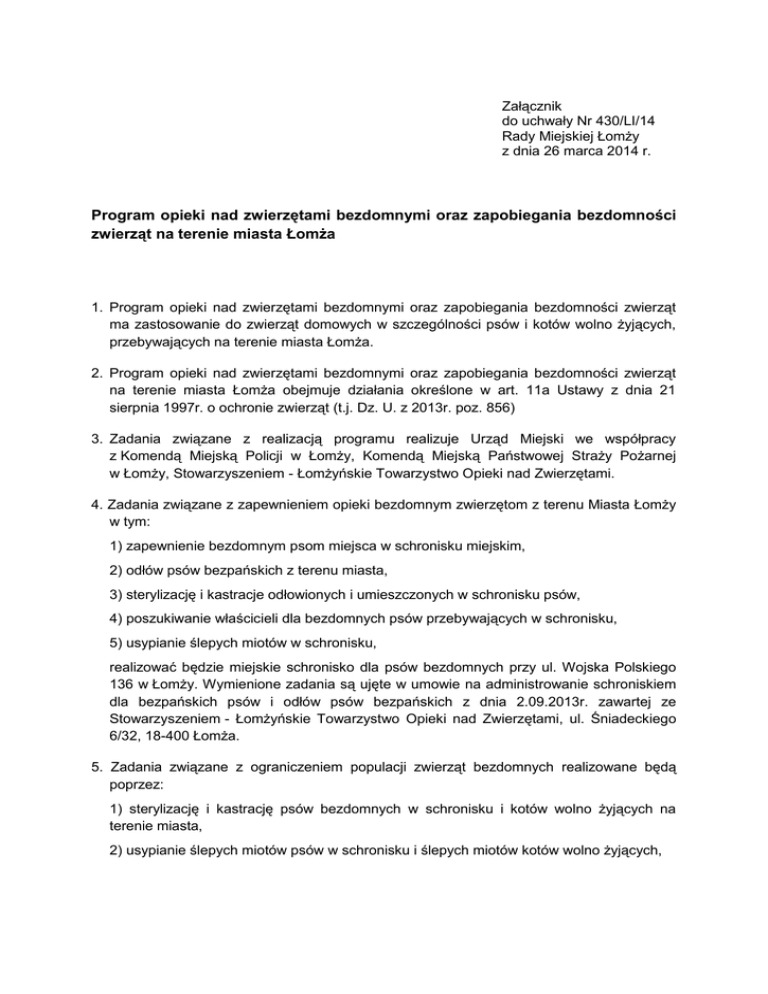 Załącznik do uchwały Nr 430/LI/14 Rady Miejskiej Łomży z dnia 26 marca 2014 r. Program opieki nad zwierzętami bezdomnymi oraz zapobiegania bezdomności zwierząt na terenie miasta Łomża 1. Program opieki nad zwierzętami bezdomnymi oraz zapobiegania bezdomności zwierząt ma zastosowanie do zwierząt domowych w szczególności psów i kotów wolno żyjących, przebywających na terenie miasta Łomża. 2. Program opieki nad zwierzętami bezdomnymi oraz zapobiegania bezdomności zwierząt na terenie miasta Łomża obejmuje działania określone w art. 11a Ustawy z dnia 21 sierpnia 1997r. o ochronie zwierząt (t.j. Dz. U. z 2013r. poz. 856) 3. Zadania związane z realizacją programu realizuje Urząd Miejski we współpracy z Komendą Miejską Policji w Łomży, Komendą Miejską Państwowej Straży Pożarnej w Łomży, Stowarzyszeniem - Łomżyńskie Towarzystwo Opieki nad Zwierzętami. 4. Zadania związane z zapewnieniem opieki bezdomnym zwierzętom z terenu Miasta Łomży w tym: 1) zapewnienie bezdomnym psom miejsca w schronisku miejskim, 2) odłów psów bezpańskich z terenu miasta, 3) sterylizację i kastracje odłowionych i umieszczonych w schronisku psów, 4) poszukiwanie właścicieli dla bezdomnych psów przebywających w schronisku, 5) usypianie ślepych miotów w schronisku, realizować będzie miejskie schronisko dla psów bezdomnych przy ul. Wojska Polskiego 136 w Łomży. Wymienione zadania są ujęte w umowie na administrowanie schroniskiem dla bezpańskich psów i odłów psów bezpańskich z dnia 2.09.2013r. zawartej ze Stowarzyszeniem - Łomżyńskie Towarzystwo Opieki nad Zwierzętami, ul. Śniadeckiego 6/32, 18-400 Łomża. 5. Zadania związane z ograniczeniem populacji zwierząt bezdomnych realizowane będą poprzez: 1) sterylizację i kastrację psów bezdomnych w schronisku i kotów wolno żyjących na terenie miasta, 2) usypianie ślepych miotów psów w schronisku i ślepych miotów kotów wolno żyjących, 3) uwzględnienie w projekcie uchwały w sprawie opłaty od posiadania psów w 2015r. zachęt finansowych dla właścicieli psów w postaci ulg w opłacie za posiadanie psa. Ulgą w opłacie będą objęci właściciele psów, którzy: - przedłożą zaświadczenie, wydane przez lekarza weterynarii o wykonaniu sterylizacji lub kastracji posiadanego psa, - przedłożą zaświadczenie, wydane przez administratora schroniska przy ul. Wojska Polskiego 136 w Łomży potwierdzające fakt adopcji psa ze schroniska. 6. Zadanie związane z opieką nad wolno żyjącymi kotami, w tym ich dokarmianie sprawowane będzie przez Urząd we współpracy ze Stowarzyszeniem – Łomżyńskie Towarzystwo Opieki nad Zwierzętami. 7. Zadanie związane z zapewnieniem miejsca bezdomnym zwierzętom gospodarskim z terenu miasta realizowane będzie w porozumieniu z gospodarstwem rolnym prowadzącym hodowlę zwierząt gospodarskich z siedzibą ul. Stacha Konwy 19 w Łomży. 8. Zadanie związane z zapewnieniem całodobowej opieki weterynaryjnej w przypadkach zdarzeń drogowych z udziałem zwierząt realizować będzie „OAZA” Prywatna Lecznica Dużych i Małych Zwierząt, ul. Wojska Polskiego 129b, 18-400 Łomża. 9. Zadanie związane z usypianiem ślepych miotów realizować Weterynaryjny, Wojciech Karpiński, ul. krótka 14, 18-400 Łomża. będzie Gabinet 10.Zadanie związane ze sterylizacją i kastracją kotów wolno żyjących, realizować będzie Gabinet Weterynaryjny ALFA, Rutkowska Sylwia, ul. Polowa 15/75, 18-400 Łomża. 11.Środki na realizację programu opieki nad zwierzętami bezdomnymi oraz zapobiegania bezdomności zwierząt w wysokości 228,2 tys. zł uwzględniono w dziale 900, rozdz. 90013, § 4300 – schroniska dla zwierząt, Uchwały Rady Miejskiej Łomży z dnia 30 grudnia 2013 roku w sprawie budżetu miasta Łomży na 2014 rok. Z czego: - na zadanie określone w pkt. 4 Programu przeznacza się kwotę 225,14 tys. zł, - na zadanie określone w pkt. 8 Programu przeznacza się kwotę 2,5 tys. zł, - na zadanie określone w pkt. 9 Programu przeznacza się kwotę 0,1 tys. zł, - na zadanie określone w pkt. 10 Programu przeznacza się kwotę 0,45 tys. zł. Przewodniczący Rady Miejskiej Łomży Maciej Andrzej Borysewicz