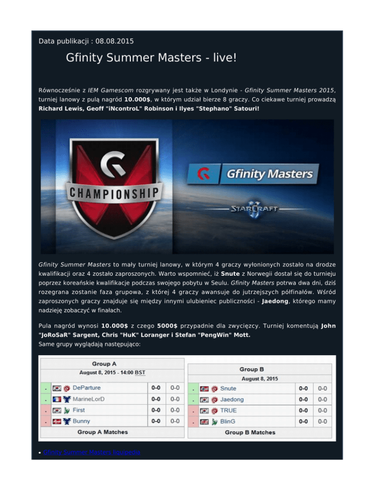 Data publikacji : 08.08.2015 Gfinity Summer Masters - live! Równocześnie z IEM Gamescom rozgrywany jest także w Londynie - Gfinity Summer Masters 2015, turniej lanowy z pulą nagród 10.000$, w którym udział bierze 8 graczy. Co ciekawe turniej prowadzą Richard Lewis, Geoff "iNcontroL" Robinson i Ilyes "Stephano" Satouri! Gfinity Summer Masters to mały turniej lanowy, w którym 4 graczy wyłonionych zostało na drodze kwalifikacji oraz 4 zostało zaproszonych. Warto wspomnieć, iż Snute z Norwegii dostał się do turnieju poprzez koreańskie kwalifikacje podczas swojego pobytu w Seulu. Gfinity Masters potrwa dwa dni, dziś rozegrana zostanie faza grupowa, z której 4 graczy awansuje do jutrzejszych półfinałów. Wśród zaproszonych graczy znajduje się między innymi ulubieniec publiczności - Jaedong, którego mamy nadzieję zobaczyć w finałach. Pula nagród wynosi 10.000$ z czego 5000$ przypadnie dla zwycięzcy. Turniej komentują John "JoRoSaR" Sargent, Chris "HuK" Loranger i Stefan "PengWin" Mott. Same grupy wyglądają następująco: ● Gfinity Summer Masters liquipedia ● Stream główny ● Stream BaseTrade ● Stream polski EmSC2 ● Strona turnieju AKTUALIZACJA Przed nami drugi, finałowy dzień Gfinity Summer Masters 2015, pierwszy półfinał rozpocznie się o godzinie 15:00. Spore zaskoczenie dla swoich fanów sprawił wczoraj Snute z TeamLiquid, który po dobrych grach 2:0 z Bling i 2:1 z TURE awansował z pierwszego miejsca w grupie. Słabszy występ zaliczył niestety Jaedong, który przegrał pierwszą grę z TRUE 0:2, pokonał Blinga 2:0 i o wyjście z grupy ponownie przegrał 0:2 z TRUE. Pary półfinałowe: Autor: Fanek Liczba wyświetleń strony: 431 Data publikacji : 08.08.2015 Data modyfikacji : 09.08.2015 Tagi: eSport, Gfinity Masters Komentarz (0) dodaj komentarz Brak komentarzy dodaj komentarz Pozostałe nowości DreamHack Open: Valencia 2016 - Nerchio w półfinale - live! DreamHack Valencia to jedno z największych e-sportowych wydarzeń w Europie - dlatego nie mogło zabraknąć na nim StarCrafta II! W czasie rozgrywek 96 graczy będzie konkurować o 50 000 USD oraz 5 000 punktów WCS.Data publikacji: 16.07.20161 Aktualizacja 3.4 – Duże zmiany w rankingu StarCrafta II Na oficjalnym blogu Blizzarda pojawił się nowy wpis dotyczący tym razem zmian w rankingach: Ranking StarCrafta II jest areną dla niezwykle zaciętej rywalizacji. Do walki rusza wielu uczestników, ale tylko nieliczni awansują do ścisłej czołówki.Data publikacji: 03.07.20160 Rozpoczęcie trzeciego sezonu rankingowego 2016 Trzeci sezon tegorocznych rozgrywek ligowych w StarCrafta II uważamy za otwarty! Zresetowano pulę punktów premiowych oraz rankingi i przyznano nagrody za sezon drugi roku 2016.Data publikacji: 26.06.20160 Filmowy „Warcraft” już wkrótce w księgarniach! Powieść „Warcraft”, której wydanie zbiega się z polską premierą filmu „Warcraft. Początek” w reżyserii Duncana Jonesa, do księgarń trafi już 15 czerwca. Na kartach książki czytelnicy wkroczą w nowy wymiar emocji towarzyszących bohaterom fikcyjnych światów Azeroth i Draenor. Za sprawą Christie Golden, pisarki od lat cenionej przez fanów świata Warcraft, konflikt ludzi i orków nabierze jeszcze większej intensywności.Data publikacji: 13.06.20160 Blokada obecnego sezonu i darmowa zmiana nazwy postaci Jak czytamy na oficjalnym blogu Blizzarda: Obecny sezon rankingowy zbliża się ku końcowi i wkrótce zamknięte zostaną wszystkie ligi i dywizje. Kilka dni przed rozpoczęciem nowego sezonu, darmowa zmiana nazwy postaci w StarCraft II zostanie ponownie dodana do wszystkich kont, dla których funkcja ta nie jest obecnie dostępna.Data publikacji: 12.06.20160 Wszystkie nowości