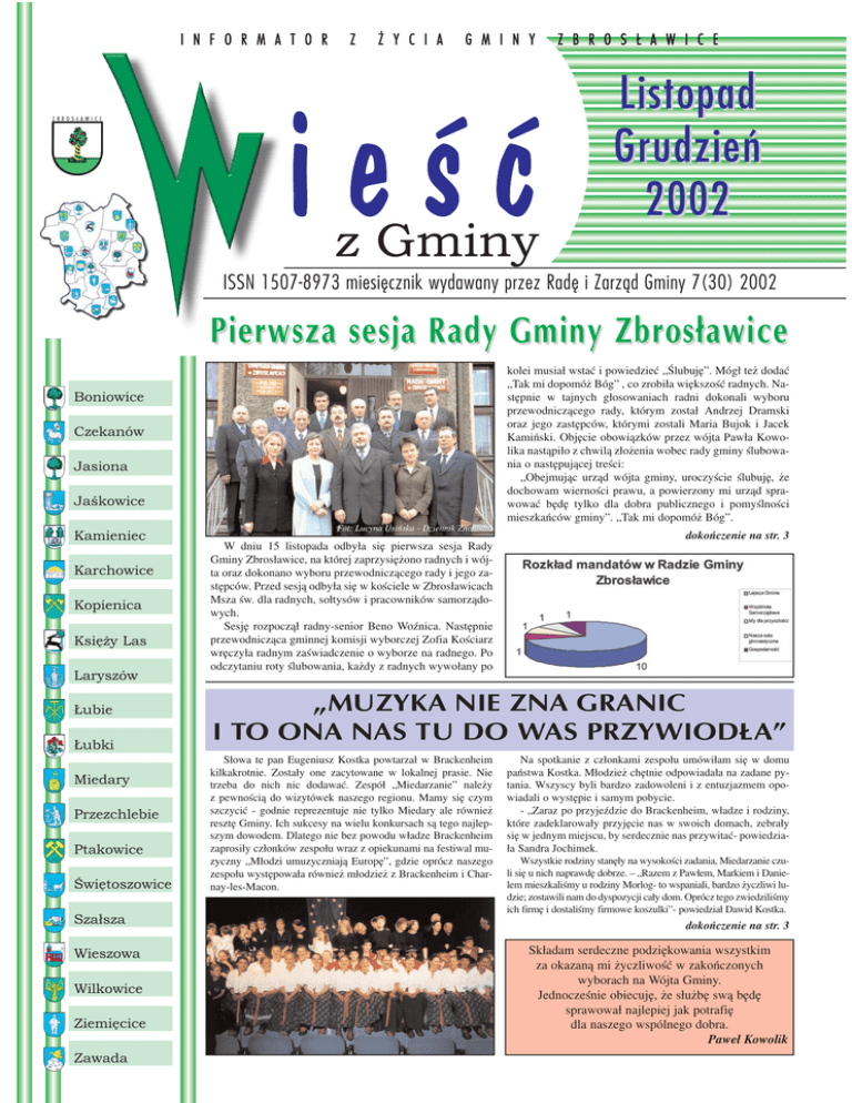 I N F O R M A T O R Z ¯ Y C I A G M I N Y Z B R O S £ A W I C E Listopad Grudzieñ 2002 ISSN 1507-8973 miesiêcznik wydawany przez Radê i Zarz¹d Gminy 7(30) 2002 Pierwsza sesja Rady Gminy Zbros³awice Boniowice Czekanów Jasiona Jakowice Kamieniec Karchowice Kopienica Ksiê¿y Las Laryszów £ubie £ubki Miedary Przezchlebie Ptakowice wiêtoszowice Sza³sza Wieszowa Wilkowice Ziemiêcice Zawada Fot: Lucyna Usiñska - Dziennik Zachodni W dniu 15 listopada odby³a siê pierwsza sesja Rady Gminy Zbros³awice, na której zaprzysiê¿ono radnych i wójta oraz dokonano wyboru przewodnicz¹cego rady i jego zastêpców. Przed sesj¹ odby³a siê w kociele w Zbros³awicach Msza w. dla radnych, so³tysów i pracowników samorz¹dowych. Sesjê rozpocz¹³ radny-senior Beno Wonica. Nastêpnie przewodnicz¹ca gminnej komisji wyborczej Zofia Kociarz wrêczy³a radnym zawiadczenie o wyborze na radnego. Po odczytaniu roty lubowania, ka¿dy z radnych wywo³any po kolei musia³ wstaæ i powiedzieæ lubujê. Móg³ te¿ dodaæ Tak mi dopomó¿ Bóg , co zrobi³a wiêkszoæ radnych. Nastêpnie w tajnych g³osowaniach radni dokonali wyboru przewodnicz¹cego rady, którym zosta³ Andrzej Dramski oraz jego zastêpców, którymi zostali Maria Bujok i Jacek Kamiñski. Objêcie obowi¹zków przez wójta Paw³a Kowolika nast¹pi³o z chwil¹ z³o¿enia wobec rady gminy lubowania o nastêpuj¹cej treci: Obejmuj¹c urz¹d wójta gminy, uroczycie lubujê, ¿e dochowam wiernoci prawu, a powierzony mi urz¹d sprawowaæ bêdê tylko dla dobra publicznego i pomylnoci mieszkañców gminy. Tak mi dopomó¿ Bóg. dokoñczenie na str. 3 MUZYKA NIE ZNA GRANIC I TO ONA NAS TU DO WAS PRZYWIOD£A S³owa te pan Eugeniusz Kostka powtarza³ w Brackenheim kilkakrotnie. Zosta³y one zacytowane w lokalnej prasie. Nie trzeba do nich nic dodawaæ. Zespó³ Miedarzanie nale¿y z pewnoci¹ do wizytówek naszego regionu. Mamy siê czym szczyciæ - godnie reprezentuje nie tylko Miedary ale równie¿ resztê Gminy. Ich sukcesy na wielu konkursach s¹ tego najlepszym dowodem. Dlatego nie bez powodu w³adze Brackenheim zaprosi³y cz³onków zespo³u wraz z opiekunami na festiwal muzyczny M³odzi umuzyczniaj¹ Europê, gdzie oprócz naszego zespo³u wystêpowa³a równie¿ m³odzie¿ z Brackenheim i Charnay-les-Macon. Na spotkanie z cz³onkami zespo³u umówi³am siê w domu pañstwa Kostka. M³odzie¿ chêtnie odpowiada³a na zadane pytania. Wszyscy byli bardzo zadowoleni i z entuzjazmem opowiadali o wystêpie i samym pobycie. - Zaraz po przyjedzie do Brackenheim, w³adze i rodziny, które zadeklarowa³y przyjêcie nas w swoich domach, zebra³y siê w jednym miejscu, by serdecznie nas przywitaæ- powiedzia³a Sandra Jochimek. Wszystkie rodziny stanê³y na wysokoci zadania, Miedarzanie czuli siê u nich naprawdê dobrze. Razem z Paw³em, Markiem i Danielem mieszkalimy u rodziny Morlog- to wspaniali, bardzo ¿yczliwi ludzie; zostawili nam do dyspozycji ca³y dom. Oprócz tego zwiedzilimy ich firmê i dostalimy firmowe koszulki- powiedzia³ Dawid Kostka. dokoñczenie na str. 3 Sk³adam serdeczne podziêkowania wszystkim za okazan¹ mi ¿yczliwoæ w zakoñczonych wyborach na Wójta Gminy. Jednoczenie obiecujê, ¿e s³u¿bê sw¹ bêdê sprawowa³ najlepiej jak potrafiê dla naszego wspólnego dobra. Pawe³ Kowolik Zrzeszeni w Zwi¹zku, jako zintegrowana grupa spo³ecznoci naszej Gminy, w miarê naszego ci¹gle jeszcze aktywnego ¿ycia chcemy wyjæ z naszych domów od codziennej troski i zabiegania, ¿eby choæ na jeden dzieñ odpocz¹æ, poczuc siê kim wa¿nym, wyjechac na wycieczkê, zaj¹æ mysli ciekawym widokiem, zwiedzonych miejsc- choæ na chwilê zapomnieæ o k³opotach, popiewac weso³o i pomodlic siê za pieknie spêdzony czas. My Emeryci, Rencici i Inwalidzi To wa¿ne ¿eby nie izolowaæ siê w cianach w³asnego domu, ¿e jest siê jeszcze bardzo potrzebnym dla drugiego spotkanego cz³owieka, po prostu byæ. Starzej¹ca siê spo³ecznoæ naszej gminy jest jakoby okrojona o czêæ m³odzie¿y która ¿yje i pracuje za granic¹, a pozostaj¹ca m³odzie¿ w gminie szuka pracy. Perspektywa na najbli¿sze parê lat nie jest optymistyczna, dla nas seniorów czas jest nie ub³agalny, przybêdzie nam osób mniej sprawnych. Spotkania nasze jeden raz w miesi¹cu w atmosferze odpoczynku, wytchnienia po trosze i zabawy zintegruj¹ z czasem jeszcze bardziej naszych seniorów i niepe³nosprawnych inwalidów na tyle, abymy mogli zadbaæ o nasz¹ przysz³oæ w coraz wiêkszej mizerii finansowej naszych Gmin. Musimy pomagaæ sobie i wspieraæ siê nawzajem, wszak¿e nie zawsze potrzebna jest pomoc materialna. W naszej Gminie spotkalimy siê ze zrozumieniem naszych potrzeb, korzystamy z dotacji Urzêdu Gminy do niektórych naszych wycieczek, bezp³atnie korzystamy z pomieszczeñ Gminnej wietlicy, mamy tam zapewnione swoje miejsce. Raz w miesi¹cu spotykamy siê przy sk³adkowej herbatce, wspólnie piewamy piosenki naszej m³odosci, mamy je zebrane w Naszym piewniku. Bardzo uroczycie obchodzimy nasze wieta- Dzieñ Seniora i Dzieñ Inwalidy. Na spotkaniach tych z udzia³em w³adz zwi¹zkowych i zaproszonych w³adz gminy, mówimy o sprawach, które nas interesuj¹, poruszaj¹. Informujemy o mo¿liwociach korzystania z wczasów, sanatoriów, mozliwoci uzyskania porady prawnej. Dla umilenia czasu zapraszamy równie¿ amatorskie zespo³y artystyczne W tym miejscu w imieniu naszej wspólnoty chcielibymy podziêkowaæ w³adzom gminy za dotychczasow¹, bardzo efektywna wspó³pracê. Mamy zapewnienie ze strony nowowybranych w³adz gminy, ¿e uwzglêdni¹ w swoich planach a tak¿e w bud¿ecie nasze skromne potrzeby, ¿e nie zabraknie kontaktu z Wójtem i radnymi. Gizela Dewor Dyrekcja, Grono Pedagogiczne i dzieci Gminnego Przedszkola nr 2 w Wieszowie ska³adaj¹ serdeczne pozdrowienia ojcom a zarazem stra¿akom OSP WieszowaGrzegorzowi Dymek, Józefowi Bochoñ, Henrykowi Snurawa za pomalowanie w przedszkolu kuchni, przedsionków, wejcia, szatni, ca³ego koryt