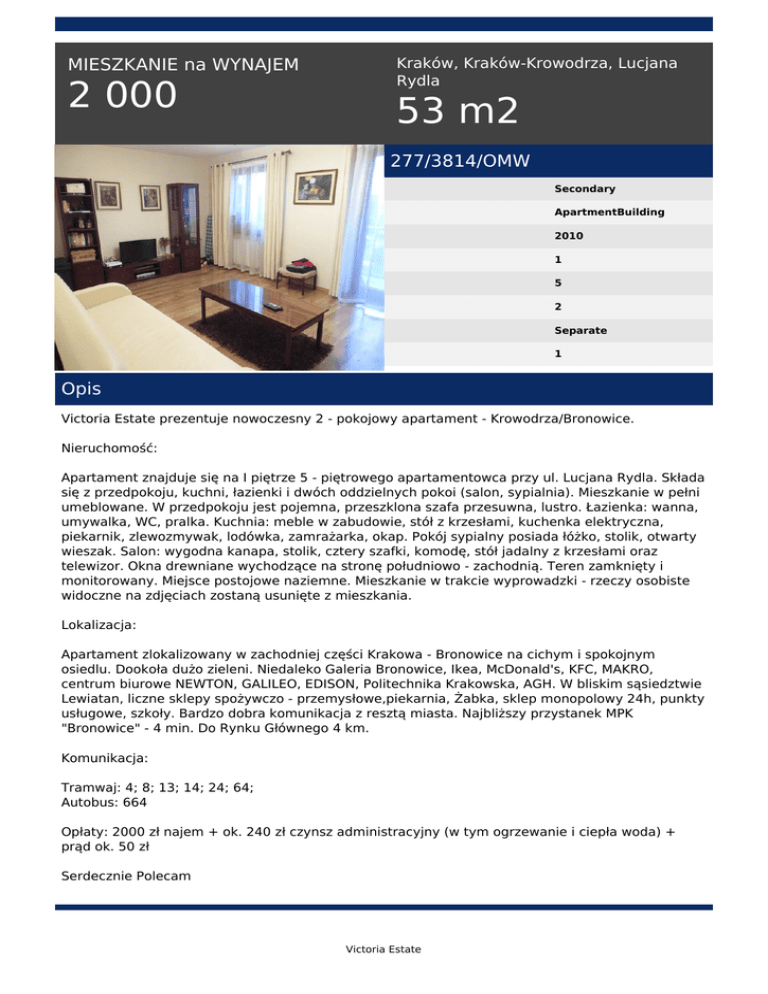 MIESZKANIE na WYNAJEM 2 000 Kraków, Kraków-Krowodrza, Lucjana Rydla 53 m2 277/3814/OMW Secondary ApartmentBuilding 2010 1 5 2 Separate 1 Opis Victoria Estate prezentuje nowoczesny 2 - pokojowy apartament - Krowodrza/Bronowice. Nieruchomość: Apartament znajduje się na I piętrze 5 - piętrowego apartamentowca przy ul. Lucjana Rydla. Składa się z przedpokoju, kuchni, łazienki i dwóch oddzielnych pokoi (salon, sypialnia). Mieszkanie w pełni umeblowane. W przedpokoju jest pojemna, przeszklona szafa przesuwna, lustro. Łazienka: wanna, umywalka, WC, pralka. Kuchnia: meble w zabudowie, stół z krzesłami, kuchenka elektryczna, piekarnik, zlewozmywak, lodówka, zamrażarka, okap. Pokój sypialny posiada łóżko, stolik, otwarty wieszak. Salon: wygodna kanapa, stolik, cztery szafki, komodę, stół jadalny z krzesłami oraz telewizor. Okna drewniane wychodzące na stronę południowo - zachodnią. Teren zamknięty i monitorowany. Miejsce postojowe naziemne. Mieszkanie w trakcie wyprowadzki - rzeczy osobiste widoczne na zdjęciach zostaną usunięte z mieszkania. Lokalizacja: Apartament zlokalizowany w zachodniej części Krakowa - Bronowice na cichym i spokojnym osiedlu. Dookoła dużo zieleni. Niedaleko Galeria Bronowice, Ikea, McDonald's, KFC, MAKRO, centrum biurowe NEWTON, GALILEO, EDISON, Politechnika Krakowska, AGH. W bliskim sąsiedztwie Lewiatan, liczne sklepy spożywczo - przemysłowe,piekarnia, Żabka, sklep monopolowy 24h, punkty usługowe, szkoły. Bardzo dobra komunikacja z resztą miasta. Najbliższy przystanek MPK "Bronowice" - 4 min. Do Rynku Głównego 4 km. Komunikacja: Tramwaj: 4; 8; 13; 14; 24; 64; Autobus: 664 Opłaty: 2000 zł najem + ok. 240 zł czynsz administracyjny (w tym ogrzewanie i ciepła woda) + prąd ok. 50 zł Serdecznie Polecam Victoria Estate Małgorzata Wicha tel. +48 511 560 721 email: [email protected] Victoria Estate Powered by TCPDF (www.tcpdf.org)