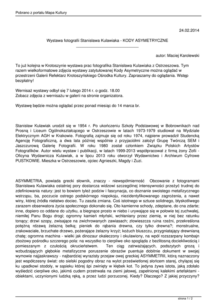Pobrano z portalu Mapa Kultury 24.02.2014 Wystawa fotografii Stanisława Kulawiaka - KODY ASYMETRYCZNE ____________________________ autor: Maciej Karolewski To już kolejna w Krotoszynie wystawa prac fotografika Stanisława Kulawiaka z Ostrzeszowa. Tym razem wielkoformatowe zdjęcia wystawy zatytułowanej Kody Asymetryczne można oglądać w przestrzeni Galerii Refektarz Krotoszyńskiego Ośrodka Kultury. Zapraszamy do oglądania. Wstęp bezpłatny! Wernisaż wystawy odbył się 7 lutego 2014 r. o godz. 18.00 Zobacz zdjęcia z wernisażu w galerii na stronie organizatora. Wystawę będzie można oglądać przez ponad miesiąc do 14 marca br. Stanisław Kulawiak urodził się w 1954 r. Po ukończeniu Szkoły Podstawowej w Bobrownikach nad Prosną i Liceum Ogólnokształcącego w Ostrzeszowie w latach 1973-1979 studiował na Wydziale Elektrycznym AGH w Krakowie. Fotografią zajmuje się od roku 1974, najpierw prowadził Studencką Agencję Fotograficzną, a dwa lata później wspólnie z przyjaciółmi założył Grupę Twórczą SEM i Jaszczurową Galerię Fotografii. W roku 1980 został członkiem Związku Polskich Artystów Fotografików. Autor wielu wystaw i publikacji, w latach 1999-2013 współpracował z firmą żony Zofii Oficyna Wydawnicza Kulawiak, a w lipcu 2013 roku otworzył Wydawnictwo i Archiwum Cyfrowe PUSTKOWIE. Mieszka w Ostrzeszowie, ojciec Agnieszki, Magdy i Zuzi. ASYMMETRIA, powiada grecki słownik, znaczy - niewspółmierność Obcowanie z fotogramami Stanisława Kulawiaka ostatniej pory dostarcza widzowi szczególnej intensywności przeżyć trudnej do zdefiniowania natury: jest to bowiem tyleż podziw i fascynacja, co doznanie swoistego metafizycznego wstrząsu, ba, poczucie ostrego podskórnego niepokoju, niezidentyfikowanego zagrożenia, a nawet winy, której źródła niełatwo dociec. Tu zaszła zmiana. Coś istotnego w sztuce solidnego, błyskotliwego zarazem obserwatora życia społecznego dokonało się. Oto kamienne schody, zdeptane, do cna zdarte; inne, dopiero co oddane do użytku, a biegnące prosto w niebo i urywające się w połowie tej zuchwałej, niemiłej Panu Bogu drogi; ogromny kamień młyński, wchłaniany przez ziemię, w niej bez ratunku tonący; drzwi szopy, zwisające na zwichrowanych zawiasach; złowieszcza ruina rzeźni, przekreślona potężną rdzawą żelazną belką; pieniek do rąbania drewna, czy tylko drewna?; monstrualne, zrakowaciałe, brzuchate drzewo, pożerające żelazny krzyż; kożuch bluszczu, przygniatający drewnianą chatę; ogromna machina - wielki jak dinozaur okaleczony i okulawiony, na wpół rozszarpany kombajn zbożowy pośrodku szczerego pola: na wszystko to cierpliwe oko spogląda z bezlitosną dociekliwością i pomieszanym z czułością okrucieństwem. Ten ciąg zatrważających, podszytych grozą i wzbudzających głębokie metafizyczne poruszenie obrazów puentuje dobitnie dokument w swojej wymowie najjaskrawszy - najbardziej wyrazisty przejaw owej greckiej ASYMMETRII, którą naznaczony jest współczesny świat: oto sielski pogodny obraz na wylot prześwietlonej słońcem starej, chylącej się ku upadkowi stodoły, w sąsieku której śpi zwinięty w kłębek kot. To jedyna żywa istota, jaką zdołało wyśledzić cierpliwe oko, jakimś cudem przetrwała na ziemi jałowej, zapełnionej kalekimi artefaktami obiektami, uczynionymi ludzką ręką, a przez ludzi porzuconej. Kiedy? Dlaczego? Z jakiej przyczyny? strona 1 / 2 Pobrano z portalu Mapa Kultury Czy nieodwracalnie? (Marian Pilot) strona 2 / 2