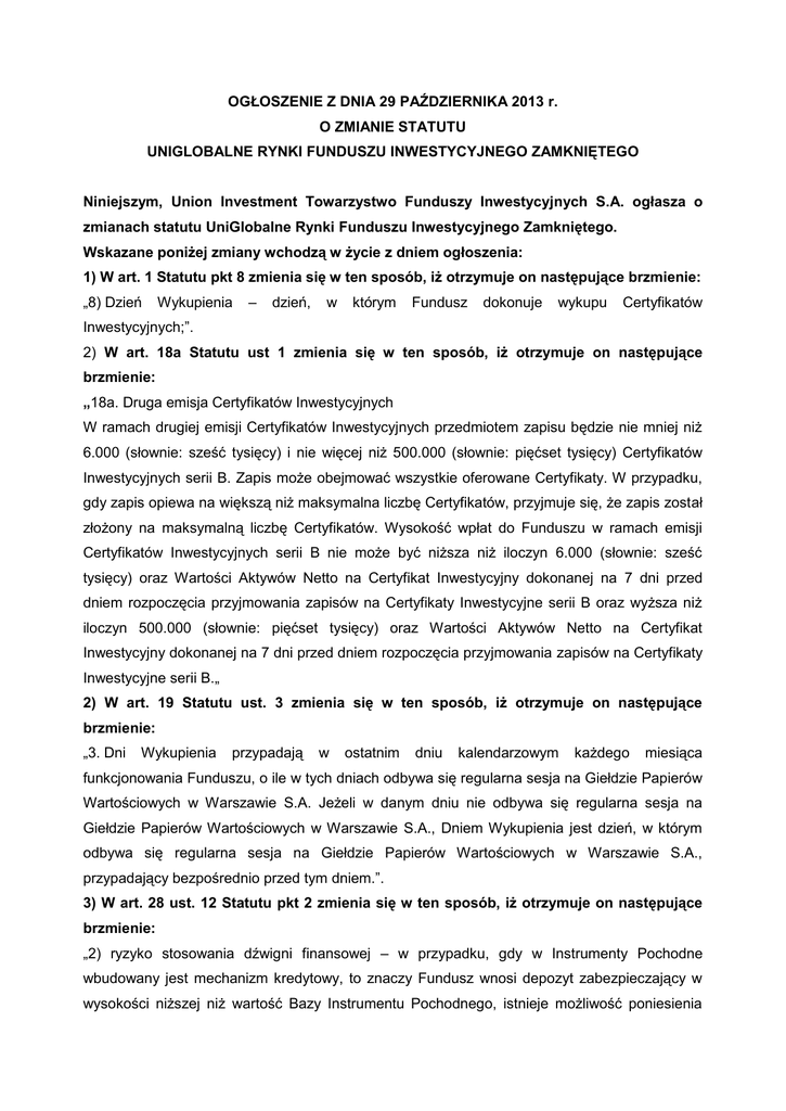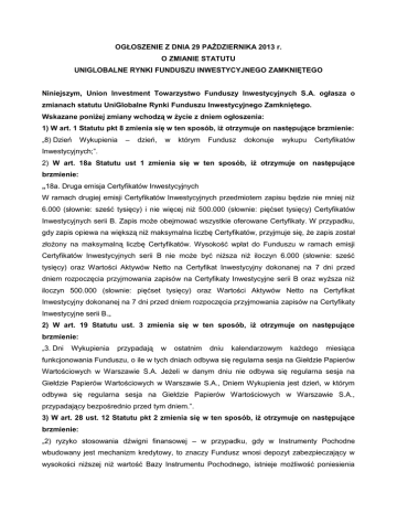 OGŁOSZENIE Z DNIA 29 PAŹDZIERNIKA 2013 r. O ZMIANIE STATUTU UNIGLOBALNE RYNKI FUNDUSZU INWESTYCYJNEGO ZAMKNIĘTEGO Niniejszym, Union Investment Towarzystwo Funduszy Inwestycyjnych S.A. ogłasza o zmianach statutu UniGlobalne Rynki Funduszu Inwestycyjnego Zamkniętego. Wskazane poniżej zmiany wchodzą w życie z dniem ogłoszenia: 1) W art. 1 Statutu pkt 8 zmienia się w ten sposób, iż otrzymuje on następujące brzmienie: „8) Dzień Wykupienia – dzień, w którym Fundusz dokonuje wykupu Certyfikatów Inwestycyjnych;”. 2) W art. 18a Statutu ust 1 zmienia się w ten sposób, iż otrzymuje on następujące brzmienie: „18a. Druga emisja Certyfikatów Inwestycyjnych W ramach drugiej emisji Certyfikatów Inwestycyjnych przedmiotem zapisu będzie nie mniej niż 6.000 (słownie: sześć tysięcy) i nie więcej niż 500.000 (słownie: pięćset tysięcy) Certyfikatów Inwestycyjnych serii B. Zapis może obejmować wszystkie oferowane Certyfikaty. W przypadku, gdy zapis opiewa na większą niż maksymalna liczbę Certyfikatów, przyjmuje się, że zapis został złożony na maksymalną liczbę Certyfikatów. Wysokość wpłat do Funduszu w ramach emisji Certyfikatów Inwestycyjnych serii B nie może być niższa niż iloczyn 6.000 (słownie: sześć tysięcy) oraz Wartości Aktywów Netto na Certyfikat Inwestycyjny dokonanej na 7 dni przed dniem rozpoczęcia przyjmowania zapisów na Certyfikaty Inwestycyjne serii B oraz wyższa niż iloczyn 500.000 (słownie: pięćset tysięcy) oraz Wartości Aktywów Netto na Certyfikat Inwestycyjny dokonanej na 7 dni przed dniem rozpoczęcia przyjmowania zapisów na Certyfikaty Inwestycyjne serii B.„ 2) W art. 19 Statutu ust. 3 zmienia się w ten sposób, iż otrzymuje on następujące brzmienie: „3. Dni Wykupienia przypadają w ostatnim dniu kalendarzowym każdego miesiąca funkcjonowania Funduszu, o ile w tych dniach odbywa się regularna sesja na Giełdzie Papierów Wartościowych w Warszawie S.A. Jeżeli w danym dniu nie odbywa się regularna sesja na Giełdzie Papierów Wartościowych w Warszawie S.A., Dniem Wykupienia jest dzień, w którym odbywa się regularna sesja na Giełdzie Papierów Wartościowych w Warszawie S.A., przypadający bezpośrednio przed tym dniem.”. 3) W art. 28 ust. 12 Statutu pkt 2 zmienia się w ten sposób, iż otrzymuje on następujące brzmienie: „2) ryzyko stosowania dźwigni finansowej – w przypadku, gdy w Instrumenty Pochodne wbudowany jest mechanizm kredytowy, to znaczy Fundusz wnosi depozyt zabezpieczający w wysokości niższej niż wartość Bazy Instrumentu Pochodnego, istnieje możliwość poniesienia przez Fundusz straty przewyższającej wartość depozytu zabezpieczającego, mechanizm dźwigni finansowej powoduje zwielokrotnienie zysków i strat z inwestycji - Fundusz może być narażony na istotne ryzyko w związku z wykorzystaniem tego mechanizmu - w celu pomiaru ryzyka dźwigni finansowej Fundusz określa wartość pozycji w bazie Instrumentów Pochodnych w sposób określony w Rozporządzeniu w Sprawie Instrumentów Pochodnych oraz uwzględnia ją przy stosowaniu limitów inwestycyjnych.”. 4) W art. 28 ust. 12 Statutu pkt 6 zmienia się w ten sposób, iż otrzymuje on następujące brzmienie: „6) ryzyko płynności, związane z faktem, że Instrumenty Pochodne, które mogą być przedmiotem lokat Funduszu, nie muszą być przedmiotem obrotu na rynkach regulowanych, a w przypadku Instrumentów Pochodnych będących przedmiotem obrotu na rynku regulowanym także związane z możliwością wystąpienia sytuacji, w której nie jest możliwe dokonanie transakcji pakietem Instrumentów Pochodnych bez istotnego wpływu na ich cenę - w celu pomiaru tego ryzyka Fundusz w odniesieniu do Instrumentów Pochodnych dokonuje pomiaru stosunku wielkości pozycji w danym Instrumencie Pochodnym do średnich dziennych obrotów rynkowych na tym Instrumencie.”. 5) W art. 38 Statutu ust. 3 zmienia się w ten sposób, iż otrzymuje on następujące brzmienie: „3. Towarzystwo będzie pobierało wynagrodzenie zmienne za zarządzanie, w przypadku gdy uzyskane wyniki zarządzania Funduszem przez Towarzystwo będą wyższe niż dwukrotność stawki WIBID 1Y kwotowanej drugiego dnia roboczego poprzedzającego ostatni dzień roboczy w roku poprzedzającym okres rozliczeniowy oraz Wartość Aktywów Netto na Certyfikat Inwestycyjny przed naliczeniem rezerwy na wynagrodzenie zmienne w ostatnim Dniu Wyceny bieżącego okresu rozliczeniowego będzie wyższa od Wartości Aktywów Netto na Certyfikat Inwestycyjny w ostatnich Dniach Wyceny dwóch poprzednich okresów rozliczeniowych poprzedzających bieżący okres rozliczeniowy. 1) Przyjmuje się, że stopa zwrotu zarządzania Funduszem przez Towarzystwo jest wyższa w przypadku spełnienia poniższego warunku: W(NAV) >= 2 * x gdzie: W(NAV) – procentowa zmiana w bieżącym okresie rozliczeniowym obliczana jako: W(NAV)=NAV1/ NAV0 – 1, gdzie: NAV1 - Wartość Aktywów Netto Funduszu na Certyfikat Inwestycyjny przed naliczeniem rezerwy na wynagrodzenie zmienne w ostatnim Dniu Wyceny bieżącego okresu rozliczeniowego, NAV0 – maksymalna Wartości Aktywów Netto Funduszu na Certyfikat Inwestycyjny w ostatnim Dniu Wyceny z dwóch poprzednich okresów rozliczeniowych, poprzedzających bieżący okres rozliczeniowy. x – wysokość stawki WIBID 1Y z drugiego dnia roboczego poprzedzającego ostatni dzień roboczy w roku poprzedzającym okres rozliczeniowy, * – znak iloczynu. 2) Wynagrodzenie to ustalane jest zgodnie z poniższym wzorem: PF = 0,25*(W(NAV) – 2*x)*A(NAV) gdzie: PF – wynagrodzenie zmienne za zarządzanie, W(NAV) – procentowa zmiana w bieżącym okresie rozliczeniowym obliczana jako: W(NAV)=NAV1/ NAV0 – 1, gdzie: NAV1 - Wartość Aktywów Netto Funduszu na Certyfikat Inwestycyjny przed naliczeniem rezerwy na wynagrodzenie zmienne w ostatnim Dniu Wyceny bieżącego okresu rozliczeniowego, NAV0 – maksymalna Wartości Aktywów Netto Funduszu na Cert
