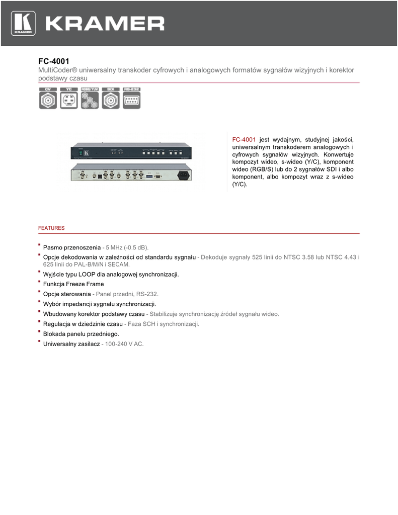 FC-4001 MultiCoder® uniwersalny transkoder cyfrowych i analogowych formatów sygnałów wizyjnych i korektor podstawy czasu FC-4001 jest wydajnym, studyjnej jakości, uniwersalnym transkoderem analogowych i cyfrowych sygnałów wizyjnych. Konwertuje kompozyt wideo, s-wideo (Y/C), komponent wideo (RGB/S) lub do 2 sygnałów SDI i albo komponent, albo kompozyt wraz z s-wideo (Y/C). FEATURES Pasmo przenoszenia - 5 MHz (-0.5 dB). Opcje dekodowania w zależności od standardu sygnału - Dekoduje sygnały 525 linii do NTSC 3.58 lub NTSC 4.43 i 625 linii do PAL-B/M/N i SECAM. Wyjście typu LOOP dla analogowej synchronizacji. Funkcja Freeze Frame Opcje sterowania - Panel przedni, RS-232. Wybór impedancji sygnału synchronizacji. Wbudowany korektor podstawy czasu - Stabilizuje synchronizację źródeł sygnału wideo. Regulacja w dziedzinie czasu - Faza SCH i synchronizacji. Blokada panelu przedniego. Uniwersalny zasilacz - 100-240 V AC. FC-4001 TECHNICAL SPECIFICATIONS WEJŚCIE: 1 kompozyt wideo - 1 Vpp/75 Ω na złączu BNC; 1 YC - 1 Vpp/75 Ω (Y), 0.3 Vpp/75 Ω na złączu 4-pinowym; 1 komponent - Y/R-Y/B-Y (1 Vpp/0.7 Vpp/0.7 Vpp)/75 Ω (lub RGB/S) na złączach BNC; 1 SDI: SMPTE-259M, ITU-R BT.601 na złączu BNC; 1 SYNC (Genlock): z wyjściem loop 75 Ω/Hi-Z na złączach BNC. WYJŚCIA: 1 kompozyt wideo na złączu BN 1 Vpp/75 Ω; 1 YC na 2 złączach BNC: Y 1 Vpp/75 Ω i C 0.3 Vpp/75 Ω; 1 komponent lub RGB/S wideo na złączach BNC 1 Vpp/0.7 Vpp/0.7 Vpp/75 Ω; 1 SYNC na złączu BNC. STANDARDY WIDEO: PAL-B/D/G/H/I/M/N, NTSC-3.58/4.43, SECAM ROZDZIELCZOŚĆ KWANTYZACJI: 10 bitów. PASMO PRZENOSZENIA: 5 MHz (-0.5 dB). WZMOCNIENIE RÓŻNICOWE: 1%. RÓŻNICA FAZ: 1%. WSPÓŁCZYNNIK ZNIEKSZTAŁCEŃ 1%. HARMONICZNYCH: STOSUNEK SYGNAŁ/SZUM: 63 dB. NIELINIOWOŚĆ LUMINANCJI: 1%. OPÓŹNIENIE CHROMINANCJA/LUMINANCJA: STEROWANIE: 1 ns. ŹRÓDŁO ZASILANIA: 230 V AC, 50/60 Hz (115 V AC, USA), 14 VA WYMIARY: 19", 7", 1U (szer., głęb., wys.), przeznaczony do montażu w szafie rack. MASA: Ok. 2.6 kg (5.7 lbs.). AKCESORIA: Przewód zasilający, adapter null-modem. Panel przedni i RS-232; faza SCH, faza SYNC, przesunięcie synchronizacji H, freeze, blokada panelu przedniego.