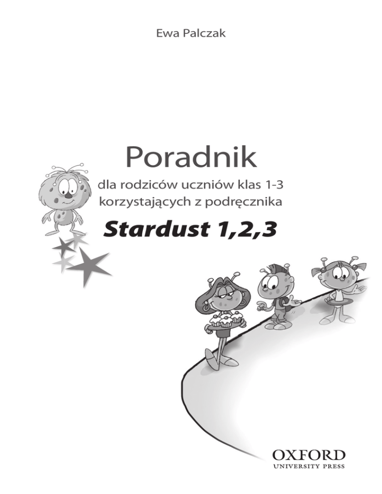 Ewa Palczak Poradnik dla rodziców uczniów klas 1-3 korzystających z podręcznika Stardust 1,2,3 © Poradnik dla rodziców Stardust Spis treści Stardust 1 Wprowadzenie Jak pomóc dziecku w pierwszych krokach w nauce języka angielskiego? W co się bawić? Standardy osiągnięć Rozdział Starter Rozdział 1 Family Rozdział 2 Classroom Rozdział 3 Animals Rozdział 4 Face Rozdział 5 Food Rozdział 6 Weather Rozdział 7 Body Rozdział 8 Clothes Lekcja okolicznościowa Halloween Lekcja okolicznościowa Christmas time Lekcja okolicznościowa Easter Czas na wakacje! 3 4 4 5 6 7 8 9 10 11 12 13 14 15 15 16 17 Stardust 2 Wprowadzenie Jak pomóc dziecku w pierwszych krokach w nauce języka angielskiego? W co się bawić? Standardy osiągnięć Rozdział Starter Rozdział 1 At school Rozdział 2 At Toby’s party Rozdział 3 Tea at Granny’s Rozdział 4 At the circus Rozdział 5 At the park Rozdział 6 At the zoo Lekcja okolicznościowa Halloween Lekcja okolicznościowa Christmas Lekcja okolicznościowa Easter Lekcja okolicznościowa Mother’s Day/Father’s Day Historyjki Old MacDonald Czas na wakacje! 18 19 20 21 22 23 24 25 26 27 28 30 30 31 32 32 34 Stardust 3 Wprowadzenie Jak pomóc dziecku w pierwszych krokach w nauce języka angielskiego? W co się bawić? Standardy osiągnięć Rozdział Starter Rozdział 1 At the beach Rozdział 2 At the fancy dress party Rozdział 3 At the pet show Rozdział 4 At the funfair Rozdział 5 At Sylvia’s house Rozdział 6 In the forest Lekcja okolicznościowa Birthday Lekcja okolicznościowa Christmas Lekcja okolicznościowa Pancake Day Lekcja okolicznościowa Easter Historyjki Old MacDonald Czas na wakacje! 2 35 37 38 39 40 41 42 43 44 45 46 48 49 50 50 51 52 © Poradnik dla rodziców Stardust 1 Stardust 1 WPROWADZENIE by obserwują również z oddali życie pewnej ziemskiej rodziny. Molly, Adam i ich rodzina mieszkają w Wielkiej Brytanii, a sytuacje, w których są przedstawieni, są dopasowane do tematyki poszczególnych rozdziałów podręcznika. Dzieci mają okazję „osobiście” poznać Bobby’ego – nauczyciel prowadzi lekcje wraz z wyobrażającą go pluszową pacynką. Drodzy Rodzice i Opiekunowie! Wasze dziecko rozpoczyna w tym roku naukę języka angielskiego z podręcznikiem Stardust 1, a tym samym wyrusza w pełną przygód podróż w nieznany sobie świat, w którym wszyscy porozumiewają się w obcym języku. Wierzymy, że dzięki tej książce, jej bohaterom i przedstawionym sytuacjom, pierwszy kontakt z językiem będzie pozytywnym doświadczeniem i również w starszych klasach dziecko z przyjemnością będzie się uczyło angielskiego. Nauka w klasach I-III ma na celu przede wszystkim osłuchanie i wyrobienie w dzieciach dobrego nastawienia do języka, ale również do samych siebie i do innych ludzi. Nauczyciel angielskiego dołoży wszelkich starań, by dzieci nie tylko poznawały nowe słówka i dobrze się bawiły na lekcjach – przygotowane ćwiczenia pozwolą dzieciom wszechstronnie się rozwijać w sferze emocjonalnej i społecznej, m.in. nauczą je umiejętności komunikowania się i współpracy, dzielenia się z innymi, cierpliwości oraz zasad dobrego i bezpiecznego zachowania w szkole, w domu, na podwórku czy na ulicy. Na lekcjach angielskiego będzie również czas na pracę indywidualną i ocenę własnych postępów, co pomoże dzieciom w przyszłości samodzielnie radzić sobie z coraz większą ilością nauki. Ucząc się z podręcznika Stardust, dzieci będą poznawały nowy język, korzystając z posiadanej już wiedzy i doświadczeń zdobywanych w szkole i poza nią. Powiązane z programem zająć zintegrowanych treści nauczania oraz te same metody i techniki pracy na lekcjach, a także sposoby oceniania, gwarantują Państwa dzieciom poczucie bezpieczeństwa i efektywną naukę. Jak będzie się uczyło Państwa dziecko? Podobnie jak na pozostałych przedmiotach nauczania zintegrowanego, dzieci będą aktywnie uczestniczyły w nauce, wykorzystując swoje naturalne zamiłowanie do ruchu, zajęć plastycznych i muzycznych. Umożliwią to liczne historyjki, piosenki i wierszyki znajdujące się w podręczniku. Każda lekcja zawiera różnorodne ćwiczenia angażujące uwagę dzieci fizycznie lub umysłowo. Nauczyciel zaproponuje uczniom m.in. słuchanie, czytanie i inscenizacje historyjek, naukę piosenek wraz z towarzyszącymi im gestami, gry i zabawy z użyciem mini-pacynek lub samodzielnie wyciętych elementów. Dzięki takiej różnorodności każde dziecko będzie miało poczucie, że robi postępy i odnosi sukcesy w nauce. Jaką ocenę wystawi nauczyciel? Tak samo jak na zajęciach kształcenia zintegrowanego, na lekcjach języka angielskiego nie przewiduje się stawiania ocen cząstkowych i końcowych w postaci stopni. Nauczyciele stosują ocenę opisową, dzięki której dowiedzą się Państwo, jakie postępy w nauce czyni Wasze dziecko, jakie nowe umiejętności opanowało i ile wysiłku wkłada w naukę. Ocena uwzględnia nie tylko naukę słownictwa i rozwój sprawności językowych, ale także rozwój emocjonalno-społeczny dziecka. Taka informacja wpisywana jest do indywidualnej „Karty osiągnięć”, która pomaga ocenić i porównać postępy dziecka po każdym semestrze nauki. Zachęcamy Państwa do systematycznych kontaktów z nauczycielem języka, który może przekazać Państwu cenne informacje o tym, jak Wasze dziecko radzi sobie w szkole. Czego będzie się uczyło Państwa dziecko? Na lekcjach angielskiego dzieci nauczą się liczyć po angielsku w zakresie 1-20, nazywać podstawowe kolory, zabawki, przybory szkolne, części ciała, jedzenie, zwierzęta i opisywać pogodę. Podręcznik przybliży też uczniom elementy kultury krajów anglojęzycznych – życie codzienne, ale także zwyczaje i święta obchodzone w Wielkiej Brytanii. Dzieci będą miały okazję do refleksji nad podobieństwami i różnicami między życiem w Polsce i w Wielkiej Brytanii. Nauczą się szanowa