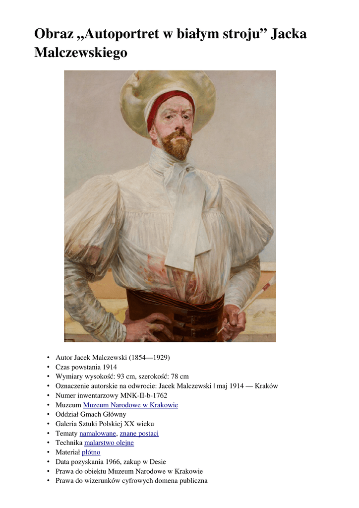 Obraz „Autoportret w białym stroju” Jacka Malczewskiego • • • • • • • • • • • • • • Autor Jacek Malczewski (1854—1929) Czas powstania 1914 Wymiary wysokość: 93 cm, szerokość: 78 cm Oznaczenie autorskie na odwrocie: Jacek Malczewski | maj 1914 — Kraków Numer inwentarzowy MNKIIb1762 Muzeum Muzeum Narodowe w Krakowie Oddział Gmach Główny Galeria Sztuki Polskiej XX wieku Tematy namalowane, znane postaci Technika malarstwo olejne Materiał płótno Data pozyskania 1966, zakup w Desie Prawa do obiektu Muzeum Narodowe w Krakowie Prawa do wizerunków cyfrowych domena publiczna • Digitalizacja MNK, projekt iMNK • Tagi Jacek Malczewski, malarstwo, autoportret, Młoda Polska, 2D Jacek Malczewski jest autorem największej liczby autoportretów w dziejach sztuki polskiej. Jak żartowano z niego w szopce „Zielonego Balonika” w Jamie Michalikowej, artysta ukazywał się „To w Pirogu, to znów bez | To profesor, to znów pan (…) | To w swetrze, przy panterze | To z ogonem, to znów bez”. Słowa te akcentują również jego zamiłowanie do przebierania się i portretowania w różnych wcieleniach. Pasja i bogactwo przyjmowanych póz zdumiewają i zastanawiają. Z tego powodu artystę posądzano nawet o egotyzm, megalomanię i skłonności narcystyczne. Znamienny jest również fakt, że Malczewski, który na kolejnych wizerunkach zmieniał kostiumy i przebrania, twarz pozostawiał zwykle niezmienioną — prawie zawsze jest to oblicze dumne i wyniosłe, czasami zamyślone i niedostępne albo też smutne i skupione. Na monumentalnym Autoportrecie w białym stroju (Autoportret w białym berecie, Autoportret w bieli) przedstawił się jako młodopolski „Pan Panów”, stojący ponad wszystkim. Jest tu wyniosły i dumny, zadowolony ze swych osiągnięć twórczych, wystrojony w kontrastujący z powagą twarzy dziwaczny piekarski beret i w poplamioną koszulę, przypominającą damską bufiastą bluzę, z fantazyjną kokardą spiętą srebrną szpilą. Malczewski jest więc tu zarówno artystą, jak i błaznem. Symbolicznego znaczenia nabiera paleta użytych w obrazie barw: biel to duchowa pełnia, czerwień zaś uwydatnia heroizm. Opracowanie: Urszula KozakowskaZaucha (Muzeum Narodowe w Krakowie), © wszystkie prawa zastrzeżone Autoportret i moda na „selfie”… Zagadka autoportretu. Obecnie panuje moda na autoportrety popularnie zwane selfie. Może je zrobić każdy za pomocą już nawet nie aparatu fotograficznego, a telefonu. Jest w nas narcystyczna potrzeba pokazywania i oglądania swojego wizerunku. Kiedyś, tworzenie autoportretu było procesem. Autoportret malarski stwarzał możliwość uwiecznienia swojego wizerunku pełniąc zarazem funkcję narzędzia samopoznania i autorefleksji. Służył zgłębieniu swojego „ja”, zakodowaniu informacji o sobie lub pewnego rodzaju grze z konwencją, ukrywaniu się za jakimś wizerunkiem (Stanisław Ignacy Witkiewicz). Przybierał różne formy. Przykładem autoportretu wielokrotnego jest obraz Poli Dwurnik Litości! . Z naszkicowanego w tle tłumu wyłaniają się dwadzieścia cztery wizerunki artystki: na każdym jest ona w innym nastroju i stanie psychicznym. Najwcześniejszy znany autoportret powstał prawdopodobnie w Egipcie ok. 2650 roku p.n.e. (Niankh Ptah). Autoportret był zjawiskiem rzadkim w starożytności (autoportret Fidiasza na tarczy Ateny Partenos w Partenonie w Atenach). W średniowieczu powstawały autoportrety idealizowane; twórca malował często siebie jako asystującego w scenie religijnej. Samodzielny autoportret pojawił się w renesansie wskutek podniesienia prestiżu artysty i zwiększenia roli indywidualności człowieka. Zgodnie z renesansowym humanizmem, artysta stał się kimś wyjątkowym, dlatego często malował siebie samego zwróconego w stronę widza (np. Albrecht Dürer). Wielu artystów malowało autoportrety niemal przez całe swoje życie, tworząc w ten sposób cykle swoich podobizn, m.in. Olga Boznańska, Stanisław Wyspiański. W przypadku Olgi Boznańskiej autoportrety są nie tylko odzwierciedleniem upływu czasu, ale również zmieniającej się osobowości artystki. Autoportret Józefa Mehoffera jest wiernym zapisem chwili, nastroju; oddaje intymny charakter sytuacji. Można wręcz odnieść wrażenie, że ma formę szkicu. Nietypową formę autoportretu wybrał Julian Fałat, wpisując swoją podobiznę w panoramę Krakowa. Jan Matejko namalował swój autoportret na podłożu malarskim w kształcie koła. Artyści ukazują siebie samych w bardzo różny sposób. Typowe jest przedstawienie przy pracy, w pracowni, albo z rodziną lub przyjaciółmi (Stanisław Wyspiański z żoną). Zdarza się także, że przedstawiają się jako postaci historyczne, biblijne albo mitologiczne (Maurycy Gottlieb). Mistrzem w takim sposobie autoprezentacji był Jacek Malczewski, autor największej liczby autoportretów w dziejach sztuki polskiej. Oglądając je, trudno nie posądzić go o narcyzm, lecz może to tylko wyrafinowana gra z widzem, rodzaj zaplanowanego spektaklu? Opracowanie: Redakcja WMM, CCBY 3.0 PL