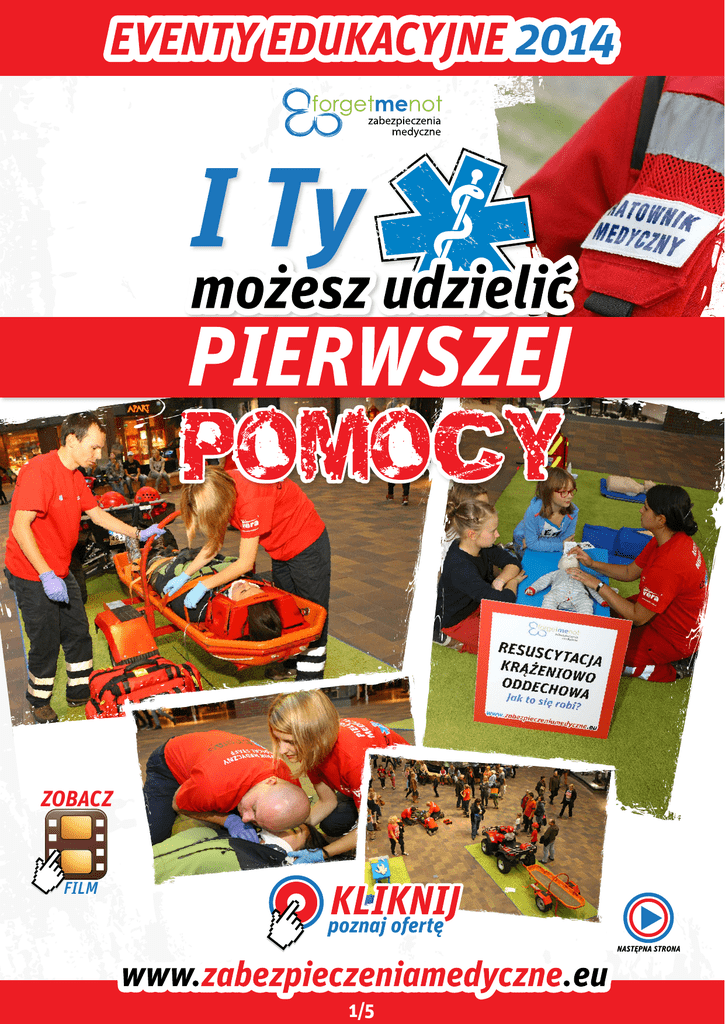 ZOBACZ FILM 1/5 1500 zł netto - całodzienne zajęcia edukacyjne (w godzinach otwarcia Galerii) + koszt dojazdu W spotkaniu uczestniczy 2 ratowników. Zapewniamy : – 2 fantomy (osoby dorosłej i dziecka poniżej 1 roku życia) – treningowe AED (automatyczny defibrylator zewnętrzny) – ratowniczy quad Honda TRX 680 + kosz do transportu poszkodowanych – apteczki pierwszej pomocy / torba ratownika R1 – 4 stoliki o wymiarach 100x50 cm – dywan (wymiar 4x5m) - istnieje możliwość zmniejszenia lub powiększenia powierzchni stoiska – dywan (wymiar 2x5m) – edukacyjne kolorowanki, naklejki dla dzieci – informatory zawierające numery alarmowe oraz instrukcje resuscytacji krążeniowo-oddechowej – telewizor 46”, na którym wyświetlane są materiały dotyczące pierwszej pomocy II dzień zajęć edukacyjnych - 1000 zł netto Wystawiamy fakturę VAT Istnieje możliwość ustalenia indywidualnych warunków Każdy uczestnik otrzyma: INFORMATOR Z NUMERAMI ALARMOWYMI oraz jak udzielić pierwszej pomocy 2/5 3/5 DOWIEDZ SIĘ: - jak poprawnie wykonać resuscytację krążeniowo-oddechową - jak używać AED - jak wzywać służby ratunkowe - co wchodzi w skład apteczki pierwszej pomocy / apteczki ratownika NASZA PEŁNA OFERTA Zabezpieczenie medyczne imprezy masowej jest to skoordynowane przedsiewzięcie, podejmowane przez organizatora imprezy i firmę medyczną zapewniajacą odpowiednio dobrany i wyposażony Zespół Ratownictwa Medycznego, mające na celu zapewnienie bezpieczeństwa uczestnikom zabawy. Oferujemy profesjonalną obsługę medyczną imprez: ▸ masowych ▸ plenerowych ▸ festynów▸ koncertów ▸ rajdów rowerowych itp. EXTREMALNYCH Do Państwa dyspozycji oddajemy sprzęt specjalistyczny w skład którego wchodzi m.in. quad z przyczepą do transportu poszkodo-wanych. Pozwala to nam na szybką i sprawną pomoc poszkodowanemu w miejscach trudno dostępnych. Posiadamy doświadczenie w zabezpieczeniach medycznych: ▸ offroad ▸ downhill ▸ motocross Działając w duchu niesienia pomocy osobom poszkodowanym i potrzebującym, w naszej ofercie propagujemy ideę nauki oraz udzielania pierwszej pomocy. W naszej ofercie znajdziecie państwo kursy i szkolenia z zakresu udzielania pierwszej pomocy zarówno dzieciom jak i osobom dorosłym. Oferujemy Państwu przeprowadzenie pokazów z zakresu udzielania pierwszej pomocy i ratownictwa medycznego (lub drogowego) podczas spotkań, wydarzeń, happeningów, uroczystości i imprez integracyjnych. Podczas prowadzenia tej formy edukacji staramy się odzwierciedlić realne warunki pracy. 4/5 TEAM W naszym zespole pracują ludzie różnych zawodów i wielu pasji: ▸ ratownicy medyczni ▸ górscy ▸ wodni ▸ alpiniści ▸ instruktorzy pierwszej pomocy ▸ trenerzy team building tel. 32 215 99 99, kom. 513 195 475 [email protected] ul. Cienista 32d 43-502 Czechowice-Dziedzice 5/5