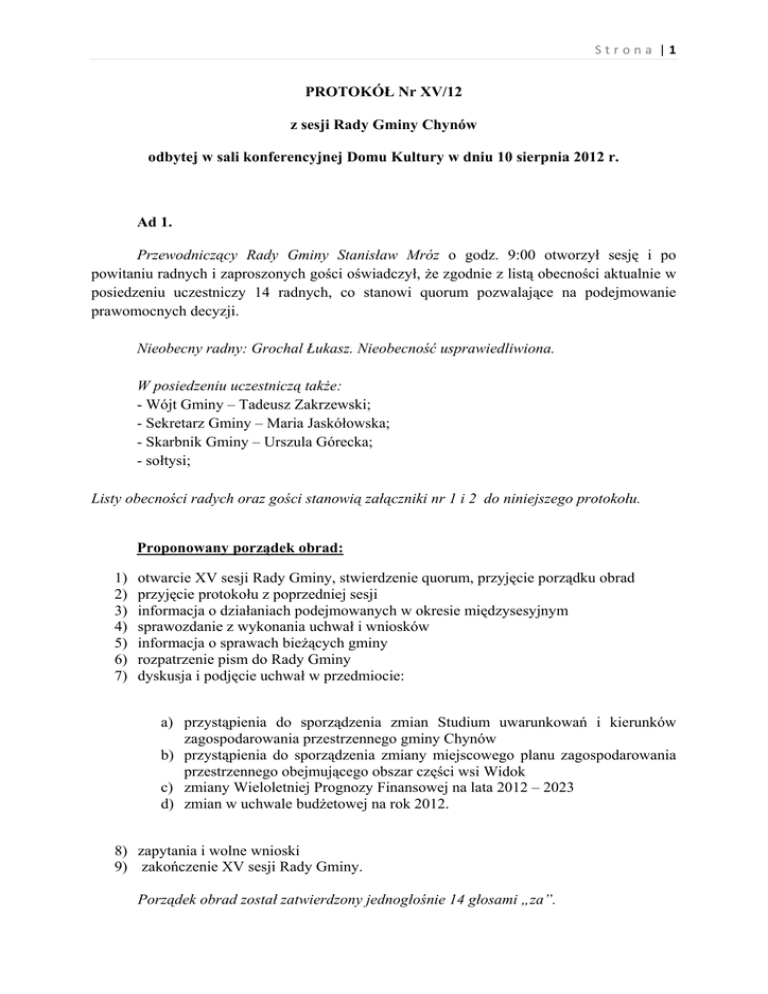 PROTOKÓŁ Nr XV/12 z sesji Rady Gminy Chynów odbytej w sali