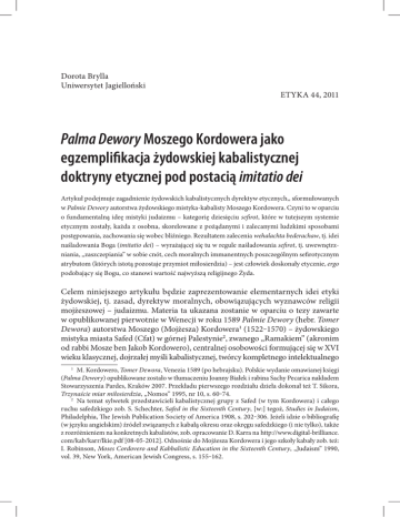 Dorota Brylla Uniwersytet Jagielloński ETYKA 44, 2011 Palma Dewory Moszego Kordowera jako egzemplifikacja żydowskiej kabalistycznej doktryny etycznej pod postacią imitatio dei Artykuł podejmuje zagadnienie żydowskich kabalistycznych dyrektyw etycznych,, sformułowanych w Palmie Dewory autorstwa żydowskiego mistyka‑kabalisty Moszego Kordowera. Czyni to w oparciu o fundamentalną ideę mistyki judaizmu – kategorię dziesięciu sefirot, które w tutejszym systemie etycznym zostały, każda z osobna, skorelowane z pożądanymi i zalecanymi ludzkimi sposobami postępowania, zachowania się wobec bliźniego. Rezultatem zalecenia wehalachta bederachaw, tj. idei naśladowania Boga (imitatio dei) – wyrażającej się tu w regule naśladowania sefirot, tj. uwewnętrz‑ niania, „zaszczepiania” w sobie cnót, cech moralnych immanentnych poszczególnym sefirotycznym atrybutom (których istotą pozostaje przymiot miłosierdzia) – jest człowiek doskonały etycznie, ergo podobający się Bogu, co stanowi wartość najwyższą religijnego Żyda. Celem niniejszego artykułu będzie zaprezentowanie elementarnych idei etyki żydowskiej, tj. zasad, dyrektyw moralnych, obowiązujących wyznawców religii mojżeszowej – judaizmu. Materia ta ukazana zostanie w oparciu o tezy zawarte w opublikowanej pierwotnie w Wenecji w roku 1589 Palmie Dewory (hebr. Tomer Dewora) autorstwa Moszego (Mojżesza) Kordowera1 (1522‒1570) – żydowskiego mistyka miasta Safed (Cfat) w górnej Palestynie2, zwanego „Ramakiem” (akronim od rabbi Mosze ben Jakob Kordowero), centralnej osobowości formującej się w XVI wieku klasycznej, dojrzałej myśli kabalistycznej, twórcy kompletnego intelektualnego 1 M. Kordowero, Tomer Dewora, Venezia 1589 (po hebrajsku). Polskie wydanie omawianej księgi (Palma Dewory) opublikowane zostało w tłumaczeniu Joanny Białek i rabina Sachy Pecarica nakładem Stowarzyszenia Pardes, Kraków 2007. Przekładu pierwszego rozdziału dzieła dokonał też T. Sikora, Trzynaście miar miłosierdzia, „Nomos” 1995, nr 10, s. 60‒74. 2 Na temat sylwetek przedstawicieli kabalistycznej grupy z Safed (w tym Kordowera) i całego ruchu safedzkiego zob. S. Schechter, Safed in the Sixteenth Century, [w:] tegoż, Studies in Judaism, Philadelphia, The Jewish Publication Society of America 1908, s. 202‒306. Jeżeli idzie o bibliografię (w języku angielskim) źródeł związanych z kabałą okresu oraz okręgu safedzkiego (i nie tylko), także z rozróżnieniem na konkretnych kabalistów, zob. opracowanie D. Karra na http://www.digital‑brilliance. com/kab/karr/lkie.pdf [08‑05‑2012]. Odnośnie do Mojżesza Kordowera i jego szkoły kabały zob. też: I. Robinson, Moses Cordovero and Kabbalistic Education in the Sixteenth Century, „Judaism” 1990, vol. 39, New York, American Jewish Congress, s. 155‒162. Palma Dewory Moszego Kordowera jako egzemplifikacja… 149 systemu teologii mistycznego judaizmu, uważanego z tego powodu za jednego z najwybitniejszych kabalistów wszystkich czasów. Mimo więc, że Palma Dewory stanowi jeden z fundamentalnych traktatów mistycznego nurtu religii żydowskiej, żydowskiego ezoteryzmu – tj. kabały3, a nie ortodoksyjnego judaizmu, to „przez długi czas stanowiła podstawowe dzieło etyki żydowskiej”4. Stąd też uzasadnione jest przedstawienie jej aksjomatów w odniesieniu do całości wytycznych normujących życie religijnego Żyda – nie tylko żydowskiego mistyka, czy ściślej – kabalisty5. Etyka Palmy Dewory, jako etyka żydowska, a więc związana immanentnie z kon‑ kretną tradycją religijną, jest zatem z konieczności rodzajem etyki religijnej. Nie jest to ogół reguł, standardów moralnych, które mogą pozostawać właściwe każdemu człowiekowi. Jest to tym samym etyka raczej ekskluzywna, a nie inkluzywna. Jej wytyczne posłuch odnaleźć mogą pośród wyznawców religii mojżeszowej lub jej sympatyków – nie jest to etyka laicka, świecka, jakaś etyka „ogólna”, „szeroka”. Ponieważ nauka Palmy Dewory jest nauką legitymizowaną religijnie, ustanawia komponent judaizmu – a przede wszystkim jego mistycznej ścieżki. Ergo, jest zespołem dyrektyw moralnych dla religijnych Żydów. W jawny sposób powyższą okoliczność potwierdza także fakt, że etyczna doktryna omawianego dzieła definiowana jest w ramach optyki wehalachta bederachaw – „bę‑ dziesz chodził Jego [tj. Boga, boskimi – DB] ścieżkami”6, tj. dewizy, zasady postę‑ powania, wyjętej explicite z biblijnej księgi Dewarim (Księgi Powtórzonego Prawa, 5 Księgi Mojżeszowej) (28, 9). Palma Dewory w swojej nauce wehalachta bederachaw wyznacza tym samym ideę imitatio dei – ideę naśladowania Boga. „Księga ta jest zatem dla Żyda [sic!] niezbędnym podręcznikiem życia, ponieważ wyjaśnia istotę Boskich atrybutów, na których człowiek powinien wzorować się w swoim postępowaniu”7. Naśladowanie Boga wyraża się tu w naśladowaniu sefirot. Sefirot (l. poj. – sefira), występujące pod postacią dekady, ustanawiają w nauce kabały – tj. sensu stricto gałęzi, formie, żydowskiej mistyki tudzież ezoteryki rozwijającej się od XII wieku na terenach Langwedocji, Prowansji i Hiszpanii – objawione boskie atrybuty, modalności, aspekty, jakości, poprzez które Bóg (jako transcendens, określany w terminologii kabalistycznej przy użyciu formuły Ein‑Sof8) wchodzi w kontakt ze Sam Kordowero pozostawił po sobie kompletny system interpretacji ezoteryczno‑mistycznych tez doktryny judaistycznej. Poza najbardziej doniosłymi, systematycznymi księgami: Tomer Dewora, Pardes Rimmonim (Kraków 1591; skrócone wersje tego utworu opublikowali: Menahem Azaria z Fano, Pela ha‑Rimmon, Venezia 1600 i Samuel Gallico, Asis Rimmonim, Venezia 1601) oraz Elima Rabbati (Lemberg 1881) (wszystkie dzieła w języku hebrajskim) Kordowero sporządził także liczne inne pisma mistyczne. 4 M. Kordowero, Palma Dewory, dz. cyt., s