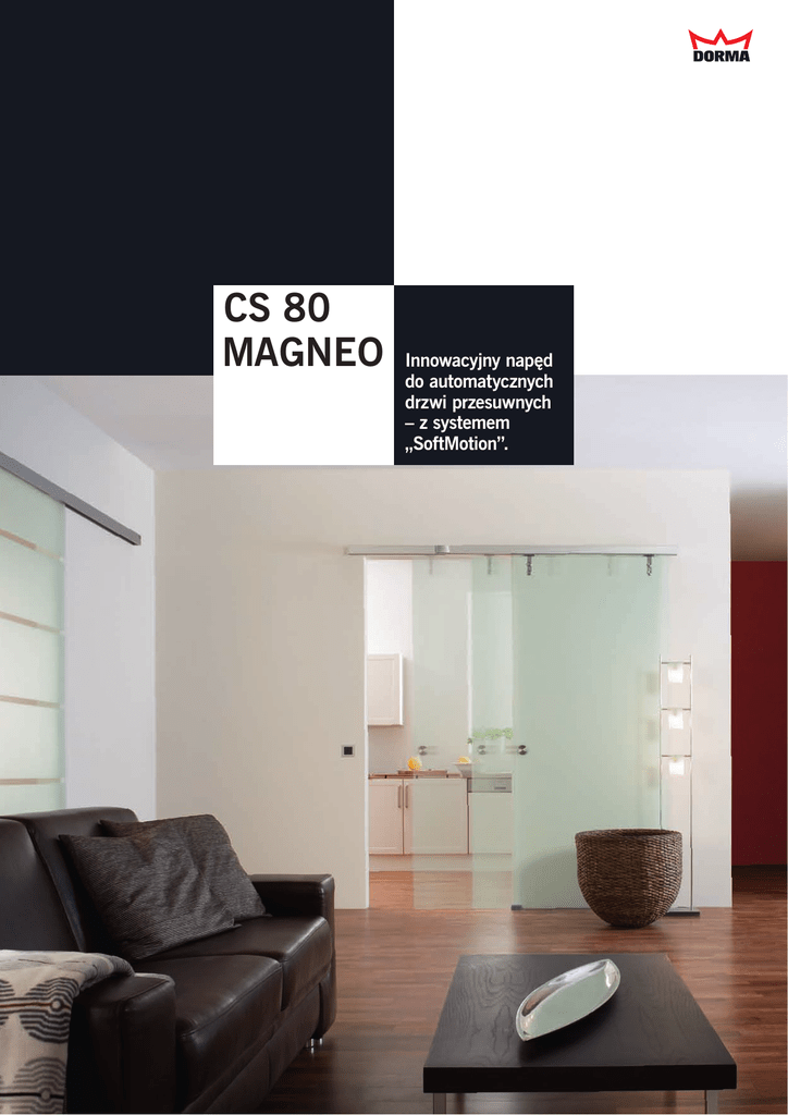 CS 80 MAGNEO Innowacyjny napęd do automatycznych drzwi przesuwnych – z systemem „SoftMotion”. Piękne drzwi przesuwne do wnętrz. Z systemem „SoftMotion”. Inteligentna technologia dla realizacji indywidualnych projektów: napęd do automatycznych drzwi przesuwnych CS MAGNEO – z systemem „SoftMotion” Lekkie dotknięcie wystarczy, aby drzwi zatrzymały się i rozpoczęły ruch w drugą stronę 2 Ekskluzywna linia stylistyczna DORMA Contur Design kryje, pod cieszącym oko wyglądem, zaawansowaną technologię na bazie rozwiązań magnetycznych dla automatycznych drzwi przesuwnych, wraz z trybem Low Energy. Drzwi pracują w niskich zakresach mocy, a dzięki temu możemy po raz pierwszy wyeliminować stosowanie do drzwi przesuwnych radarów i czujników bezpieczeństwa. Rezultat: niezwykle elegancki wygląd w połączeniu z bezpieczeństwem systemu „SoftMotion” podczas pracy w trybie energooszczędnym (Low Energy Mode). Lekkie dotknięcie wystarczy, aby drzwi zatrzymały się i rozpoczęły ruch w drugą stronę. System ten można stosować zarówno z drzwiami szklanymi, jak i drewnianymi – w każdej konfiguracji, stanowi on przyciągający wzrok element wykończenia wnętrza, czy to w prywatnym domu, czy środowiskach profesjonalnych jak gabinety, kancelarie, biura, hotele czy restauracje System „SoftMotion” Domy / Mieszkania Kancelarie prawne i biura Hotele Restauracje Kliniki i gabinety 3 Automatyczne, ciche, bezpieczne. 4 Przyciągający wzrok element wystroju każdego domu. Aby podkreślić indywidualny styl wystroju wnętrza: automatyczne drzwi przesuwne DORMA. Na zdjęciu: drzwi szklane „Telio 3” z linii produktów MAME. CS 80 MAGNEO: Specjalne wzornictwo dla prywatnych domów i mieszkań. CS 80 MAGNEO oferuje nowe możliwości, jak na przykład: g Ten innowacyjny system drzwi przesuwnych, w połączeniu z napędem automatycznym, nadaje pomieszczeniom mieszkalnym wyjątkowy charakter, uosabiający współczesne i eleganckie wzornictwo. Dzięki subtelnej i ponadczasowej stylistyce, system CS 80 MAGNEO pasuje do każdego wystroju wnętrza i może być łączony z drzwiami szklanymi lub drewnianymi. Poza atrakcyjnym wyglądem, liczne rozwiązania techniczne systemu zapewniają wysoki poziom komfortu użytkowania. Po wyposażeniu w czujnik ruchu, drzwi otwierają się i zamykają automatycznie, niemal bezgłośnie g g montaż między kuchnią i salonem montaż między salonem i holem montaż między sypialnią i łazienką 5 Zachwycające efekty w wystroju wnętrz. 6 Automatyczne drzwi o atrakcyjnym wyglądzie. CS 80 MAGNEO. Odpowiedni również dla kancelarii prawnych i biur. widziani już u progu. System CS 80 MAGNEO czyni z drzwi wizytówkę firmy. Dzięki lekkiemu i niezwykle estetycznemu wzornictwu, system CS 80 MAGNEO nadaje pomieszczeniom komercyjnym dostojnego wyrazu. Każde drzwi pracują bez nakładu siły, lekko i bezgłośnie. Automatyczny napęd do drzwi przesuwnych buduje atmosferę profesjonalizmu i oferuje wysoki komfort, a klienci i goście poczują się mile Atrakcyjne wzornictwo i technologia dla: g Kancelarii prawnych g Biur notarialnych g Biur doradztwa podatkowego g Firm audytorskich Atrakcyjne wzornictwo dla sektora małych przedsiębiorstw: CS 80 MAGNEO, tu w połączeniu z drzwiami z gładkiego szkła z linii MAME. Przejrzyste i estetyczne wzornictwo: Rozwiązania CS 80 MAGNEO są dyskretnym elementem systemów całoszklanych. 7 Estetyka i wzornictwo, które wyznaczają nowe trendy. 8 Dla wszystkich tych, którzy szukają czegoś wyjątkowego. CS 80 MAGNEO. Atrakcja ekskluzywnych hoteli. Wejście nigdy dotąd nie było tak atrakcyjne, jak przy wykorzystaniu systemu napędu do drzwi CS 80 MAGNEO. Dzięki oszczędnemu i estetycznemu wzornictwu oraz subtelnemu wyglądowi, system CS 80 MAGNEO staje się wyjątkowym elementem przyciągającym wzrok. Goście będą zafascynowani bezgłośnie otwierającymi się drzwiami. Jednak ten automatyczny system obsługi drzwi posiada znacznie więcej zalet, niż tylko wyszukane wzornictwo. CS 80 MAGNEO to pięciogwiazdkowy komfort, wygoda i przestrzeń. Szczypta elegancji: Z systemem CS 80 MAGNEO można stworzyć wygodny schowek lub garderobę. Czy system jest instalowany po raz pierwszy, czy jest później unowocześniany, instalacja to proces prosty i wygodny. Bezpieczeństwo jest zawsze najważniejsze: podczas pracy w trybie energooszczędnym (Low Enegry Mode), system wykrywa obecność osób lub przeszkód przy najlżejszym dotknięciu, co powoduje ich zatrzymanie i wycofanie. W ten sposób, CS 80 MAGNEO zapewnia komfort pod każdym względem. Wzornictwo, które inspiruje: Łazienka z okuciami linii Glamü do łazienek i system CS 80 MAGNEO. Fascynująca innowacja: System CS 80 MAGNEO wzbogaca każdy projekt wystroju wnętrza. Tutaj, w połączeniu z jednopunktowymi okuciami z linii MANET. 9 Otwarte na nowe rozwiązania. Koncepcja, która zainspiruje każdego odwiedzającego. CS 80 MAGNEO. Idealne rozwiązanie w sektorze restauracyjnym. Jednym z kluczowych sekretów odnoszących sukcesy restauracji jest umiejętność zaskakiwania gości podczas każdej ich wizyty. Osiągnąć ten efekt można dzięki ekskluzywnym rozkoszom kulinarnym, lecz również dzięki wyszukanej atmosferze, która zachęci gości do powrotu. 10 System CS 80 MAGNEO zdecydowanie poprawi komfort gości – przykładowo, zainstalowany w przejściu między recepcją a salą główną restauracji. System CS 80 MAGNEO jest również korzystny ze względów higienicznych, ponieważ przejście przez drzwi nie wymaga dotykania ich (dostęp bezdotykowy) – niezależnie od tego, czy przechodzi się pomiędzy kuchnią a restauracją czy do pomieszczeń sanitarnych. Na zdjęciu widzimy drzwi przesuwne z linii MAME ze szkłem piaskowanym, w połączeniu z napędem CS 80 MAGNEO, zainstalowane przy wejściu do pomieszczenia sanitarnego. 11 Indywidualny projekt wnętrza. Tworzenie profesjonalnego otoczenia. DORMA CS 80 MAGNEO. Wygoda i hig