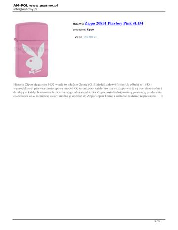 AM-POL www.usarmy.pl [email protected] nazwa Zippo 20831 Playboy Pink SLIM producent: Zippo cena: 89.00 zł Historia Zippo sięga roku 1932 wtedy to właśnie Georg'a G. Blaisdell założył firmę rok później w 1933 r wyprodukował pierwszy prototypowy model. Od tamtej pory każdy kto używa zippo wie że są one niezawodne i działają w każdych warunkach. Każda oryginalna zapalniczka Zippo posiada dożywotnią gwarancję producenta co oznacza że w momencie awarii można ją odesłać do Zippo Repair Clinic i zostanie za darmo naprawiona. 1/1
