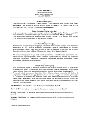 REGULAMIN AKCJI „Pakiet aplikacji od Intel” (zwany dalej „Regulaminem”) z dnia 04.12.2015 r. §1 Postanowienia ogólne 1. Organizatorem akcji pod hasłem „Pakiet Startowy Oprogramowania Intel” (zwana dalej „Akcją promocyjną”) jest Active.pl z siedzibą w Łodzi, adres: 92-116 Łódź, ul. Giewont 38A, REGON 473060843 NIP 727-110-69-84, (zwana dalej „Organizatorem”). §2 Termin i miejsce Akcji promocyjnej 1. Akcja promocyjna prowadzona jest na całym terytorium Rzeczypospolitej Polskiej we wszystkich Sklepach Saturn i w sklepie internetowym www.saturn.pl ( zwane dalej „Sklep”, „Sklepy”). 2. Czas trwania Akcji promocyjnej obejmuje okres od dnia 4.12.2015 r. od godziny 00:01 do dnia 25.02.2016r. do godziny 23:59 lub do wyczerpania zapasów. §3 Uczestnicy Akcji promocyjnej 1. Uczestnikami Akcji promocyjnej mogą być: pełnoletnie osoby fizyczne, będące konsumentami w rozumieniu art. 221 kodeksu cywilnego, posiadające miejsce zamieszkania na terytorium Rzeczpospolitej Polskie, które wezmą udział w Akcji promocyjnej i zdecydują się na zakup Produktu, o którym mowa w §4 ust. 3 Regulaminu (zwane dalej "Uczestnikami"). 2. W Akcji promocyjnej nie mogą brać udziału pracownicy i przedstawiciele Organizatora oraz członkowie ich najbliższej rodziny. Przez członków najbliższej rodziny rozumie się: wstępnych, zstępnych, rodzeństwo, małżonków, małżonków rodzeństwa, rodziców małżonków i osoby pozostające w stosunku przysposobienia. §4 Zasady Akcji promocyjnej 1. Akcją promocyjną objęte są wszystkie notebooki oraz tablety dowolnej marki (z wyłączeniem produktów firmy Apple) z procesorami firmy Intel® dostępne w trakcie trwania Akcji promocyjnej w ofercie Sklepów Saturn oraz w sklepie internetowym saturn.pl (zwane dalej „Produktami”). 2. W ramach Akcji promocyjnej Uczestnik, który dokona zakupu notebooka lub tabletu (z wyłączeniem produktów marki Apple) otrzyma kupon z kodem ukrytym pod zdrapką uprawniający do korzystania z platformy Intel Software Starter Pack od momentu rejestracji do 30.03.2016 (zwany dalej „Aplikacją”). Platforma umożliwia dostęp do bezpłatnego pobrania aplikacji lub dodatków do gier. Kupon otrzymany przez klienta zależny jest od modelu zakupionego urządzenia i procesora w nim zawartego: PREMIUM Pack – do wszystkich komputerów z procesorami Intel Core i7 Gra F1 2015 Codemasters – do wszystkich komputerów z procesorami Intel Core i5 Android Tablet Pack – do wszystkich tabletów z procesorami Intel i z systemem operacyjnym Android Windows Tablet Pack – do wszystkich tabletów z procesorami Intel i z systemem operacyjnym Windows Zawartość kuponów wchodzą: Premium Pack – World of Tank (kod aktywacyjny dla nowych graczy), Worl of Warships (dodatek w grze), Counter Strike Go (kod aktywacyjny do aplikacji Steam pozwalający na pobranie gry), Smite (gra), Magic Movie Edit Pro 2016 (aplikacja), Lego (aplikacja) Win Zip Standard Edition, Corel Paint Shop Pro x7 F1 2015 – kod zdrapka uprawniający do wygenerowania kodu bonusowego do platofmry Steam Android Tablet Pack – eDjing DJ MUSIC MIXER PRO (aplikacja), BeatBuddy (gra), Photo Director (aplikacja) oraz pakiet gier i aplikacji Free to Play Windows Tablet Pack – World of Tank (kod aktywacyjny dla nowych graczy), Lego Minifigures (gra), MAGIX Fastcut (aplikacja), Star Chart (aplikacja), ooVoo (aplikacja), Autodesk Sketchbook (aplikacja) 3. Wzór kuponów testowych stanowi załącznik nr 1 do niniejszego regulaminu. 4. Liczba kuponów promocyjnych jest ograniczona. 5. Wartość rynkowa Aplikacji wynosi - pakiet Premium Pack 500,00 zł (słownie: pięćset złotych) - gra F1 2015 Codemasters – 130,00, zł – (słownie sto trzydzieści) - pakiet Android Tablet Pack – 100 zł (słownie: sto złotych) - pakiet Windows Tablet Pack – 250 zł (słownie dwieście pięćdziesiąt złotych) na okres od momentu rejestracji do 30.03.2016. Cena Aplikacji wliczona w cenę Produktu. Po 30.10.2016 Aplikacja nieopłacona przez Uczestnika wygasa. 6. Uczestnikom Akcji promocyjnej nie przysługuje prawo do otrzymania ekwiwalentu pieniężnego w wysokości ceny Aplikacji ani zamiana Aplikacji na inny towar. 7. Uczestnik może brać udział w Akcji promocyjnej wielokrotnie, pod warunkiem każdorazowego spełnienia warunków przewidzianych w Regulaminie. 8. W przypadku zakupu Produktu w sklepie internetowym wwwsaturn.pl o udziale w Akcji promocyjnej decyduje data zawarcia umowy zawartej na odległość tj. umowa zawarta zgodnie z Regulaminem Sklepu Internetowego www.saturn.pl, Ogólnymi Warunkami Umowy Sprzedaży oraz Polityką prywatności. 9. Uczestnikom nie przysługuje prawo do zastrzeżenia szczególnych cech Produktów ani Aplikacji objętych Akcją promocyjną. 10. Wszelkie prawa zastrzeżone. Intel Inside, Intel Core, Ultrabook, Intel oraz logo Intel są znakami firmowymi firmy Intel Corporation w Stanach Zjednoczonych i/lub innych krajach. 11. Organizator nie jest operatorem strony starterpack.intel.com/softwareoffer oraz softwareoffer.intel.com 12. Akcja promocyjna może być łączona z innymi Akcjami promocyjnymi. §5 Odpowiedzialność 1. Organizator Promocji nie ponosi odpowiedzialności za niedoręczenie Nagrody z powodów niezależnych od organizatora, zależnych od sklepu czy osób trzecich. 2. Organizator nie ponosi odpowiedzialności za nieprawidłowości, związane z opóźnieniem w dystrybucji kuponów wewnątrz sieci handlowej. 3. Odpowiedzialność Organizatora ograniczona jest względem Uczestnika do wysokości zwrotu kosztów zakupu Produktu Promocyjnego. §6 Reklamacje i wymiana towarów 1. Wszelkie reklamacje winny być wysłane drogą pocztową na adres Organizatora w terminie do 30 marca 2016 r. O zachowaniu terminu do składania reklamacji decyduje data doręczenia reklamacji na adres Organizatora. 2. Pisemne reklamacje powinny zawierać imię, nazwisko, dokładny adres uczestnika jak również dokładny opis i wska
