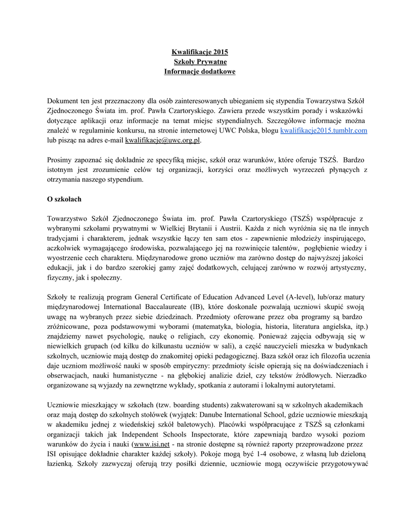 Kwalifikacje 2015 Szkoły Prywatne Informacje dodatkowe Dokument ten jest przeznaczony dla osób zainteresowanych ubieganiem się stypendia Towarzystwa Szkół Zjednoczonego Świata im. prof. Pawła Czartoryskiego. Zawiera przede wszystkim porady i wskazówki dotyczące aplikacji oraz informacje na temat miejsc stypendialnych. Szczegółowe informacje można znaleźć w regulaminie konkursu, na stronie internetowej UWC Polska, blogu kwalifikacje2015.tumblr.com lub pisząc na adres email [email protected]. Prosimy zapoznać się dokładnie ze specyfiką miejsc, szkół oraz warunków, które oferuje TSZŚ. Bardzo istotnym jest zrozumienie celów tej organizacji, korzyści oraz możliwych wyrzeczeń płynących z otrzymania naszego stypendium. O szkołach Towarzystwo Szkół Zjednoczonego Świata im. prof. Pawła Czartoryskiego (TSZŚ) współpracuje z wybranymi szkołami prywatnymi w Wielkiej Brytanii i Austrii. Każda z nich wyróżnia się na tle innych tradycjami i charakterem, jednak wszystkie łączy ten sam etos zapewnienie młodzieży inspirującego, aczkolwiek wymagającego środowiska, pozwalającego jej na rozwinięcie talentów, pogłębienie wiedzy i wyostrzenie cech charakteru. Międzynarodowe grono uczniów ma zarówno dostęp do najwyższej jakości edukacji, jak i do bardzo szerokiej gamy zajęć dodatkowych, celującej zarówno w rozwój artystyczny, fizyczny, jak i społeczny. Szkoły te realizują program General Certificate of Education Advanced Level (Alevel), lub/oraz matury międzynarodowej International Baccalaureate (IB), które doskonale pozwalają uczniowi skupić swoją uwagę na wybranych przez siebie dziedzinach. Przedmioty oferowane przez oba programy są bardzo zróżnicowane, poza podstawowymi wyborami (matematyka, biologia, historia, literatura angielska, itp.) znajdziemy nawet psychologię, naukę o religiach, czy ekonomię. Ponieważ zajęcia odbywają się w niewielkich grupach (od kilku do kilkunastu uczniów w sali), a część nauczycieli mieszka w budynkach szkolnych, uczniowie mają dostęp do znakomitej opieki pedagogicznej. Baza szkół oraz ich filozofia uczenia daje uczniom możliwość nauki w sposób empiryczny: przedmioty ścisłe opierają się na doświadczeniach i obserwacjach, nauki humanistyczne na głębokiej analizie dzieł, czy tekstów źródłowych. Nierzadko organizowane są wyjazdy na zewnętrzne wykłady, spotkania z autorami i lokalnymi autorytetami. Uczniowie mieszkający w szkołach (tzw. boarding students) zakwaterowani są w szkolnych akademikach oraz mają dostęp do szkolnych stołówek (wyjątek: Danube International School, gdzie uczniowie mieszkają w akademiku jednej z wiedeńskiej szkół baletowych). Placówki współpracujące z TSZŚ są członkami organizacji takich jak Independent Schools Inspectorate, które zapewniają bardzo wysoki poziom warunków do życia i nauki (www.isi.net na stronie dostępne są również raporty przeprowadzone przez ISI opisujące dokładnie charakter każdej szkoły). Pokoje mogą być 14 osobowe, z własną lub dzieloną łazienką. Szkoły zazwyczaj oferują trzy posiłki dziennie, uczniowie mogą oczywiście przygotowywać przekąski lub gotować we własnym zakresie. O formularzu porady dla kandydatów Wskazówki i porady: Formularz zgłoszeniowy stanowi medium, które nie pozwala z łatwością ani przekazać, ani odebrać dokładnego obrazu drugiej osoby. Co więcej, formularz ogranicza długość odpowiedzi na dane pytania i wymaga odpowiedniej zwartości wypowiedzi. Oznacza to, że aby efektywnie przedstawić swoją kandydaturę należy wykorzystywać miejsce w sposób przemyślany. Podstawowymi błędami jest powtarzanie się (np. ponowne wymienianie zajęć dodatkowych lub osiągnięć w eseju) i niepotrzebne rozpisywanie na tematy nieodnoszące się bezpośrednio do Waszej aplikacji. Część III daje wyraźny obraz Waszych zainteresowań akademickich i pozaszkolnych. Dodatkowo pozwala nam zrozumieć jak wykorzystujecie swój potencjał i czas. Części IV i V są najważniejszymi w całej aplikacji, ponieważ tylko one pozwalają komisjom poznać Wasze rozumowanie, cechy charakteru, marzenia, itd. Istotną częścią stypendium jest mieszkanie w obcym kraju i nauka jego oficjalnego języka, przez co nie wymagamy doskonałej znajomości j. angielskiego. Warto dodać, że choć zdecydowana większość kandydatów wybiera formę klasycznego eseju w części V, zdarzają się choć bardzo rzadko aplikanci, którzy sięgają po inne formy literackie. Prosimy pamiętać, że komisje sprawdzają wszystkie prace przede wszystkim pod względem merytorycznym. Wysłanie listu aplikacyjnego pisanego wierszem nie wpłynie na lepszą ocenę pracy. Uwagi praktyczne: III.1: nazwy konkursów prosimy podawać w następujący sposób: domena konkursu, rezultat, zasięg, rok, polska nazwa konkursu, np. a) Mathematics, Gold medal, national, 2014, Olimpiada Matematyczna Gimnazjalistów; b) Chemistry, laureate/finalist, voivodeship, 2013, Konkurs Przedmiotowy z Chemii. III.1, III.2: odwoływanie się do osiągnięć, zajęć dodatkowych, itd. z czasów gimnazjum jest jak najbardziej wskazane, a wręcz pożądane; odwoływanie się do osiągnięć i zajęć dodatkowych ze szkoły podstawowej nie jest zabronione, lecz może dawać lekko rozmyty obraz kandydata. III, IV, V: jako słowo w częściach IIIV liczymy każdy wyraz oddzielony od innego spacją IV, V: część IV jest skonstruowana w taki sposób, aby poznać Wasze kreatywne myślenie, reagowanie na nieszablonowe tematy, zrozumieć choć po części motywy Wami kierujące. Dobrą odpowiedzią na pytanie części IV jest taka, która będzie indywidualna i szczera. Część V to list motywacyjny najlepsze miejsce do przekazania komisjom, dlaczego to Was powinni wybrać. To też najlepsze miejsce na to, aby wyjaśnić wszystkie istotne sprawy, które mogliście jedynie wymienić w formularzu, a nie odpowiednio się do nich odnieść. W d