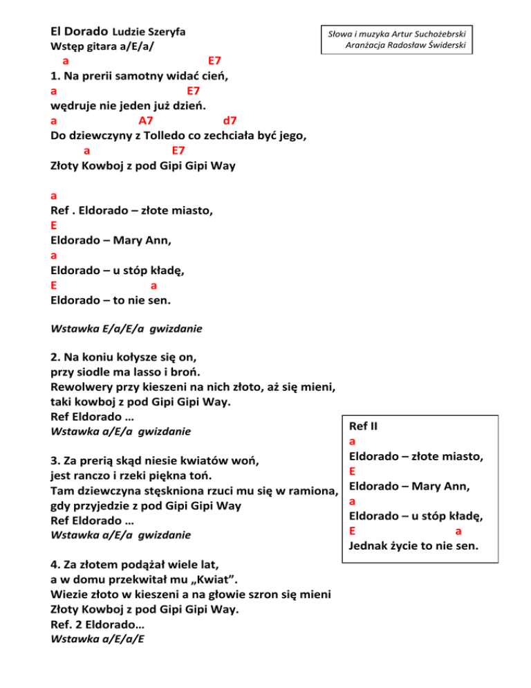 El Dorado Ludzie Szeryfa Wstęp gitara a/E/a/ Słowa i muzyka Artur Suchożebrski Aranżacja Radosław Świderski a E7 1. Na prerii samotny widać cień, a E7 wędruje nie jeden już dzień. a A7 d7 Do dziewczyny z Tolledo co zechciała być jego, a E7 Złoty Kowboj z pod Gipi Gipi Way a Ref . Eldorado – złote miasto, E Eldorado – Mary Ann, a Eldorado – u stóp kładę, E a Eldorado – to nie sen. Wstawka E/a/E/a gwizdanie 2. Na koniu kołysze się on, przy siodle ma lasso i broń. Rewolwery przy kieszeni na nich złoto, aż się mieni, taki kowboj z pod Gipi Gipi Way. Ref Eldorado … Ref II a Eldorado – złote miasto, 3. Za prerią skąd niesie kwiatów woń, E jest ranczo i rzeki piękna toń. Tam dziewczyna stęskniona rzuci mu się w ramiona, Eldorado – Mary Ann, a gdy przyjedzie z pod Gipi Gipi Way Eldorado – u stóp kładę, Ref Eldorado … E a Wstawka a/E/a gwizdanie Jednak życie to nie sen. Wstawka a/E/a gwizdanie 4. Za złotem podążał wiele lat, a w domu przekwitał mu „Kwiat”. Wiezie złoto w kieszeni a na głowie szron się mieni Złoty Kowboj z pod Gipi Gipi Way. Ref. 2 Eldorado… Wstawka a/E/a/E