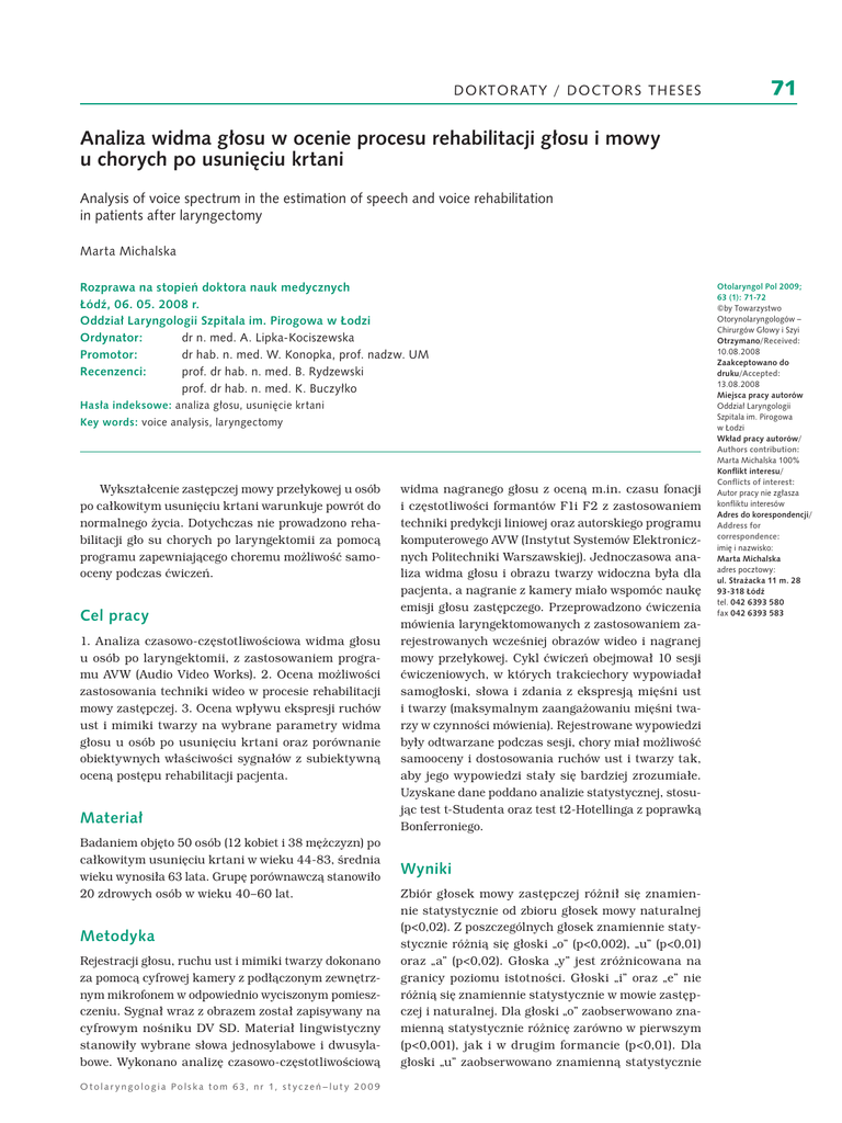Analiza widma glosu w ocenie procesu rehabilitacji glosu i mowy u
