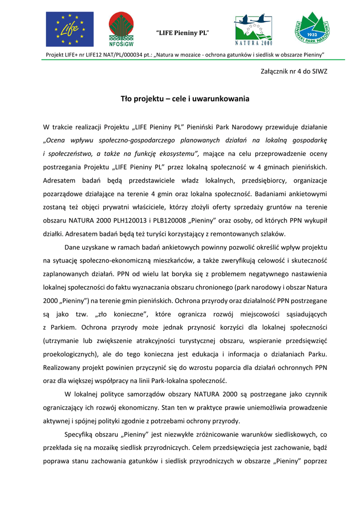 “LIFE Pieniny PL” Projekt LIFE+ nr LIFE12 NAT/PL/000034 pt.: „Natura w mozaice - ochrona gatunków i siedlisk w obszarze Pieniny” Załącznik nr 4 do SIWZ Tło projektu – cele i uwarunkowania W trakcie realizacji Projektu „LIFE Pieniny PL” Pieniński Park Narodowy przewiduje działanie „Ocena wpływu społeczno-gospodarczego planowanych działań na lokalną gospodarkę i społeczeństwo, a także na funkcję ekosystemu”, mające na celu przeprowadzenie oceny postrzegania Projektu „LIFE Pieniny PL” przez lokalną społeczność w 4 gminach pienińskich. Adresatem badań będą przedstawiciele władz lokalnych, przedsiębiorcy, organizacje pozarządowe działające na terenie 4 gmin oraz lokalna społeczność. Badaniami ankietowymi zostaną też objęci prywatni właściciele, którzy złożyli oferty sprzedaży gruntów na terenie obszaru NATURA 2000 PLH120013 i PLB120008 „Pieniny” oraz osoby, od których PPN wykupił działki. Adresatem badań będą też turyści korzystający z remontowanych szlaków. Dane uzyskane w ramach badań ankietowych powinny pozwolić określić wpływ projektu na sytuację społeczno-ekonomiczną mieszkańców, a także zweryfikują celowość i skuteczność zaplanowanych działań. PPN od wielu lat boryka się z problemem negatywnego nastawienia lokalnej społeczności do faktu wyznaczania obszaru chronionego (park narodowy i obszar Natura 2000 „Pieniny”) na terenie gmin pienińskich. Ochrona przyrody oraz działalność PPN postrzegane są jako tzw. „zło konieczne”, które ogranicza rozwój miejscowości sąsiadujących z Parkiem. Ochrona przyrody może jednak przynosić korzyści dla lokalnej społeczności (utrzymanie lub zwiększenie atrakcyjności turystycznej obszaru, wspieranie przedsięwzięć proekologicznych), ale do tego konieczna jest edukacja i informacja o działaniach Parku. Realizowany projekt powinien przyczynić się do wzrostu poparcia dla działań ochronnych PPN oraz dla większej współpracy na linii Park-lokalna społeczność. W lokalnej polityce samorządów obszary NATURA 2000 są postrzegane jako czynnik ograniczający ich rozwój ekonomiczny. Stan ten w praktyce prawie uniemożliwia prowadzenie aktywnej i spójnej polityki zgodnie z potrzebami ochrony przyrody. Specyfiką obszaru „Pieniny” jest niezwykłe zróżnicowanie warunków siedliskowych, co przekłada się na mozaikę siedlisk przyrodniczych. Celem przedsięwzięcia jest zachowanie, bądź poprawa stanu zachowania gatunków i siedlisk przyrodniczych w obszarze „Pieniny” poprzez “LIFE Pieniny PL” Projekt LIFE+ nr LIFE12 NAT/PL/000034 pt.: „Natura w mozaice - ochrona gatunków i siedlisk w obszarze Pieniny” zróżnicowane działania ochronne. Duża część gruntów na obszarze „Pieniny” nie jest własnością Skarbu Państwa, lecz należy do innych właścicieli. Grunty Skarbu Państwa w obszarze „Pieniny” stanowią 59%; grunty innej własności (gminne i prywatne) zajmują 41%. Nadzorujący obszarem Natura 2000 (Pieniński PN) nie ma realnego wpływu na zasady gospodarowania na gruntach prywatnych, a prowadzenie działań ochronnych na gruntach obcych własności jest utrudnione i dlatego jednym z głównych celów projektu jest wykup gruntów przez PPN. W ramach projektu „LIFE Pieniny PL” zaplanowano działania organizacyjne – pozyskanie gruntów na cele ochrony przyrody, ochronne – zabiegi bezpośrednio w obrębie różnego typu ekosystemów (leśnych i nieleśnych) oraz edukacyjno-promocyjne w otoczeniu społecznym obszaru. Wszystkie działania są odpowiedzią na istniejące zagrożenia i problemy w realizowaniu ochrony przyrody obszaru „Pieniny” i są oparte o wcześniej nabyte doświadczenia z realizacji licznych, często pilotażowych projektów w tej części Pienin. W ramach realizacji projektu planuje się: 1. Zwiększenie możliwości prowadzenia zabiegów ochronnych, wyłączenie z gospodarczego wykorzystania lasów poprzez wykup gruntów prywatnych. Planuje się zaniechanie użytkowania gospodarczego w ok. 16 ha lasów na gruntach wykupionych od właścicieli prywatnych. 2. Zahamowanie sukcesji na nieużytkowanych ekosystemach górskich łąk świeżych (wykształconych w efekcie prowadzenia przez setki lat tradycyjnej i zrównoważonej gospodarki rolnej) oraz zanikania rzadkich gatunków roślin i zwierząt na murawach kserotermicznych przez wprowadzanie odpowiednio dobranych zabiegów ochronnych (np. odkrzaczanie, usuwanie nagromadzonej warstwy nierozłożonych roślin – tzw. wojłok roślinny, koszenie i usuwanie biomasy). Planuje się objęcie zabiegami ochronnymi ok. 24 ha łąk na gruntach wykupionych od właścicieli prywatnych oraz zahamowanie procesu naturalnej sukcesji na 8 ha muraw kserotermicznych. 3. Ograniczenie negatywnego wpływu ruchu turystycznego na siedliska przyrodnicze poprzez jego uporządkowanie (remont nawierzchni szlaków i zastosowanie zabezpieczeń przed skracaniem zakosów, schodzeniem ze szlaków). Planuje się ograniczenie tego negatywnego wpływu wzdłuż szlaków turystycznych na długości 1 260 mb. “LIFE Pieniny PL” Projekt LIFE+ nr LIFE12 NAT/PL/000034 pt.: „Natura w mozaice - ochrona gatunków i siedlisk w obszarze Pieniny” 4. Zabezpieczenie przed zniszczeniem populacji pszonaka pienińskiego w obrębie wzgórza zamkowego w Czorsztynie (największe stanowisko tego endemicznego gatunku) poprzez zabezpieczenie fragmentów murów zewnętrznych zamku, oczyszczenie murawy kserotermicznej z części krzewów i wysokich bylin oraz wzmocnienie populacji. Planuje się poprawę warunków siedliskowych w obrębie wzgórza zamkowego na powierzchni ok. 0,5 ha. 5. Usuwanie obcych gatunków inwazyjnych – wyrywanie i niszczenie pędów rdestowca ostrokończystego i sachalińskiego wzdłuż brzegów rzeki Dunajec. Planuje się znaczne ograniczenie (o około 50-80 %) populacji dwóch gatunków obcego pochodzenia na terenie obszaru „Pieniny”. 6. Ochrona