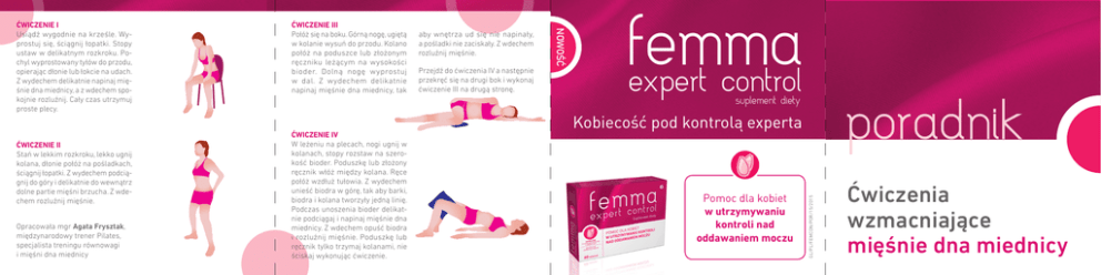 Opracowała mgr Agata Frysztak, międzynarodowy trener Pilates, specjalista treningu równowagi i mięśni dna miednicy aby wnętrza ud się nie napinały, a pośladki nie zaciskały. Z wdechem rozluźnij mięśnie. Przejdź do ćwiczenia IV a następnie przekręć się na drugi bok i wykonaj ćwiczenie III na drugą stronę. femma expert control suplement diety ĆWICZENIE IV W leżeniu na plecach, nogi ugnij w kolanach, stopy rozstaw na szerokość bioder. Poduszkę lub złożony ręcznik włóż między kolana. Ręce połóż wzdłuż tułowia. Z wydechem unieść biodra w górę, tak aby barki, biodra i kolana tworzyły jedną linię. Podczas unoszenia bioder delikatnie podciągaj i napinaj mięśnie dna miednicy. Z wdechem opuść biodra i rozluźnij mięśnie. Poduszkę lub ręcznik tylko trzymaj kolanami, nie ściskaj wykonując ćwiczenie. poradnik Kobiecość pod kontrolą experta Pomoc dla kobiet w utrzymywaniu kontroli nad oddawaniem moczu GL/PL/FEMCON/POR/15/2015 ĆWICZENIE II Stań w lekkim rozkroku, lekko ugnij kolana, dłonie połóż na pośladkach, ściągnij łopatki. Z wydechem podciągnij do góry i delikatnie do wewnątrz dolne partie mięśni brzucha. Z wdechem rozluźnij mięśnie. ĆWICZENIE III Połóż się na boku. Górną nogę, ugiętą w kolanie wysuń do przodu. Kolano połóż na poduszce lub złożonym ręczniku leżącym na wysokości bioder. Dolną nogę wyprostuj w dal. Z wydechem delikatnie napinaj mięśnie dna miednicy, tak NOWOŚĆ ĆWICZENIE I Usiądź wygodnie na krześle. Wyprostuj się, ściągnij łopatki. Stopy ustaw w delikatnym rozkroku. Pochyl wyprostowany tyłów do przodu, opierając dłonie lub łokcie na udach. Z wydechem delikatnie napinaj mięśnie dna miednicy, a z wdechem spokojnie rozluźnij. Cały czas utrzymuj proste plecy. Ćwiczenia wzmacniające mięśnie dna miednicy Dlaczego warto ćwiczyć mięśnie dna miednicy? Jak zlokalizować mięśnie dna miednicy? Każda z nas powinna wykonywać ćwiczenia mięśni dna miednicy tzw. ćwiczenia Kegla. Trening tych mięśni chroni przed problemem nietrzymania moczu oraz obniżania się narządów rodnych u kobiet. Mięśnie te stanowią podparcie dla organów znajdujących się w miednicy, chronią cewkowe/ odbytnicze zamknięcie podczas wykonywania różnych aktywności. Jednocześnie stabilizują kręgosłup, zwłaszcza jego dolny odcinek oraz wspomagają funkcje seksualne. Mięśnie dna miednicy znajdują się między kością ogonową, a łonową. Wiele kobiet ma problem ze zlokalizowaniem mięśni dna miednicy co może prowadzić do nieprawidłowego wykonywania ćwiczeń Kegla. W związku z tym przed rozpoczęciem treningu pomożemy Ci je odnaleźć. Spróbuj wizualizacji które ułatwią Ci odnalezienie mięśni dna miednicy i pomogą w zrozumieniu ich pracy podczas ćwiczeń. Zrób następujący test: Pamiętaj! Napinaniu mięśni dna miednicy nie powinny towarzyszyć żadne ruchy innych części ciała, np. pośladków czy wewnętrznych mięśni ud. Nie należy również wstrzymywać oddechu. Test na nietrzymanie moczu. Czy masz problemy z nietrzymaniem moczu? Ćwiczenia wzmacniające mięśnie dna miednicy: 1. Czy korzystasz z toalety więcej niż 7 razy w ciągu dnia? 1. Przyjmij wygodną pozycję, ćwicz w wygodnym, niekrępującym ruchów ubraniu, na niezbyt miękkiej powierzchni, 2. Czy korzystasz z toalety kilka razy w nocy? 3. Czy zdarza Ci się biec do toalety wskutek nagłej potrzeby oddania moczu? Ćwiczenie mięśni dna miednicy to inwestycja na lata, która się opłaca „Słomka z wodą” Wyobraź sobie słomkę, która znajduje się w Twojej pochwie. Przez słomkę staraj się zassać ciecz do środka. Mięśnie dna miednicy mają osiągnąć takie napięcie, które spowoduje, że przez słomkę zostanie ciecz zassana – pomyśl o tym, w taki sposób jak zasysasz napój, pijąc przez słomkę i w podobny sposób aktywuj mięśnie dna miednicy „Suwak” Wyobraź sobie suwak, tak jak w spodniach, który zaczyna się pomiędzy zwieraczami cewki moczowej i odbytu i idzie ku górze, aż do pępka. Z wydechem wyobraź sobie, że zapinasz suwak do góry i jednocześnie, ale bardzo delikatnie, przybliżasz go do kręgosłupa. Napięcie idzie w dwóch kierunkach: na górę i w tył ku kręgosłupowi. Powyżej 4 odpowiedzi TAK: Oznaczają, że Twoje dolegliwości są poważne i jak najszybciej powinnaś winnaś naś udać się do lekarza ginekologa lub urologa. 4. Czy zdarza się, że nie utrzymasz moczu przed dojściem do toalety? 5. Czy ostatnio zdarzyło Ci się popuścić mocz, gdy kichnęłaś, kaszlnęłaś, roześmiałaś się lub uprawiałaś sport? Co najmniej 1 odpowiedź TAK: Zwróć większą uwagę na swoją kondycję, a zwłaszcza na mięśnie dna miednicy. Policz ile raz dziennie chodzisz do toalety. Zobacz jak Twój pęcherz reaguje na większą ilość płynów. 2 lub 3 odpowiedzi TAK: To mogą być pierwsze objawy nietrzymania moczu. Zacznij regularnie ćwiczyć, by zadbać o kondycję mięśni dna miednicy. Kolejnym krokiem powinna być również konsultacja z lekarzem. 2. Jedna seria dla ćwiczeń mięśni dna miednicy to 8-10 powtórzeń, najlepsze rezultaty przynoszą regularne ćwiczenia 2-3 razy dziennie, 3. W trakcie ćwiczeń oddychaj naturalnie, nie wstrzymuj powietrza podczas napinania mięśni, 4. Jeśli podczas ćwiczeń poczujesz, że coraz słabiej zaciskasz mięśnie, przerwij trening i wróć do niego za jakiś czas, 5. Jeśli poczujesz napięcie w dole brzucha, zmniejsz intensywność ćwiczeń. Przed przystąpieniem do ćwiczeń przygotuj sobie niedużą poduszkę lub ręcznik