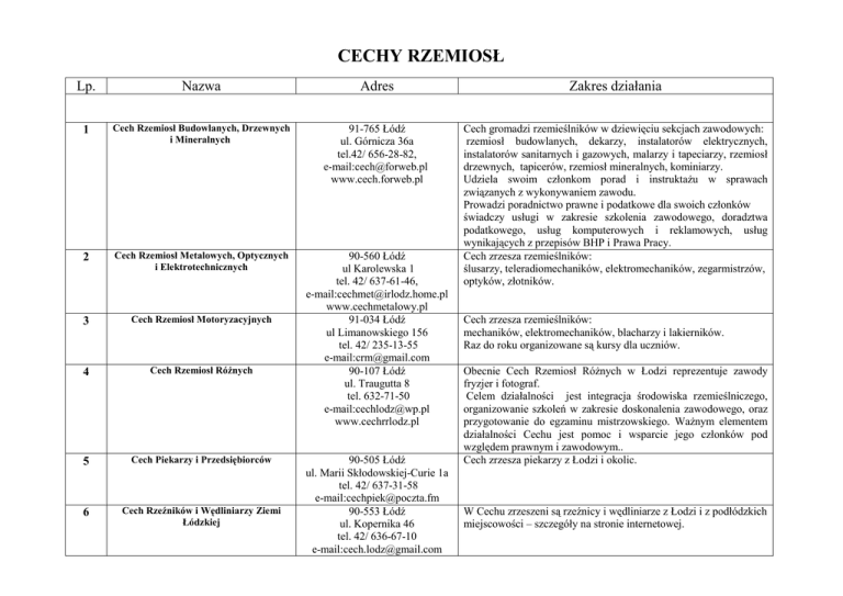 CECHY RZEMIOSŁ Lp. Nazwa Adres Zakres działania 1 Cech Rzemiosł Budowlanych, Drzewnych i Mineralnych 91-765 Łódź ul. Górnicza 36a tel.42/ 656-28-82, e-mail:[email protected] www.cech.forweb.pl 2 Cech Rzemiosł Metalowych, Optycznych i Elektrotechnicznych 3 Cech Rzemiosł Motoryzacyjnych 4 Cech Rzemiosł Różnych 90-560 Łódź ul Karolewska 1 tel. 42/ 637-61-46, e-mail:[email protected] www.cechmetalowy.pl 91-034 Łódź ul Limanowskiego 156 tel. 42/ 235-13-55 e-mail:[email protected] 90-107 Łódź ul. Traugutta 8 tel. 632-71-50 e-mail:[email protected] www.cechrrlodz.pl Cech gromadzi rzemieślników w dziewięciu sekcjach zawodowych: rzemiosł budowlanych, dekarzy, instalatorów elektrycznych, instalatorów sanitarnych i gazowych, malarzy i tapeciarzy, rzemiosł drzewnych, tapicerów, rzemiosł mineralnych, kominiarzy. Udziela swoim członkom porad i instruktażu w sprawach związanych z wykonywaniem zawodu. Prowadzi poradnictwo prawne i podatkowe dla swoich członków świadczy usługi w zakresie szkolenia zawodowego, doradztwa podatkowego, usług komputerowych i reklamowych, usług wynikających z przepisów BHP i Prawa Pracy. Cech zrzesza rzemieślników: ślusarzy, teleradiomechaników, elektromechaników, zegarmistrzów, optyków, złotników. 5 Cech Piekarzy i Przedsiębiorców 6 Cech Rzeźników i Wędliniarzy Ziemi Łódzkiej 90-505 Łódź ul. Marii Skłodowskiej-Curie 1a tel. 42/ 637-31-58 e-mail:[email protected] 90-553 Łódź ul. Kopernika 46 tel. 42/ 636-67-10 e-mail:[email protected] Cech zrzesza rzemieślników: mechaników, elektromechaników, blacharzy i lakierników. Raz do roku organizowane są kursy dla uczniów. Obecnie Cech Rzemiosł Różnych w Łodzi reprezentuje zawody fryzjer i fotograf. Celem działalności jest integracja środowiska rzemieślniczego, organizowanie szkoleń w zakresie doskonalenia zawodowego, oraz przygotowanie do egzaminu mistrzowskiego. Ważnym elementem działalności Cechu jest pomoc i wsparcie jego członków pod względem prawnym i zawodowym.. Cech zrzesza piekarzy z Łodzi i okolic. W Cechu zrzeszeni są rzeźnicy i wędliniarze z Łodzi i z podłódzkich miejscowości – szczegóły na stronie internetowej. 7 Cech Cukierników 8 Cech Rzemiosł Różnych w Pabianicach 9 Cech Rzemiosł Różnych w Zgierzu 10 Cech Rzemieślników i Przedsiębiorców w Głownie 11 Polski Cech Psychotroniczny www.cechlodz.pl.tl 92-104 Łódź ul. Taternicza 8 tel. 42/ 679-54-62 e-mail: [email protected] 95-200 Pabianice ul Stary Rynek 4 tel. 42/ 215-23-59 , 509 584 515 e-mail:[email protected] www.cechpabianice.pl 95-100 Zgierz ul. Armii Krajowej 2 tel. 42/ 716-20-13 95-015 Głowno ul. Zgierska 4 tel. 42/ 719-15-18 90-107 Łódź ul. Traugutta 8 tel. 42/ 632-13-32 tel. kom. 606 766 933, 601 328 282 e-mail:[email protected] www.pcp-rzemioslo.pl W Cechu zrzeszeni są cukiernicy z Łodzi i okolic. Obecnie Cech prowadzi następujące działania na rzecz rzemieślników: -reprezentowanie interesów rzemiosła wobec organów władzy lokalnej, urzędów i instytucji, -doradztwo prawne i z zakresu bhp, -nadzór nad szkoleniem zawodowym młodocianych obejmujący szereg spraw związanych z zatrudnieniem uczniów, -organizowanie kursów bhp dla pracodawców i uczniów, -prowadzenie rozliczeń ZUS i spraw kadrowo-płacowych, -współpraca z OHP Łódź w zakresie refundacji, -współpraca z urzędami miast i gmin w zakresie dofinansowania, -rozpatrywanie skarg i wniosków, -spotkanie z członkami Klubu Seniora, -organizacja imprez okolicznościowych i spotkań rzemieślników. Cech prowadzi działalność w różnorodną zakresie rzemiosła oraz usług. Cech zrzesza członków z miasta Zgierza, gmin ościennych oraz miasta Łodzi. Cech zrzesza członków z Głowna i okolic. Cech jest samorządną społeczno–zawodową i gospodarczą organizacją skupiającą rzemieślników prowadzących działalność w zakresie naturoterapii: bioenergoterapeuta, radiesteta, biomasażysta, refleksolog, astrolog i inne, zrzeszającą dobrowolnie członków z całego kraju. Do kluczowych zadań Cechu należy utrwalanie więzi środowiskowych, postaw zgodnych z zasadami etyki i powagi zawodu, organizowanie na rzecz członków działalności kulturalno– oświatowej i gospodarczej, podnoszenie kwalifikacji, a także reprezentowanie członków wobec organów władzy i administracji państwowej. Cech prowadzi działalność na terenie całego kraju, a podstawą jego funkcjonowania jest Statut Cechu. 12 Spółdzielnia Rzemieślnicza „Budowlana” 13 Izba Rzemieślnicza w Łodzi 91-765 Łódź ul. Górnicza 30/36 tel. 42/ 656-20-16 fax. 42/ 656-10-14 email:[email protected] ul. Moniuszki 8 90-111 Łódź tel. 42/ 632 55 81 fax. 42/ 632 37 76 email:[email protected] www.izbarzem.eu Cech zajmuje się organizacją kursów zawodowych – bioenergoterapia i radiestezja, dających uprawnienia państwowe (stopień czeladnika lub mistrza). Ponadto w siedzibie Cechu przeprowadzanych jest wiele innych szkoleń nie tylko z zakresu naturoterapii. Regularnie odbywają się odczyty, których celem jest promowanie między innymi zdrowego stylu życia, ochrony środowiska oraz przekazanie osobom zainteresowanym wiedzy z zakresu naturoterapii. Wykonywane są weryfikacje uzdolnień bioenergoterapeutycznych i radiestezyjnych, wydawane certyfikaty jakości pracy. Organizowane są ogólnopolskie zjazdy integracyjne oraz seminaria. Działania statutowe. Izba Rzemieślnicza w Łodzi jest społeczno-zawodową organizacją samorządu gospodarczego rzemiosła i związkiem pracodawców. Do podstawowych zadań Izby należy reprezentowanie i ochrona interesów środowiska rzemieślniczego, reprezentowanie zrzeszonych organizacji ( cechy, spółdzielnie rzemieślnicze z okręgu łódzkiego, piotrkowskiego, sieradzkiego i skierniewickiego) i ich członków wobec organów administracji państwowej i samorządu terytorialnego a także współpraca z innymi organizacjami samorządowymi i gospodarczymi we wszys