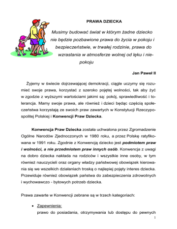PRAWA DZIECKA Musimy budować świat w którym żadne dziecko nie będzie pozbawione prawa do życia w pokoju i bezpieczeństwie, w trwałej rodzinie, prawa do wzrastania w atmosferze wolnej od lęku i niepokoju Jan Paweł II Żyjemy w świecie dojrzewającej demokracji, ciągle uczymy się rozumieć swoje prawa, korzystać z szeroko pojętej wolności, tak aby żyć w zgodzie z wyższymi wartościami jakimi są: pokój, sprawiedliwość i tolerancja. Mamy swoje prawa, ale również i dzieci będąc częścią społeczeństwa korzystają ze swoich praw zawartych w Konstytucji Rzeczypospolitej Polskiej i Konwencji Praw Dziecka. Konwencja Praw Dziecka została uchwalona przez Zgromadzenie Ogólne Narodów Zjednoczonych w 1980 roku, a przez Polskę ratyfikowana w 1991 roku. Zgodnie z Konwencją dziecko jest podmiotem praw i wolności, a nie przedmiotem praw innych osób. Konwencja z uwagi na dobro dziecka nakłada na rodziców i wszystkie inne osoby, w tym również nauczycieli oraz organy władzy państwowej obowiązek kierowania się we wszelkich działaniach troską o najlepiej pojęty interes dziecka. Przewiduje również obowiązek państwa do zabezpieczenia zdrowotnych i wychowawczo - bytowych potrzeb dziecka. Prawa zawarte w Konwencji zebrane są w trzech kategoriach: Zapewnienia: prawo do posiadania, otrzymywania lub dostępu do pewnych 1 dóbr i świadczeń np. imienia, obywatelstwa, opieki zdrowotnej edukacji, odpoczynku, zabawy, prawo do opieki nad sierotami i osobami niepełnosprawnymi, ochrony: prawo do ochrony przed szkodliwymi działaniami i praktykami np.: separacji od rodziców, zaangażowania w działania wojenne, handlowego i seksualnego wykorzystywania, fizycznej i psychicznej przemocy wobec dziecka uczestnictwa: prawo dziecka do bycia wysłuchanym przy podejmowaniu decyzji dotyczących jego życia. Wraz z rozwojem umiejętności dziecko powinno mieć rosnące możliwości brania udziału w życiu społecznym. Konwencja przypomina również znaczenie rodziny dla harmonijnego rozwoju dziecka. Rodzice winni zapewnić dziecku jak najlepsze warunki rozwoju w pełnej akceptacji, zrozumieniu, w poszanowaniu jego godności osobistej. W poczuciu więzi rodzinnej, w atmosferze miłości i wzajemnej tolerancji dziecko uczy się dostrzegać świat poprzez pryzmat właściwie rozumianej wolności i sprawiedliwości. Czu- je się kochane i ważne, ale również rozumie ważność innych i ich potrzeby. Negatywnym zjawiskiem jest przemoc dorosłych wobec dzieci. Nie należy więc być na to obojętnym. Nauczyciele przedszkoli i szkół także ponoszą odpowiedzialność za przyszłe losy swoich wychowanków. Wyposażając dzieci w odpowiednie umiejętności, wiedzę oraz postawy, już od najmłodszych lat uświadamiają im, jak ważne są prawa dziecka, dlaczego powinny być przestrzegane i chronione. 2 Im wcześniej dziecko styka się z wartościami wyższymi takimi, jak: sprawiedliwość, tolerancja, poszanowanie godności i wolności innych, tym łatwiej podlega procesowi socjalizacji. Uczenie poszanowania praw innych i radzenia sobie w sytuacjach naruszania praw własnych, jest elementem wychowania przygotowującego do życia w społeczeństwie demokratycznym. Dnia 7 lipca 2006 r. minie 15 lat od chwili, kiedy w Polsce zaczęła obowiązywać Konwencja o Prawach Dziecka. Polska była jednym z inicjatorów Konwencji i przystąpiła do niej jako jedno z pierwszych państw, jednakże dość długi proces ratyfikacji spowodował, że stała się ona faktem dopiero w lipcu 1991 r., mimo że Zgromadzenie Ogólne Narodów Zjednoczonych przyjęło ją 20 listopada 1989 r. Konwencja dotyczy dzieci i młodzieży od urodzenia do 18 roku życia, dlatego też często bywa nazywana Światową Konstytucją Praw Dziecka. Ustanawia ona status dziecka oparty na następujących założeniach: 1. Dziecko jest samodzielnym podmiotem, jednakże ze względu na swoją naturalną niedojrzałość fizyczną i psychiczną powinno być otoczone szczególną opieką wychowawczą i ochroną prawną. 2. Dziecku należy się poszanowanie przede wszystkim jego tożsamości, godności i prywatności. 3. Państwo powinno wspierać rodzinę, a nie wyręczać jej w jej funkcjonowaniu. Tworząc system ochrony dziecka, kierowano się następującymi zasadami: działania na rzecz dziecka są podejmowane w jego najlepiej pojętym interesie 3 wszystkie dzieci są równe wobec prawa dzieci mają prawo do optymalnego rozwoju i wychowania państwo zapewnia odpowiednie warunki socjalne i zdrowotne rodzinom. Prawa dziecka zawarte w Konwencji obejmują: Prawa i wolności osobiste: do życia, rozwoju, tożsamości (nazwisko, imię, obywatelstwo, wiedza o swoim pochodzeniu), prywatności, godności, szacunku, nietykalności osobistej, wyznawania własnych poglądów, religii, występowania we własnym imieniu w sprawach administracyjnych i sądowych, do wychowania w rodzinie i kontaktów z rodzicami w przypadku rozłączenia z nimi, do wolności od przemocy fizycznej i psychicznej, wyzysku, nadużyć seksualnych i wszelkiego okrucieństwa, nierekrutowania do wojska poniżej 15. roku życia. Prawa socjalne: do odpowiedniego standardu życia, ochrony zdrowia, zabezpieczenia socjalnego, wypoczynku i czasu wolnego. Prawa kulturalne: do nauki (bezpłatna i obowiązkowa w zakresie szkoły podstawowej), korzystania z dóbr kultury, informacji, znajomości własnych praw. Prawa polityczne: do stowarzyszania się i zgromadzeń w celach pokojowych. Konwencja przyznaje szczególne prawa do ochrony w przypadku: upośledzenia, niepełnosprawności pozbawienia dziecka środowiska naturalnego (zapewnienie środowiska zastępczego, w tym umożliwienie adopcji) 4 uchodźców i mniejszości etnicznych (prawo do własnego języka, kultury, religii) nieletnich, którzy popadli w konflikt z prawem (prawo do obrony, zakaz kary śmierci i dożywotniego więzienia). Konwencja o Prawach Dziecka składa się z preambuły i tekstu stanowiącego, który zaw