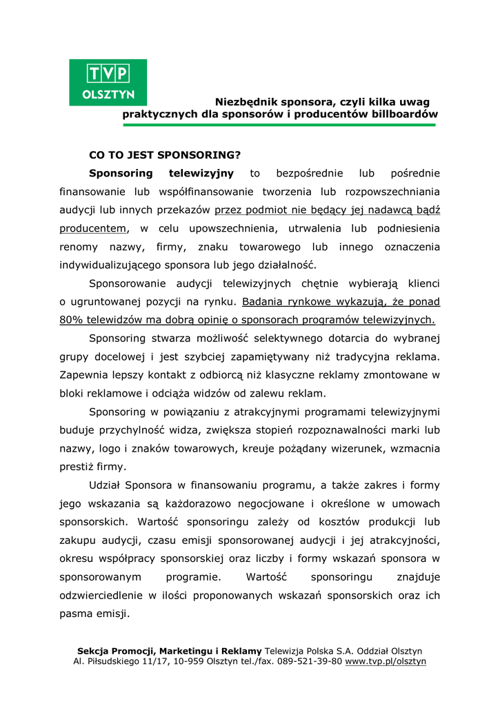 Niezbędnik sponsora, czyli kilka uwag praktycznych dla sponsorów i producentów billboardów CO TO JEST SPONSORING? Sponsoring telewizyjny to bezpośrednie lub pośrednie finansowanie lub współfinansowanie tworzenia lub rozpowszechniania audycji lub innych przekazów przez podmiot nie będący jej nadawcą bądź producentem, renomy w nazwy, celu firmy, upowszechnienia, znaku utrwalenia lub towarowego lub innego podniesienia oznaczenia indywidualizującego sponsora lub jego działalność. Sponsorowanie audycji telewizyjnych chętnie wybierają klienci o ugruntowanej pozycji na rynku. Badania rynkowe wykazują, że ponad 80% telewidzów ma dobrą opinię o sponsorach programów telewizyjnych. Sponsoring stwarza możliwość selektywnego dotarcia do wybranej grupy docelowej i jest szybciej zapamiętywany niż tradycyjna reklama. Zapewnia lepszy kontakt z odbiorcą niż klasyczne reklamy zmontowane w bloki reklamowe i odciąża widzów od zalewu reklam. Sponsoring w powiązaniu z atrakcyjnymi programami telewizyjnymi buduje przychylność widza, zwiększa stopień rozpoznawalności marki lub nazwy, logo i znaków towarowych, kreuje pożądany wizerunek, wzmacnia prestiż firmy. Udział Sponsora w finansowaniu programu, a także zakres i formy jego wskazania są każdorazowo negocjowane i określone w umowach sponsorskich. Wartość sponsoringu zależy od kosztów produkcji lub zakupu audycji, czasu emisji sponsorowanej audycji i jej atrakcyjności, okresu współpracy sponsorskiej oraz liczby i formy wskazań sponsora w sponsorowanym programie. Wartość sponsoringu znajduje odzwierciedlenie w ilości proponowanych wskazań sponsorskich oraz ich pasma emisji. Sekcja Promocji, Marketingu i Reklamy Telewizja Polska S.A. Oddział Olsztyn Al. Piłsudskiego 11/17, 10-959 Olsztyn tel./fax. 089-521-39-80 www.tvp.pl/olsztyn ZASADY EMISJI BILLBOARDÓW SPONSORSKICH Billboard sponsorski nie może mieć charakteru reklamy, nie może promować sprzedaży, albo innych form korzystania z towarów lub usług, popierać określonych spraw lub idei, albo zmierzać do osiągnięcia innego efektu reklamowego. fragmentów W billboardzie nie dźwiękowych lub wizualnych można przekazu wykorzystywać reklamowego, z którymi sponsor jest kojarzony, a które mogłyby utrudnić odróżnienie wskazania sponsora od przekazu reklamowego. W szczególności chodzi o niewykorzystywanie komunikatów elementów lektorskich fabuły, pochodzących podkładów muzycznych (wyciętych) ze i spotów reklamowych sponsora, których emisja jest realizowana w tym samym okresie co emisja billboardów, lub tych, które były nadawane w ramach kampanii reklamowych zakończonych w nieodległej przeszłości. Sponsor składa w treści umowy o sponsorowanie audycji stosowne oświadczenie, że przy tworzeniu billboardu nie wykorzysta fragmentów wizualnych lub dźwiękowych przekazu reklamowego. Billboard nie może zawierać jakichkolwiek informacji komercyjnych czy sprzedażowych, typu: „Najlepszy w swojej branży”, „Pismo od jutra w kioskach”, „Płyta już w sprzedaży” itp. Audycje sponsoruje sponsor, czyli określony podmiot (firma), a nie produkty lub usługi tej firmy, zatem komunikat: „Sponsorem programu jest …” powinien zawierać nazwę (firmę) sponsora. Jeżeli sponsor chce być identyfikowany tylko przez nazwę produktu (z pominięciem nazwy firmy), wówczas komunikat w billboardzie powinien brzmieć: „Sponsorem programu jest producent towaru (usługi) X”. Dopuszczalne jest przy tym określenie, nie mające charakteru reklamowego, cech produktu. Przykład: „Sponsorem programu jest X producent okien z PCV”. Billboard może odnosić się tylko do podmiotu sponsorującego oraz jego towaru lub usługi. Nie może w jakikolwiek sposób promować nazw, marek, znaków towarowych, produktów lub usług osób trzecich. Powyższe ograniczenie nie dotyczy sieci dystrybucyjnych lub przedstawicieli handlowych osób trzecich. Przykład: „Sponsorem programu jest sieć Sekcja Promocji, Marketingu i Reklamy Telewizja Polska S.A. Oddział Olsztyn Al. Piłsudskiego 11/17, 10-959 Olsztyn tel./fax. 089-521-39-80 www.tvp.pl/olsztyn sklepów X oferująca produkty marki Y” (możliwa jest przy tym wizualizacja jednego towaru lub usługi z oferty handlowej sponsora). W billboardzie można umieścić tylko jeden znak towarowy sponsora. Może on mieć formę określonego symbolu graficznego (tzw. logotyp), albo wyrazu, frazy lub hasła, z tym jednak, że znak towarowy mający postać wyrazu, frazy lub hasła może występować wyłącznie wtedy, gdy nie ma znamion reklamowych (nie zmierza do promocji sprzedaży albo innych form korzystania z produktów lub usług sponsora). W celu potwierdzenia, że określony znak graficzny, wyraz, fraza lub hasło jest znakiem towarowym należącym do sponsora, klient zobowiązany jest przedstawić odpowiedni dokument z Urzędu Patentowego lub oświadczenie. W billboardzie można umieścić inne niż nazwa, znak towarowy, towar lub usługa oznaczenie indywidualizujące przedsiębiorcę lub jego działalność (np. adres strony internetowej sponsora, numer jego telefonu, informację o zdobytych laurach konsumenckich, itp.). W billboardzie można powiedzieć o szerokim zakresie działalności sponsora, natomiast wizualizować (pokazać) można tylko jeden towar lub usługę sponsora. · PRZYKŁAD: Lektor mówi: „Sponsorem programu jest firma X, producent soków z owoców lub warzyw”. Można przy tym pokazać tylko i wyłącznie jeden rodzaj soku np. sok z marchwi (zawsze ten sam produkt w jednym opakowaniu lub w wielu opakowaniach wykonanych z różnych materiałów, np. w opakowaniu kartonowym, szklanej lub plastikowej butelce, albo w opakowaniach tego samego rodzaju o różnej pojemności). Niedopuszczalne jest wizualizowanie produktów tej samej marki, mających takie same przeznaczenie lecz różniących się postacią fizyczną lub składem (np. proszek i płyn do prania określon