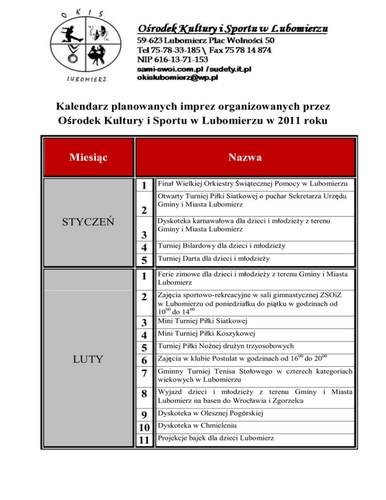 Kalendarz planowanych imprez organizowanych przez Ośrodek Kultury i Sportu w Lubomierzu w 2011 roku Miesiąc Nazwa 1 2 STYCZEŃ 3 4 5 1 2 LUTY 3 4 5 6 7 8 9 10 11 Finał Wielkiej Orkiestry Świątecznej Pomocy w Lubomierzu Otwarty Turniej Piłki Siatkowej o puchar Sekretarza Urzędu Gminy i Miasta Lubomierz Dyskoteka karnawałowa dla dzieci i młodzieży z terenu Gminy i Miasta Lubomierz Turniej Bilardowy dla dzieci i młodzieży Turniej Darta dla dzieci i młodzieży Ferie zimowe dla dzieci i młodzieży z terenu Gminy i Miasta Lubomierz Zajęcia sportowo-rekreacyjne w sali gimnastycznej ZSOiZ w Lubomierzu od poniedziałku do piątku w godzinach od 1000 do 1400 Mini Turniej Piłki Siatkowej Mini Turniej Piłki Koszykowej Turniej Piłki Nożnej drużyn trzyosobowych Zajęcia w klubie Postulat w godzinach od 1600 do 2000 Gminny Turniej Tenisa Stołowego w czterech kategoriach wiekowych w Lubomierzu Wyjazd dzieci i młodzieży z terenu Gminy i Miasta Lubomierz na basen do Wrocławia i Zgorzelca Dyskoteka w Olesznej Pogórskiej Dyskoteka w Chmieleniu Projekcje bajek dla dzieci Lubomierz MARZEC KWIECIEŃ CZERWIEC 1 2 Teatrzyk dla dzieci i młodzieży 3 4 5 1 2 3 1 2 3 4 5 6 7 Gminny Turniej Poker Texas Hold`Em 1 Festyn z okazji rozpoczęcia wakacji: Turniej Piłki Siatkowej o puchar Burmistrza Gminy i Miasta Lubomierz Gminny Turniej Warcabowy Projekcja Bajek dla dzieci Gminny Turniej szachowy w czterech kategoriach wiekowych Powiatowy Konkurs "Dekoracji Wielkanocnych" w Radoniowie Warsztaty wokalno-muzyczne w Lubomierzu Festyn „Dzień Sąsiada” w Radoniowie Dyskoteka dla dzieci i młodzieży w Lubomierzu Gminny Turniej Tenisa Ziemnego w Singlu (boisko Orlik) Gminny Turniej Tenisa Ziemnego w Deblu Festyn „Dzień rodziny” w Wojciechowie Gminny Przegląd Solistów w Lubomierzu Międzynarodowy Turniej Piłki Nożnej (Wittichenau, Tanvald, Lubomierz) Gminny Turniej Piłki Nożnej o puchar Burmistrza Gminy i Miasta Lubomierz Pokazy sztuki walki i samoobrony Występy zespołów tanecznych z OKiS w Lubomierzu II Gminny Turniej Siłaczy „Mocarz” 2011 Konkursy Sportowo-rekreacyjne dla dzieci Konkurs rzutów karnych Pokazy tresury psów Występy zespołów muzycznych Zabawa taneczna „Pod Gwiazdami” Otwarty turniej Piłki Siatkowej o puchar Sekretarza Urzędu Miasta i Gminy Lubomierz LIPIEC 2 3 4 5 Otwarcie Basenu Kąpielowego w Lubomierzu 6 7 Dyskoteka dla dzieci i młodzieży 8 Festyn Sportowo-Rekreacyjny w Olesznej Podgórskiej Zawody sportowo-rekreacyjne na Basenie w Lubomierzu Turniej Piłki Plażowej drużyn trzyosobowych Mini Turniej Piłki Nożnej drużyn podwórkowych boisko Orlik Otwarty Turniej Piłki Siatkowej o puchar LATO 2011 (boisko Orlik) 9 10 SIERPIEŃ WRZESIEŃ PAŹDZIERNIK LISTOPAD GRUDZIEŃ Dyskoteka dla dzieci i młodzieży w Chmieleniu Gminny Turniej Piłki Nożnej Drużyn Ochotniczych Straży Pożarnych o Puchar Burmistrza Gminy i Miasta Lubomierz 1 2 3 XV Ogólnopolski Festiwal Filmów Komediowych 4 1 Dyskoteka „Zakończenie Lata 2011” 2 3 1 2 3 1 Dyskoteka dla dzieci i młodzieży 2 3 1 2 Dyskoteka Andrzejkowa w Olesznej Podgórskiej. 3 Wigilia dla samotnych z terenu Gminy i Miasta Lubomierz. Swojska zabawa „Pod Kasztanami” Gminny Turniej Piłki Nożnej dzieci i młodzieży do lat 13 (boisko Orlik) Gminne Biegi Przełajowe Szkól Podstawowych z terenu Gminy i Miasta Lubomierz. Dożynki Gminne w Wojciechowie Projekcje bajek dla dzieci Święto Gryki w Wojciechowie Wystawa Koni „Święto Konia 2011” Turniej Piłki siatkowej z okazji „Dnia Niepodległości” o puchar Burmistrza Gminy i Miasta Lubomierz Dyskoteka Andrzejkowa w Lubomierzu. Impreza Mikołajkowa w Przedszkolu w Lubomierzu Gminny Konkurs Dekoracji Bożonarodzeniowych w Lubomierzu