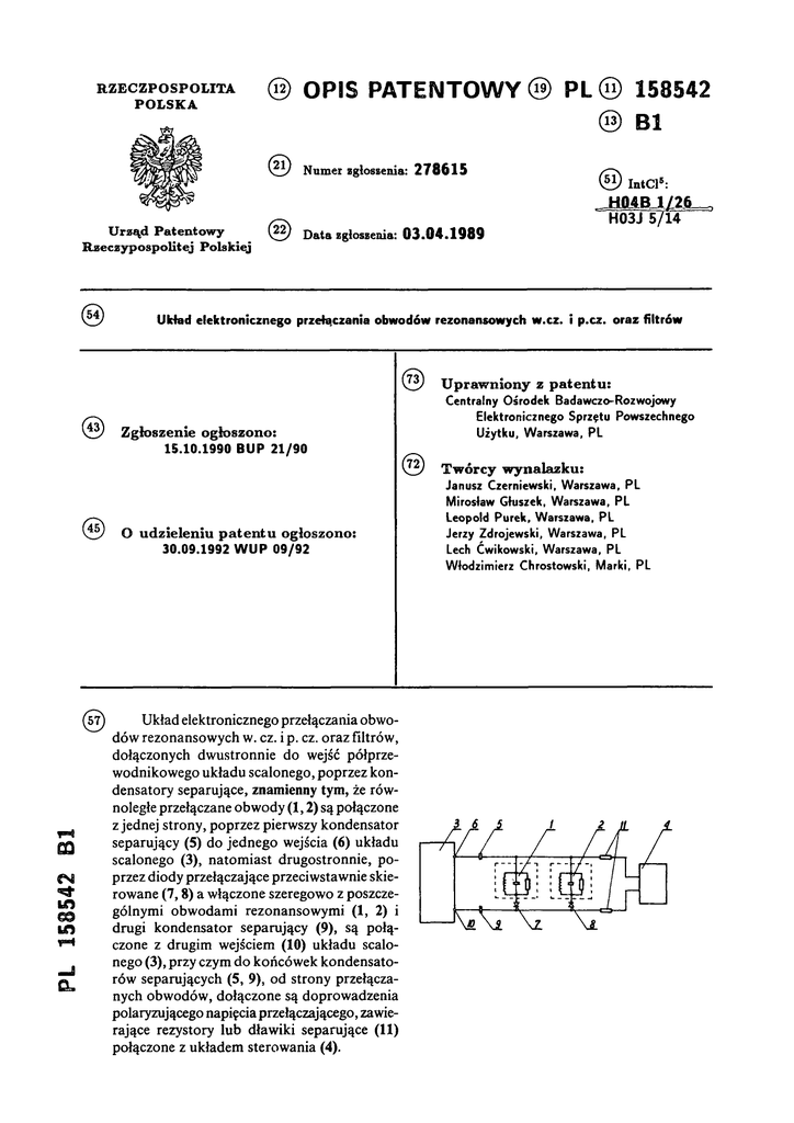 R ZEC ZPO SPO LIT A (12) P O LSK A OPIS P ATEN TO W Y (19) PL (13) B 1 (21) Numer zgłoszenia: U rząd P atentow y R zeczy po spo litej Polskiej 158542 1 )( (22) Data zgłoszenia: 278615 (51) IntCl5: 03.04.1989 H 0 4 B 1/26 H03J 5/14 Układ elektronicznego przełączania obwodów rezonansowych w.cz. i p.cz. oraz filtrów U praw niony z p aten tu : Zgłoszenie ogłoszono: C entralny O środek Badaw czo-R ozw ojow y E lektron iczneg o Sprzętu Pow szechnego U żytku, W arszaw a, P L 15.10.1990 B U P 21/90 T w órcy w ynalazku: Janusz Czerniew ski, W arszaw a, P L (45)O udzieleniu p aten tu ogłoszono: 30.09.1992 W U P 09/92 PL 158542 B1 (57) Układ elektronicznego przełączania obwodów rezonansowych w. cz. i p. cz. oraz filtrów, dołączonych dwustronnie do wejść półprzewodnikowego układu scalonego, poprzez kondensatory separujące, znamienny tym, że równoległe przełączane obwody (1,2) są połączone z jednej strony, poprzez pierwszy kondensator separujący (5) do jednego wejścia (6) układu scalonego (3), natomiast drugostronnie, poprzez diody przełączające przeciwstawnie skierowane (7,8) a włączone szeregowo z poszczególnymi obwodami rezonansowymi (1, 2) i drugi kondensator separujący (9), są połączone z drugim wejściem (10) układu scalonego (3), przy czym do końcówek kondensatorów separujących (5, 9), od strony przełączanych obwodów, dołączone są doprowadzenia polaryzującego napięcia przełączającego, zawierające rezystory lub dławiki separujące (11) połączone z układem sterowania (4). M irosław Głuszek, W arszaw a, P L Leopold Purek, W arszaw a, P L Jerzy Zdrojew ski, W arszaw a, P L Lech Ć w ikow ski, W arszaw a, P L W ło d zim ierz Chrostow ski, M a rk i, P L UKŁAD ELEKTRONICZNEGO PRZEŁĄCZANIA OBWODÓW REZONANSOWYCH W.CZ. I P.CZ. ORAZ FILTRÓW Z a s t r z e ż e n i e p a t e n t o w e Układ e lek tron iczn ego p rz e łą c z a n ia obwodów rezonansowych w .cz. i p . c z . oraz f i l t r ó w , dołączonych dwustronnie do wej ś ć półprzewodnikowego układu sc a lo n e g o , poprzez kondensatory se p a ru ją c e z n a m i e n n y t y m, że równoległe przełączan e obwody / 1 , 2 / są połączone z je d n e j strony, poprzez pierwszy kondensator s e p a ru ją c y / 5 / d o jednego w e j ś c i a 6 układu s c a lonego / 3 /,n a t o m ia s t dru go stro n n ie, poprzez diody p r z e ł ą c z a ją c e przeciwstawnie s k i e r owane / 7 , 8 / a włączone szeregowo z poszczególnymi obwodami rezonansowymi / 1 , 2 / i drugi kondensato r se p a ru ją c y / 9 / , s ą połączone z d ru gim. wejściem / 19/ układu scalo n ego / 3 / , przy czym do końcówek kondensatorów separujących / 5 , 9 / , od stron y przełączanych obwodów, dołączone s ą doprowadzenia po lary z u ją ce go n a p ię c ia p r z e łą c z a ją c e g o , zaw ierając e r e z y s t o r y lub d ław ik i se p a ru ją c e / 1 1 / połączone z układem s t erowania / 4 / . * * * Przedmiotem wynalazku j e s t układ do elektron iczn ego p r z e łą c z a n ia obwodów rezonansowych w .c z. i p.cz oraz f i l t r ó w , d la zmiany zakresu odbieranych sygnałów w odbiornikach radiowych i telew izyjnych lub standardów przekazywania f o n i i w systemach telew izyjn y ch . W znanych układach odbiorników radiowych s t o s u je s i ę e lek tro n ic zn e układy p r z e ł ą c z a j ą ce do zmiany zakresów odbieranych c z ę s t o t l i w o ś c i , powodujące zwieranie s i ę masy c z ę ś c i obwodów rezonansowych, przy pomocy wprowadzanych w sta n przewodzenia diod p rze łą c z a ją c y c h odpowiednio polaryzowanych. W rozwiązaniu przedstawionym w o p isie patentowym Nr 70506 przy pomocy p o la r y z a c ji diod p rze łąc zają cy ch włączane są dodatkowe pojemności do obwodów rezonansowych zm ie n ia jąc ich c z ę sto tliw o ść rezonansową. W rozwiązaniu przedstawionym w o p isie patentowym Nr 83733 dioda p r z e ł ą c z a ją c a , przy spolaryzowaniu w st a n przewodzenia, zwiera d la w .cz. część obwodu rezonansowego z a w ie r a ją cego indukcyjność zm ieniając zakres generowanych c z ę s t o t l i w o ś c i heterodyny. Rozwiązania te nie pozwalają na przełąc zan ie obwodów rezonansowych w.cz lub p . c z . oraz f i l t r ó w , w przypadku współpracy tych obwodów z półprzewodnikowymi układami scalonymi, do których są dołączane obustronnie. I s t o t a wynalazku polega na tym, że dwa równoległe przełączane obwody rezonansowe s ą połączone z jed n ej str o n y , poprzez pierwszy kondensator s e p a ru ją c y do jednego w e jś c ia u k ładu scalo n e go , natom iast drugorzędnie, poprzez diody p r z e ł ą c z a ją c e przeciwstawnie skierowane a włączone w s z e r e g z poszczególnymi obwodami rezonansowymi oraz kondensator se p a r u ją c y , obwody te są połączone z drugim wejściem układu sc a lo n e g o . Do końcówek kondensatorów sep ar u ją c y c h , od strony przełączanych obwodów, dołączone s ą doprowadzenia po laryzującego nap i ę c i a p r z e łą c z a ją c e g o , zaw ierające r e z y sto r y lub dław iki se p a ru ją c e połączone z układem sterow an ia. Układ elektron iczn ego p rze łąc zan ia obwodów rezonansowych według wynalazku zapewnia p r zełąc zan ie tych obwodów podłączonych obustronnie do układów scalonych, d z ięk i zastosow aniu diod przeciwstawnie skierowanych włączonych szeregowo z poszczególnymi przełączanymi obwodami. Wynalazek w przykładzie wykonania j e s t przedstawiony na rysunku, który j e s t schematem ideowo-blokowym układu elektron iczn ego p r z e ł ą c z a n ia . 158 542 3 Obwody rezonansowa pierwszy 1, odpowiadający jednemu standardowi c z ę s t o t l i w o ś c i różnicowej f o n i i , oraz drugi 2, odpowiadający drugiemu standardowi c z ę s t o t l i w o ś c i różnicowej f o n i i odbioru telew iz y jn e go , s ą dołączone do układu scalo n ego 3, poprzez układ s t e r u 