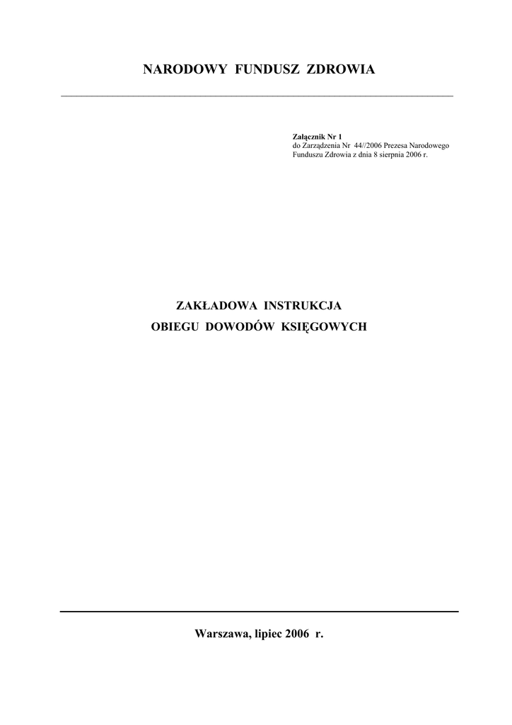 NARODOWY FUNDUSZ ZDROWIA ____________________________________________________________________________ Załącznik Nr 1 do Zarządzenia Nr 44//2006 Prezesa Narodowego Funduszu Zdrowia z dnia 8 sierpnia 2006 r. ZAKŁADOWA INSTRUKCJA OBIEGU DOWODÓW KSIĘGOWYCH Warszawa, lipiec 2006 r. I. WSTĘP 1. Instrukcja ustala zasady sporządzania, kontroli i obiegu dowodów księgowych w zakresie operacji gospodarczych i finansowych, realizowanych w Oddziałach Wojewódzkich Narodowego Funduszu Zdrowia, zwanych dalej „OW”. 2. Dyrektor OW zobowiązany jest do zapoznania wszystkich pracowników zaangażowanych w obieg dowodów księgowych z postanowieniami niniejszej instrukcji oraz ponosi odpowiedzialność za jej przestrzeganie. 3. W sprawach nieuregulowanych w instrukcji mają zastosowanie: 1) ustawa z dnia 29 września 1994 r. o rachunkowości (Dz. U. z 2002 r. Nr 76, poz. 694 z późn. zm.), zwana dalej „ustawą o rachunkowości”, 2) ustawa z dnia 27 sierpnia 2004 r. o świadczeniach opieki zdrowotnej finansowanych ze środków publicznych (Dz. U. Nr 210, poz. 2135 z późn. zm.), zwana dalej „ustawą”, 3) ustawa z dnia 30 czerwca 2005 r. o finansach publicznych (Dz. U. Nr 249, poz. 2104), zwana dalej „ustawą o finansach publicznych”, 4) ustawa z dnia 17 grudnia 2004 r. o odpowiedzialności za naruszenie dyscypliny finansów publicznych (Dz. U. z 2005 r. Nr 14, poz. 114 z późn. zm.), 5) ustawa z dnia 11 marca 2004 r. o podatku od towarów i usług (Dz. U. Nr 54, poz. 535 z późn. zm.), zwana dalej „ustawą o VAT”, 6) ustawa z dnia 29 sierpnia 1997 r. – Ordynacja podatkowa (Dz. U. z 2005 r. Nr 8, poz. 60 z późn. zm.), 7) ustawa z dnia 29 sierpnia 1997 r. o ochronie danych osobowych (Dz. U. z 2002 r. Nr 101, poz. 926 z późn. zm.), 8) ustawa z dnia 18 września 2001 r. o podpisie elektronicznym (Dz. U. Nr 130, poz. 1450 z późn. zm.), zwana dalej „ustawą o podpisie elektronicznym”, 9) ustawa z dnia 17 lutego 2005 r. o informatyzacji działalności podmiotów realizujących zadania publiczne (Dz. U. Nr 64, poz. 565 z późn. zm.), 10) rozporządzenie Ministra Finansów z dnia 14 lipca 2005 r. w sprawie wystawiania oraz przesyłania faktur w formie elektronicznej, a także przechowywania oraz udostępniania organowi podatkowemu lub organowi kontroli skarbowej tych faktur (Dz. U. Nr 133, poz. 1119), zwane dalej „rozporządzeniem w sprawie e-faktur”, 11) regulacje wewnętrzne Narodowego Funduszu Zdrowia w sprawie ustalenia zasad rachunkowości w Narodowym Funduszu Zdrowia, zwane dalej „zasadami rachunkowości NFZ”, 12) regulacje wewnętrzne Narodowego Funduszu Zdrowia w sprawie instrukcji sporządzania, obiegu i przechowywania dokumentów związanych z gospodarką środkami trwałymi w Narodowym Funduszu Zdrowia, 13) regulacje wewnętrzne Narodowego Funduszu Zdrowia w sprawie instrukcji przeprowadzania i rozliczania inwentaryzacji składników aktywów i pasywów w Narodowym Funduszu Zdrowia, 14) regulacje wewnętrzne Narodowego Funduszu Zdrowia w sprawie określenia zadań Centrali i OW Narodowego Funduszu Zdrowia w zakresie opodatkowania podatkiem od towarów i usług, 15) regulacje wewnętrzne Narodowego Funduszu Zdrowia w sprawie bezpieczeństwa danych osobowych w Narodowym Funduszu Zdrowia, 16) regulacje wewnętrzne Narodowego Funduszu Zdrowia w sprawie dokumentów księgowych dotyczących rozliczania rzeczywistych kosztów świadczeń zdrowotnych 2 powstałych w wyniku stosowania przepisów wspólnotowych o koordynacji systemów zabezpieczenia społecznego, 17) bilateralne umowy międzynarodowe w zakresie rozliczania rzeczywistych kosztów świadczeń zdrowotnych, podpisane pomiędzy krajami członkowskimi UE, na podstawie delegacji zawartej w art. 102 ust. 5 rozporządzenia Rady (EWG) nr 574/72 z dnia 21 marca 1972 r. w sprawie wykonywania rozporządzenia (EWG) nr 1408/71 w sprawie stosowania systemów zabezpieczenia społecznego do pracowników najemnych i ich rodzin przemieszczających się we Wspólnocie. II. DOWODY KSIĘGOWE 1. Dowód księgowy jest dokumentem potwierdzającym dokonanie operacji gospodarczej lub finansowej w określonym miejscu i czasie. Prawidłowo sporządzony dowód księgowy stanowi podstawę do ujęcia go w księgach rachunkowych. Dowód księgowy dokumentuje daną operację gospodarczą lub finansową co do miejsca i czasu powstania (podmiotowo i przedmiotowo) oraz określa jej wymiar (wartościowo, albo ilościowo – wartościowo). Powinien być rzetelny, to jest zgodny z rzeczywistym przebiegiem operacji gospodarczej, którą dokumentuje, kompletny, wolny od wymazań, przeróbek i błędów. Rodzaje podstawowych dowodów księgowych określone zostały w rozdziale IV. 2. Dowód księgowy, z zastrzeżeniem ust. 3 powinien zawierać co najmniej: 1) określenie rodzaju dowodu i jego numeru identyfikacyjnego, 2) określenie stron (nazw i adresów) dokonujących operacji gospodarczej lub finansowej, 3) opis operacji oraz jej wartość, a jeżeli to możliwe, określoną także w jednostkach naturalnych, 4) datę dokonania operacji, a gdy dowód został sporządzony pod inną datą - także datę sporządzenia dowodu, 5) podpis wystawcy dowodu oraz osoby, której wydano lub od której przyjęto składniki aktywów, 6) stwierdzenie sprawdzenia i zakwalifikowania dowodu do ujęcia w księgach rachunkowych przez wskazanie miesiąca oraz sposobu ujęcia dowodu w księgach rachunkowych (dekretacja), a także podpis osoby odpowiedzialnej za te wskazania. 3. Dowód księgowy wystawiony przez podatnika podatku od towarów i usług, powinien dodatkowo zawierać dane wymagane przepisami o tym podatku. 4. Można zaniechać zamieszczania na dowodzie danych, o których mowa w ust. 2 pkt 5 i 6, jeżeli wynika to z odrębnych przepisów lub techniki dokumentowania zapisów księgowych. 5. Jeżeli dowód nie dokumentuje przekazania lub przejęcia składnika aktywów, przeniesienia prawa własności lub użytkowania wieczystego gruntu albo nie jes