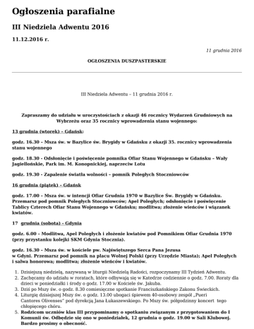 Ogłoszenia parafialne III Niedziela Adwentu 2016 11.12.2016 r. 11 grudnia 2016 OGŁOSZENIA DUSZPASTERSKIE III Niedziela Adwentu – 11 grudnia 2016 r. Zapraszamy do udziału w uroczystościach z okazji 46 rocznicy Wydarzeń Grudniowych na Wybrzeżu oraz 35 rocznicy wprowadzenia stanu wojennego: 13 grudnia (wtorek) – Gdańsk: godz. 16.30 – Msza św. w Bazylice św. Brygidy w Gdańsku z okazji 35. rocznicy wprowadzenia stanu wojennego godz. 18.30 - Odsłonięcie i poświęcenie pomnika Ofiar Stanu Wojennego w Gdańsku – Wały Jagiellońskie, Park im. M. Konopnickiej, naprzeciw Lotu godz. 19.30 - Zapalenie światła wolności – pomnik Poległych Stoczniowców 16 grudnia (piątek) – Gdańsk godz. 17.00 – Msza św. w intencji Ofiar Grudnia 1970 w Bazylice Św. Brygidy w Gdańsku. Przemarsz pod pomnik Poległych Stoczniowców; Apel Poległych; odsłonięcie i poświęcenie Tablicy Czterech Ofiar Stanu Wojennego w Gdańsku; modlitwa; złożenie wieńców i wiązanek kwiatów. 17 grudnia (sobota) - Gdynia godz. 6.00 – Modlitwa, Apel Poległych i złożenie kwiatów pod Pomnikiem Ofiar Grudnia 1970 (przy przystanku kolejki SKM Gdynia Stocznia). godz. 16.30 – Msza św. w kościele pw. Najświętszego Serca Pana Jezusa w Gdyni. Przemarsz pod pomnik na placu Wolnej Polski (przy Urzędzie Miasta); Apel Poległych i salwa honorowa; modlitwa; złożenie wieńców i kwiatów. 1. Dzisiejszą niedzielą, nazywaną w liturgii Niedzielą Radości, rozpoczynamy III Tydzień Adwentu. 2. Zachęcamy do udziału w roratach, które odbywają się w Katedrze codziennie o godz. 7.00. Roraty dla dzieci w poniedziałki i środy o godz. 17.00 w Kościele św. Jakuba. 3. Dziś po Mszy św. o godz. 8.30 comiesięczne spotkanie Franciszkańskiego Zakonu Świeckich. 4. Liturgię dzisiejszej Mszy św. o godz. 13.00 ubogaci śpiewem 40-osobowy zespół „Pueri Cantores Olivenses” pod dyrekcją Jana Łukaszewskiego. Po Mszy św. półgodzinny koncert tego chłopięcego chóru. 5. Rodzicom uczniów klas III przypominamy o spotkaniu związanym z przygotowaniem do I Komunii św. Odbędzie się ono w poniedziałek, 12 grudnia o godz. 19.00 w Sali Klubowej. Bardzo prosimy o obecność. 6. W środę o godz. 16.00 w kawiarence kolejne spotkanie Klubu Seniora. 7. W czwartek na godz. 17.00 zapraszamy do Kaplicy Mariackiej członków „Żywego Różańca” na wspólną modlitwę różańcową przed Chrystusem obecnym w Najświętszym Sakramencie i katechezę. 8. Droga Neokatechumenalna zaprasza w adwencie codziennie od poniedziałku do piątku o godz. 5.45 na Jutrznię w Domu Parafialnym. 9. Pobłogosławione opłatki na stół wigilijny można nabywać przy stoliku z prasą katolicką, w sklepiku, zakrystii i biurze parafialnym. Złożone ofiary będą przeznaczone na prace renowacyjne w Katerze. Przypominamy, że w tym roku nie roznosimy opłatków do domów. 10. W czasie adwentu zachęcamy do wsparcia potrzebujących poprzez przygotowanie paczek i pomocy dla ubogich na zbliżające się święta Bożego Narodzenia. Dary żywnościowe można składać do kosza przy ołtarzu św. Antoniego. 11. Przy wyjściu Panie z parafialnej grupy „Caritas” oferują przygotowywane własnoręcznie ozdoby choinkowe. Powstawały one przez kilka miesięcy. Za tę inicjatywę i wykonaną pracę Paniom z Caritas serdecznie dziękuję. Pieniądze zebrane w ten sposób będą przeznaczone na przygotowanie świątecznych paczek dla ubogich mieszkańców naszej parafii. Dziękujemy za wsparcie tej szlachetnej inicjatywy. 12. Fundacja Wspólnota Gdańska zaprasza na czwartą edycję Wigilii Oliwskiej i odsłonięcie gdańskiej szopki z piasku w sobotę, 17 grudnia. Początek o godz. 15.00 (ul. Opata Jacka Rybińskiego 25). 13. Duszpasterstwo Służby Zdrowia Archidiecezji Gdańskiej zaprasza lekarzy, farmaceutów, pielęgniarki i wszystkich pracowników Służby Zdrowia na dzień skupienia oraz spotkanie opłatkowe, które odbędzie się w sobotę, 17 grudnia br. w kościele pw. Chrystusa Króla w Gdańsku przy ulicy bł. Ks. F. Rogaczewskiego 55. 14. W ramach zbiórki pieniędzy na pomoc osobom w potrzebie mieszkającym na Wschodzie zebraliśmy przed tygodniem 1 579 zł. Dziękujemy za ofiarność. 15. Przy wyjściu jest do nabycia prasa religijna. Zachęcamy do lektury. 16. Pomódlmy się za naszego zmarłego parafianina: śp. Edmunda Połońskiego (l.72, ul. Grunwaldzka). Dobry Jezu…