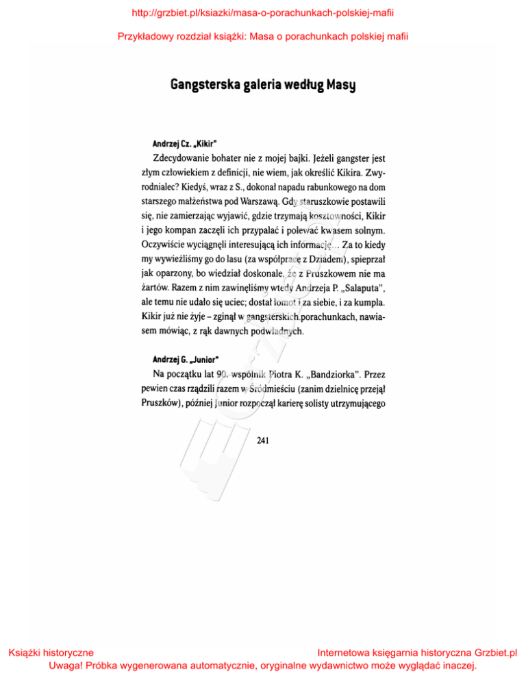 http://grzbiet.pl/ksiazki/masa-o-porachunkach-polskiej-mafii Przykładowy rozdział książki: Masa o porachunkach polskiej mafii Gangsterska galeria według Masy Andrzej Cz .•Kikir" Zdecydowanie bohater nie z mojej bajki. Jeżeli gangster jest złym człowiekiem z definicji, nie wiem, jak określić Kikira. Zwy rodnialec? Kiedyś, wraz z S., dokonał napadu rabunkowego na dom starszego małżeństwa pod Warszawą. Gdy staruszkowie postawili się, nie zamierzając wyjawić, gdzie trzymają kosztowności, Kikir i jego kompan zaczęli ich przypalać i polewać kwasem solnym. Oczywiście wyciągnęli interesującą ich informację ... Za to kiedy my wywieźliśmy go do lasu (za współpracę z Dziadem), spieprzał jak oparzony, bo wiedział doskonale, że z Pruszkowem nie ma żartów. Razem z nim zawinęliśmy wtedy Andrzeja P. "Salaputa", ale temu nie udało się uciec; dostał łomot i za siebie, i za kumpla. Kikir już nie żyje- zginął w gangsterskich.porachunkach, nawia sem mówiąc, z rąk dawnych podwładnych. Andrzej G. ,.Junior" Na początku lat 90. wspólnik Piotra K. "Bandziorka". Przez pewien czas rządzili razem w Śródmieściu (zanim dzielnicę przejął Pruszków), później Junior rozpoczął karierę solisty utrzymującego 241 Książki historyczne Internetowa księgarnia historyczna Grzbiet.pl Uwaga! Próbka wygenerowana automatycznie, oryginalne wydawnictwo może wyglądać inaczej. http://grzbiet.pl/ksiazki/masa-o-porachunkach-polskiej-mafii Przykładowy rozdział książki: Masa o porachunkach polskiej mafii dobre stosunki z mafią. W połowie lat 90. sprzymierzył się z Jere miaszem B. "Baraniną", zostając reprezentantem jego interesów w kraju. Z czasem jednak coraz bardziej dokuczał i pruszkow skim, i wołomińskim, co skończyło się dla niego tragicznie. Zo stał zastrzelony w przejściu podziemnym przy hotelu Marriott w Warszawie. Andrzej H. "Korek" Szef gangu mokotowskiego, wywodzący się ze starej gwardii przestępczej. Choć teoretycznie stanowił konkurencję, grupa pruszkowska utrzymywała z nim poprawne relacje. Pruszków i Mokotów przeważnie nie wchodziły sobie w drogę. Jeśli moż na o kimś powiedzieć "gangster z klasą", Korek zdecydowanie zasłużył na to miano. Oczywiście, nie był święty, skrzywdzić też potrafił. W 2012 roku Trybunał w Strasburgu nakazał państwu polskiemu zapłacenie Korkowi odszkodowania w wysokości 5 tysięcy euro- za "naruszenie prawa H. do godnego trakto wania" za kratkami. Andrzej K. "Pershing" Jeden z najważniejszych bossów Pruszkowa, choć nigdy nie wszedł w skład tak zwanego zarządu. Stworzył strukturę konkurencyjną wobec starych pruszkowskich. Intelektualnie przerastał ich o głowę i najprawdopodobniej dlatego tę głowę stracił. Andrzej T. "Tychol" Pochodzi z dość zamożnej rodziny prywatnych przedsiębior ców (prywatnych w czasach PRL-u). Od początku zawodowej 242 Książki historyczne Internetowa księgarnia historyczna Grzbiet.pl Uwaga! Próbka wygenerowana automatycznie, oryginalne wydawnictwo może wyglądać inaczej. http://grzbiet.pl/ksiazki/masa-o-porachunkach-polskiej-mafii Przykładowy rozdział książki: Masa o porachunkach polskiej mafii kariery blisko związany z Wojciechem P. nie gardził partnerkami kolegów. Kochał piękne kobiety, Andrzej Z. ~Słowik" Inteligentny- umiał wkręcić się na pruszkowski szczyt, choć jego przeszłość drobnego złodziejaszka wcale tego nie uzasad niała. Artur B. Początkowo niezły bokser, powiązany z grupą Barabasa. Porlob nie jakHemlai Cruyff miał na koncie epizod hamburski. W latach 90. "latał" z Prus~kowem, ale wszystko, co zarobił, przepijał. Alkohol stał się rychło przyczyną jego śmierci. Bogdan D. "Dreks" Duża klasa. Gangster z talentem biznesmena, wygadany, inte ligentny, a nawet oczytany, tyle że oddający się głównie lekturze pozycji fachowych, czyli na temat mafii. Budził sympatię i sza cunek miasta; na przykład taki Nikoś rozmawiał z nim jak równy z równym. W Poznaniu nikt mu nie podskakiwał, bo Dreks był mocny, a na układach z nim wychodziło się dobrze. Złe relacje po prostu się nie opłacały. W sumie szkoda, że człowiek z taką smykałką do biznesu postawił na przestępczość. "Cruyff" Karierę przestępczą zaczynał w latach 80. jako członek grupy Ireneusza P. "Barabasa". W Niemczech głównie okradał sklepy. Po powrocie do Polski kręcił się przy Pruszkowie, ale szybko został wyproszony ze struktur, bo wielokrotnie wykazywał się 243 Książki historyczne Internetowa księgarnia historyczna Grzbiet.pl Uwaga! Próbka wygenerowana automatycznie, oryginalne wydawnictwo może wyglądać inaczej. http://grzbiet.pl/ksiazki/masa-o-porachunkach-polskiej-mafii Przykładowy rozdział książki: Masa o porachunkach polskiej mafii nielojalnością wobec grupy. Przeniósł się do Szczecina, gdzie zginął w wypadku samochodowym. Czesław K. "Ceber" jak dąb, niestety, o umyśle nieco mniejszych rozmiarów. Silny, ale prymitywny. Początkowo kolegował się z nami. lecz z biegiem czasu coraz bardziej podobało mu się u Dziada. Pewnie marzyły mu się mafijne szczyty, choć- bądźmy szczerzy- nie były mu pisane. Tak naprawdę, gdyby nie porwanie syna oraz śmierć w zamachu bombowym w 1995 roku, postać Cebra nie przebiłaby Chłop się do mediów. Dariusz B. "By sio" Moja prawa ręka, człowiek do wszystkiego- i zarabiania pie niędzy, i podawania mi drinków. Oddany mi jak mało kto. Wczasie alkoholowej imprezy chciał uciąć sobie dla mnie palec. Na szczęście moja żona pokrzyżowała jego autodestrukcyjne plany. Dariusz W. Biznesmen powiązany z Wojciechem P., prowadzący licz ne interesy w USA. To on pomógł grupie pruszkowskiej na wiązać kontakt z kolumbijskimi kartelami. Oficjalnie udzia łowiec Telekomunikacji Polskiej SA, sprowadzał do Polski ze Stanów Zjednoczonych centrale do obsługi numerów sied miocyfrowych. Henryk N. "Dziad" Dowódca grupy z Ząbek, przez medi