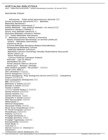 WIRTUALNA BIBLIOTEKA Autor : Małgorzata Karaczewska - Ostatnia aktualizacja (czwartek, 20 styczeń 2011) PRZYDATNE STRONY Astronomia Polski portal astronomiczny Astronet Strona poświęcona astronomii Biblioteki Biblioteka Narodowa Polska Biblioteka Internetowa Polskie Biblioteki - lista polskich bibliotek i ich witryn Skarbnica Literatury Polskiej Strony www bibliotek szkolnych Wirtualna Biblioteka Literatury Polskiej Polska Biblioteka Internetowa Biblioteka Literatury Polskiej w Internecie Skarby Dziedzictwa Narodowego (w serwisie polska.pl) Exlibris - Biblioteka Internetowa Literatura.net.pl Cyfrowa Biblioteka Narodowa „Polona” Pedagogiczna Biblioteka Cyfrowa Federacja Bibliotek Cyfrowych Biblioteka Cyfrowa Centralnego Ośrodka Doskonalenia Nauczycieli Wolne Lektury.pl Wolne Podreczniki.pl Cyfrowa Kolekcja Czasopism Polskich Polonista - czas na lektury Staropolska On-Line Portal Literacki Fabrica Librorum Eduskrypt Biologia i ekologia Atlas polskich grzybów: "Na grzyby!" Ocean Color WEB Oko człowieka Serwis biologiczny Serwis ekologiczny: Moja ekologiczna strona www Czasopisma Angora Aura (czasopismo ekologiczne) BBC Biblioteka w Szkole Biologia w Szkole Fizyka w Szkole Gazeta Polska Gazeta Prawna Gazeta Szkolna Gazeta Wyborcza Geografia w Szkole Głos Nauczycielski Matematyka National Geographic Newsweek Polska Nowe Życie Gospodarcze PC World Komputer Perspektywy Polityka Przegląd Oświatowy Przegląd Sportowy Przegląd Tygodniowy Rzeczpospolita Świat Nauki Twój Styl Wprost Chemia ChemFan Chemiczny serwis edukacyjny http://www.lo8.wroc.pl - Liceum Ogólnokształcące nr VIII we Wrocławiu Powered by Mambo Generated: 1 March, 2017, 22:25 Docent online Encyklopedie Encyklopedia Internetu Encyklopedia PWN Encyklopedia zdrowia Internetowa Encyklopedia PWN Portal wiedzy Fizyka Fizyk Mania Linki Serwis fizyczny Serwis Instytutu Fizyki UW Geografia Geografia Polski Informator turystyczny Mapa Polski National Geographic Polska Ojcowski Park Narodowy Wirtualne Bieszczady Wirtualne Mazury Historia Instytut Pamięci Narodowej Poczet władców Polski Polska Piastów Polski portal historyczny Polskie hymny narodowe Polskie konstytucje Polskie witryny historyczne Zabytki w Polsce Zamki w Polsce Informatyka Historia i usługi Internetu Kurs Jęyka HTML OEIIZK Literatura Baczyński Krzysztof Kamil Bursa Andrzej Chmielewska Joanna Cytaty Herbert Zbigniew Hłasko Marek Humanista Kapuściński Ryszard Lem Stanisław Mickiewicz Adam Miłosz Czesław Poświatowska Halina Stachura Edward Tuwim Julian William Wharton Osiecka Agnieszka Matematyka Animacje matematyczne Artykuły i publikacje matematyczne Gry matematyczne i logiczne Konkurs matematyczny Kangur Serwis matematyczny Kalkulator Motywy literackie Galeria malarstwa polskiego Galeria sztuki w Interia.pl(znajdziesz tu 11 tysięcy obrazów - możesz kupić reprodukcję lub ją wydrukować) Literatura przedmiotu do różnych motywów Malarstwo Rzeźba Top-100 Matura 2005 - motywy Motywy literackie Motywy literackie National Gallery of Art Sztuka polska Nagrody Literackie http://www.lo8.wroc.pl - Liceum Ogólnokształcące nr VIII we Wrocławiu Powered by Mambo Generated: 1 March, 2017, 22:25 Literacka Nagroda Nobla Literacka Nagroda Nike Serwisy edukacyjne Edukus Eduseek Interklasa Profesor Liceum Nowe liceum Matura Vulcan – zarządzanie oświatą Sport Serwis sportowy Bundesliga Sztuka Chopin Galeria malarstwa polskiego Malarstwo polskie Uczelnie wyższe Politechnika Poznańska Politechnika Szczecińska Uniwersytet A. Mickiewicza w Poznaniu Uniwersytet Gdański Uniwersytet Jagielloński Uniwersytet Warszawski Uniwersytet Wrocławski Uniwersytet Zielonogórski Źródło: strona internetowa Biblioteki Szkolnej Liceum Ogólnokształcącego im. Adama Mickiewicza w Górze Autor strony: Beata Działo http://www.lo8.wroc.pl - Liceum Ogólnokształcące nr VIII we Wrocławiu Powered by Mambo Generated: 1 March, 2017, 22:25