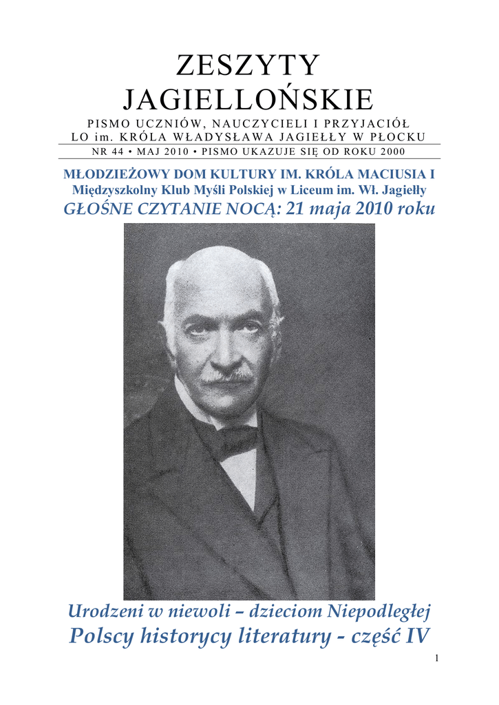 ZESZYTY JAGIELLOŃSKIE PISM O UCZNIÓW, NAUC ZYCIELI I PR ZYJ AC IÓŁ LO im. KR Ó LA W ŁAD YSŁAW A JAG IEŁŁY W PŁO C KU N R 4 4 • M A J 2 0 1 0 • P I S M O U K A Z U J E S I Ę O D R O KU 2 0 0 0 MŁODZIEŻOWY DOM KULTURY IM. KRÓLA MACIUSIA I Międzyszkolny Klub Myśli Polskiej w Liceum im. Wł. Jagiełły GŁOŚNE CZYTANIE NOCĄ: 21 maja 2010 roku Urodzeni w niewoli – dzieciom Niepodległej Polscy historycy literatury - część IV 1 Państwo Elżbieta i Tomasz Zbrzezni oraz Wiesław Kopeć Młodzieżowy Dom Kultury im. Króla Maciusia I Międzyszkolny Klub Myśli Polskiej w Liceum Ogólnokształcącym im. Władysława Jagiełły zapraszają nauczycieli, uczniów płockich szkół ponadgimnazjalnych, pracowników administracji oświatowej, ludzi kultury i wszystkich zainteresowanych do udziału w wielkim eksperymencie dydaktycznym pod nazwą Urodzeni w niewoli – dzieciom Niepodległej POLSCY HISTORYCY LITERATURY Opis eksperymentu: 1. Zostanie zorganizowanych kilkanaście seansów „Głośnego czytania nocą” pod wspólnym tytułem POLSCY HISTORYCY LITERATURY. 2. Spotkania odbędą się w okresie od października 2009 roku do stycznia 2012 roku. Intencją jest, ażeby uczeń rozpoczynający naukę w liceum we wrześniu 2009 roku, mógł w czasie 5 kolejnych semestrów uczestniczyć w całym cyklu. 3. Tym wyróżnionym spotkaniom „Głośnego czytania nocą” będzie patronowało hasło-idea: URODZENI W NIEWOLI - DZIECIOM NIEPODLEGŁEJ. 4. Czytać będziemy gigantów polskiej historii literatury urodzonych przed umowną datą 11 listopada 1918 roku, to znaczy tych uczonych, którzy całkowicie zostali ukształtowani jeszcze pod zaborami lub w dwudziestoleciu międzywojennym. 5. Seanse trwające 2 x 45 minut „czystego czytania" kończone będą 45-minutową dyskusją z intencją przeniesienia jej dalszego ciągu na zajęcia szkolne. 6. Teksty czytane w MDK-u będą się ukazywały w Zeszytach Jagiellońskich i będą stanowiły rosnący systematycznie INTERNETOWY RETRO-PODRĘCZNIK DO JĘZYKA POLSKIEGO (http://www.jagiellonka.plock.pl/gazetka/zj_nrxx.pdf). Komentarz: Podejmiemy próbę oddziaływania na współczesnego ucznia tekstami napisanymi przez ludzi o zupełnie innej wrażliwości narodowej i literackiej, żyjących w zupełnie innych warunkach społeczno-politycznych. Jednocześnie tekstami o wyjątkowej wartości. Niezależnie od oficjalnego nurtu szkoły zmierzającego do maturalnego „testu na punkty” podejmiemy próbę zrobienia tego, co zawsze w Polsce było celem edukacji polonistycznej, a obecnie przestało być ważne. W tekstach źródłowych pisownię dawną nieznacznie uwspółcześniono. Na okładce: Aleksander Brückner. Zeszyty Jagiellońskie. Pismo Uczniów, Nauczycieli i Przyjaciół Liceum Ogólnokształcącego im. Króla Władysława Jagiełły w Płocku Redakcja: ul. 3 Maja 4, 09 – 402 Płock; http://www. jagiel l onk a. pl oc k . pl ; (024) 364-59-20 [email protected]; Opiekun merytoryczny projektu: Tomasz Zbrzezny. Opiekun zespołu: Wiesław Kopeć, [email protected] Zespół redakcyjny: członkowie Międzyszkolnego Klubu Myśli Polskiej. 2 „Głośne czytanie nocą” w roku szkolnym 2009/2010 Urodzeni w niewoli – dzieciom Niepodległej POLSCY HISTORYCY LITERATURY Harmonogram spotkań w roku szkolnym 2009-2010: 23 października 2009 - autorzy urodzeni do roku 1830 a) b) c) d) Julian Bartoszewicz 1821 – 1870. Antoni Małecki 1821 – 1913. Julian Klaczko 1825 – 1906. Władysław Nehring 1830 – 1909. 11 grudnia 2009 - autorzy urodzeniu do roku 1846 a) b) c) Stanisław Tarnowski 1837 – 1917. Józef Tretiak 1841 – 1923. Bronisław Chlebowski 1846 – 1918. 19 lutego 2010 - autorzy urodzeni do roku 1863 a) b) Piotr Chmielowski 1848 – 1904. Ignacy Matuszewski 1858 – 1919. 21 maja 2010 - autorzy urodzeni do roku 1863 a) b) c) Aleksander Brückner 1856 – 1939. Antoni Mazanowski 1858 – 1916, Mikołaj Mazanowski 1861 - 1944. Wilhelm Bruchnalski 1858 – 1920. W dalszej kolejności czytani będą: Józef Kallenbach 1861 – 1929, Gabriel Korbut 1862 – 1937, Aureli Drogoszewski 1863 – 1943, Stanisław Windakiewicz 1863 -1943. Komunikaty na stronie internetowej MDK-u (www.mdk-plock.pl) oraz na stronie Jagiellonki (www.jagiellonka.plock.pl). Bo nie jest światło, by pod korcem stało, Ani sól ziemi do przypraw kuchennych, Bo piękno na to jest, by zachwycało Do pracy - praca, by się zmartwychwstało. CYPRIAN NORWID: PROMETHIDION 3 Aleksander Brückner (1856 - 1939) - historyk literatury i kultury polskiej Urodził się 29 stycznia 1856 roku w Brzeżanach, zmarł 24 maja 1939 roku w Berlinie – polski profesor, filolog i slawista, historyk literatury i kultury polskiej. Studiował we Lwowie, w Lipsku, Berlinie i Wiedniu u znakomitych slawistów: Leskiena, Jagića, Miklosicha. Doktoryzował się w 1876 r. , a habilitację uzyskał na uniwersytecie w Wiedniu w 1878 r. na podstawie pracy Die slavischen Aussiedlungen in der Altmark und im Magdeburgischen. Był docentem Uniwersytetu Lwowskiego. W 1881r. powołano Brücknera na katedrę slawistyki w Berlinie jako następcę profesora Jagiča. Na berlińskim uniwersytecie wykładał aż do 1924 roku. W latach 1889-1890 Brückner odnalazł w Bibliotece Petersburskiej Kazania świętokrzyskie, które opracował i opublikował. Oprócz tego Brückner pod koniec XIX wieku opracował spuściznę literacką po barokowym poecie Wacławie Potockim. Po I wojnie światowej w 1924 roku władze uniwersytetu przeniosły profesora Brücknera na emeryturę. W 1933 r. otrzymał od społeczeństwa polskiego złoty medal zasługi. Był członkiem Akademii Umiejętności i Akademii Nauk w Petersburgu. W 1929 roku Uniwersytet Warszawski przyznał mu tytuł doktora honoris causa. Ogromny dorobek i wielostronne zainteresowania naukowe Brücknera obejmowały głównie piśmiennictwo, kulturę, obyczaje i język od średniowiecza po barok. Publikacje: Geschichte der polnischen Literatur (1901), Dzi