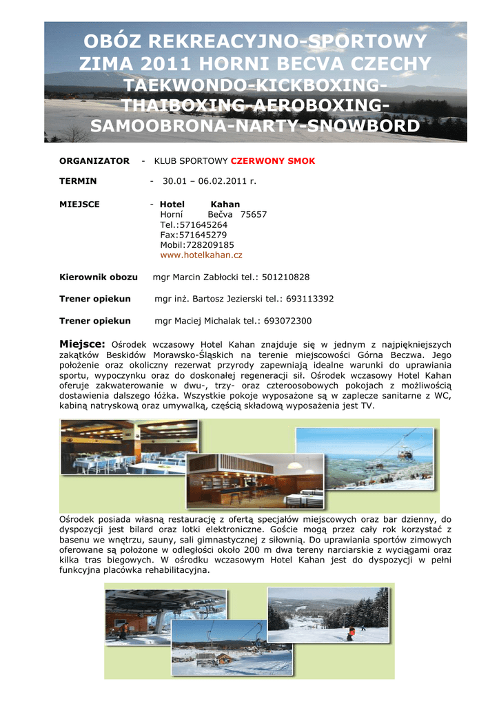 OBÓZ REKREACYJNO-SPORTOWY ZIMA 2011 HORNI BECVA CZECHY TAEKWONDO-KICKBOXINGTHAIBOXING-AEROBOXINGSAMOOBRONA-NARTY-SNOWBORD ORGANIZATOR - KLUB SPORTOWY CZERWONY SMOK TERMIN - 30.01 – 06.02.2011 r. MIEJSCE - Hotel Kahan Horní Bečva 75657 Tel.:571645264 Fax:571645279 Mobil:728209185 www.hotelkahan.cz Kierownik obozu mgr Marcin Zabłocki tel.: 501210828 Trener opiekun mgr inż. Bartosz Jezierski tel.: 693113392 Trener opiekun mgr Maciej Michalak tel.: 693072300 Miejsce: Ośrodek wczasowy Hotel Kahan znajduje się w jednym z najpiękniejszych zakątków Beskidów Morawsko-Śląskich na terenie miejscowości Górna Beczwa. Jego położenie oraz okoliczny rezerwat przyrody zapewniają idealne warunki do uprawiania sportu, wypoczynku oraz do doskonałej regeneracji sił. Ośrodek wczasowy Hotel Kahan oferuje zakwaterowanie w dwu-, trzy- oraz czteroosobowych pokojach z możliwością dostawienia dalszego łóżka. Wszystkie pokoje wyposażone są w zaplecze sanitarne z WC, kabiną natryskową oraz umywalką, częścią składową wyposażenia jest TV. Ośrodek posiada własną restaurację z ofertą specjałów miejscowych oraz bar dzienny, do dyspozycji jest bilard oraz lotki elektroniczne. Goście mogą przez cały rok korzystać z basenu we wnętrzu, sauny, sali gimnastycznej z siłownią. Do uprawiania sportów zimowych oferowane są położone w odległości około 200 m dwa tereny narciarskie z wyciągami oraz kilka tras biegowych. W ośrodku wczasowym Hotel Kahan jest do dyspozycji w pełni funkcyjna placówka rehabilitacyjna. Program obozu: - Treningi sportowe ogólnorozwojowe w terenie, - Treningi specjalistyczne na sali gimnastycznej (zajęcia treningowe odbywać będą się na sali sportowej mieszczącej się przy obiekcie), - Gry i zabawy sportowe na śniegu dla grup rekreacyjnych, - Zajęcia świetlicowe, zabawy obozowe, filmy szkoleniowe Taekwondo, Kick –boxing, Thai-boxing, - Zajęcia i zabawy na krytym basenie kąpielowym połączone z nauką pływania dla chętnych. Na terenie obiektu dostępny dla uczestników jest basen oraz sauna. Cena obozu 990 zł Wpłaty zaliczki i pełnej odpłatności należy uiszczać na konto z dopiskiem: imię i nazwisko, numer PESEL uczestnika; tytułem -opłata za obóz sportowy. Konto WBK nr konta 74 1090 1359 0000 0001 0947 9929 W cenie obozu: - Przejazd autokarem do hotelu w Horni Becva w Czechach (Wyjazd 30.01.2011; Zbiórka: Luboń ul Kołłątaja 1 przy Szkole Gimnazjum nr 2 godzina 7:00; zbiórka w Poznaniu ul. Bóżnicza 6/7 Siedziba Klubu godzina 7:30. Powrót do Poznania 06.02.2011 w godzinach popołudniowych.) -Zakwaterowanie w ośrodku Hotel Kahan - Wyżywienie: 3 posiłki dziennie. - Program j. w. - Opiekę wykwalifikowanej kadry opiekuńczo-wychowawczej. - Zajęcia sportowe-treningi sportowe z wykwalifikowaną kadrą trenerską. - Opieka ratownika podczas kąpieli. - Ubezpieczenie NW. - Dres Obozowy Firmy ERIMA - Film „wspomnienie z obozu„ - Możliwość nauki jazdy na nartach, snowbordzie- za dodatkową opłatą. Zainteresowanych uczestnictwem prosimy o kontakt z kierownikiem lub trenerami klubowymi telefony podane wyżej. Na stronie www.czerwony-smok.pl są do pobrania druki: karta obozowa (obowiązkowa dla osób niepełnoletnich), umowa-zgłoszenie, regulamin uczestnika-oświadczenie (obowiązkowe podpisane przez rodziców), warunki uczestnictwa. Termin rezerwacji i zapisów do 30 grudnia 2010r. Warunek rezerwacji- wpłata 300 zł zaliczki do organizatora. Ilość miejsc ograniczona warunkiem uczestnictwa jest kolejność wpłat. Organizator zastrzega sobie prawo do zatrzymania wpłaty zaliczki w przypadku rezygnacji z uczestnictwa. Pełna odpłatność za obóz musi być uiszczona najpóźniej do 25 stycznia 2011 r. Organizator zastrzega sobie prawo do odwołania obozu w przypadku sytuacji niezależnych od organizatora (mała liczba uczestników, wypadki losowe zawiązane z organizatorem). Organizator w takich sytuacjach zobowiązuje się do zwrotu wpłaconej zaliczki przez uczestników.