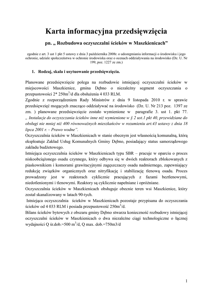 Karta informacyjna przedsięwzięcia pn. „ Rozbudowa oczyszczalni ścieków w Maszkienicach” zgodnie z art. 3 ust 1 pkt 5 ustawy z dnia 3 października 2008r. o udostępnianiu informacji o środowisku i jego ochronie, udziale społeczeństwa w ochronie środowiska oraz o ocenach oddziaływania na środowisko (Dz. U. Nr 199, poz. 1227 ze zm.) 1. Rodzaj, skala i usytuowanie przedsięwzięcia. Planowane przedsięwzięcie polega na rozbudowie istniejącej oczyszczalni ścieków w miejscowości Maszkienice, gmina Dębno o niezależny segment oczyszczania o przepustowości 2* 250m3/d dla obsłużenia 4 033 RLM. Zgodnie z rozporządzeniem Rady Ministrów z dnia 9 listopada 2010 r. w sprawie przedsięwzięć mogących znacząco oddziaływać na środowisko (Dz. U. Nr 213 poz. 1397 ze zm. ) planowane przedsięwzięcie zostało wymienione w paragrafie 3. ust 1. pkt 77. „ Instalacje do oczyszczania ścieków inne niż wymienione w § 2 ust.1 pkt 40, przewidziane do obsługi nie mniej niż 400 równoważnych mieszkańców w rozumieniu art.43 ustawy z dnia 18 lipca 2001 r. – Prawo wodne”. Oczyszczalnia ścieków w Maszkienicach w stanie obecnym jest własnością komunalną, którą eksploatuje Zakład Usług Komunalnych Gminy Dębno, posiadający status samorządowego zakładu budżetowego. Istniejąca oczyszczalnia ścieków w Maszkienicach typu SBR – pracuje w oparciu o proces niskoobciążonego osadu czynnego, który odbywa się w dwóch reaktorach zblokowanych z piaskownikiem i komorami grawitacyjnymi zagęszczaczy osadu nadmiernego, zapewniający redukcję związków organicznych oraz nitryfikację i stabilizację tlenową osadu. Proces prowadzony jest w reaktorach cyklicznie pracujących z fazami beztlenowymi, niedotlenionymi i tlenowymi. Reaktory są cyklicznie napełniane i opróżniane. Oczyszczalnia ścieków w Maszkienicach obsługuje obecnie teren wsi Maszkienice, który został skanalizowany w latach 90-tych. Istniejąca oczyszczalnia ścieków w Maszkienicach pozostaje przypisana do oczyszczania ścieków od 4 033 RLM i posiada przepustowość 250m3/d. Bilans ścieków bytowych z obszaru gminy Dębno stwarza konieczność rozbudowy istniejącej oczyszczalni ścieków w Maszkienicach o dwa niezależne ciągi technologiczne o łącznej wydajności Q śr.dob.=500 m3/d, Q max. dob.=750m3/d 1 Rys. 1 Planowane przedsięwzięcie na tle najbliższej okolicy Źródło: http://geoportal.gov.pl/ Gmina Dębno posiada Miejscowy Plan Zagospodarowania Przestrzennego ( MPZP), przyjęty Uchwałą Nr II/133/2004 Rady Gminy w Dębnie z dnia 28 kwietnia 2004 roku (Dz. Urz. Woj. Małopolskiego z 2004 roku nr 163 poz. 1927). Obowiązuje również Studium uwarunkowań i kierunków zagospodarowania przestrzennego gminy Dębno Uchwała Nr II/266/2010 Rady Gminy Dębno z dnia 26 lutego 2010 r. Teren przewidziany pod planowane przedsięwzięcie to działka nr ew. 411/1 położona na obszarze oznaczonym w Miejscowym Planie Zagospodarowania Przestrzennego ( MPZP) symbolem H13 NO - tereny urządzeń infrastruktury technicznej - oczyszczalnia ścieków. Rys. 2 Wyrys z MPZP gminy Dębno 2 Numer obiektu: H13NO Przeznaczenie obiektu: NO(tereny urządzeń infrastruktury technicznej - odprowadzania i oczyszczania ścieków) Gmina Dębno znajduje się w zlewni rzeki Uszwicy, która przepływa przez północno – zachodnią część terenu gminy. Przez centralną część gminy przepływa potok Niedźwiedź, natomiast wzdłuż wschodniej granicy terenu gminy Dębno przepływa rzeka Kisielina, prawobrzeżny dopływ rzeki Wisły. Na terenie gminy nie występują główne zbiorniki wód podziemnych. Najbliższe otoczenie planowanej do rozbudowy oczyszczalni ścieków stanowią pola uprawne, łąki oraz nieużytki, natomiast w dalszej odległości znajdują się tereny zadrzewione oraz zarośla. Na działce nr 411/1 brak jest drzew i zakrzewień, które wymagałyby wycinki w związku z planowaną budową. Dojazd do oczyszczalni stanowi droga asfaltowa. Odległość do najbliższej zabudowy mieszkalnej (dom jednorodzinny) wynosi ponad 300 m. Doprowadzenie ścieków oczyszczonych odbywać się będzie kolektorem grawitacyjnym PE fi 400 do rowu melioracyjnego ( odbiornika oczyszczonych ścieków), który stanowi prawobrzeżny dopływ rzeki Uszwicy . Odległość od oczyszczalni ścieków do rzeki Uszwicy wynosi w linii prostej 140 m. 2. Powierzchnia zajmowanej nieruchomości, a także obiektu budowlanego oraz dotychczasowy sposób ich wykorzystywania i pokrycie szatą roślinną. Istniejące zagospodarowanie terenu: Działka, na której znajduje się planowana do rozbudowy oczyszczalnia ścieków, ma powierzchnię 93,52 a ( 9 352 m2 ). Działka w części niezabudowanej stanowi teren przekształcony . Nie występują na nim grzyby, rośliny i zwierzęta objęte ochroną gatunkową. Sąsiedztwo oczyszczalni stanowią tereny zielone ( nieużytki, tereny zadrzewione oraz łąki i pola uprawne). Najbliższa zabudowa mieszkalna znajduje się w odległości ponad 300 m od granicy działki. 3 Rys. zagospodarowanie terenu rozpatrywanej działki źródło: geoportal.gov.pl Projektowane zagospodarowanie terenu: Projektuje się zlokalizować budynek oczyszczalni ścieków Inwestycja będąca przedmiotem niniejszego opracowania będzie polegała na: budowie nowoprojektowanych obiektów technologicznych i technicznych; zmianie wyposażenia technologicznego w obiektach już istniejących; budowie nowoprojektowanych sieci technicznych i technologicznych oczyszczalni; przebudowie komunikacji; przebudowie istniejących obiektów technicznych i technologicznych; renowacji i uzupełnieniu zieleni wraz z ogrodzeniem na terenie Podczas prac budowlanych nie przewiduje się wycinki drzew ani zniszczenia szaty roślinnej. Po skończeniu prac powierzchnia zabudowana zwiększy się do 40%, czyli na ogólną powierzchnię działki 93,52 a , cześć zabudowana wyniesie 37 arów. 3. Rodzaj technologii Oczyszczalnia ścieków w Maszkienicach typu