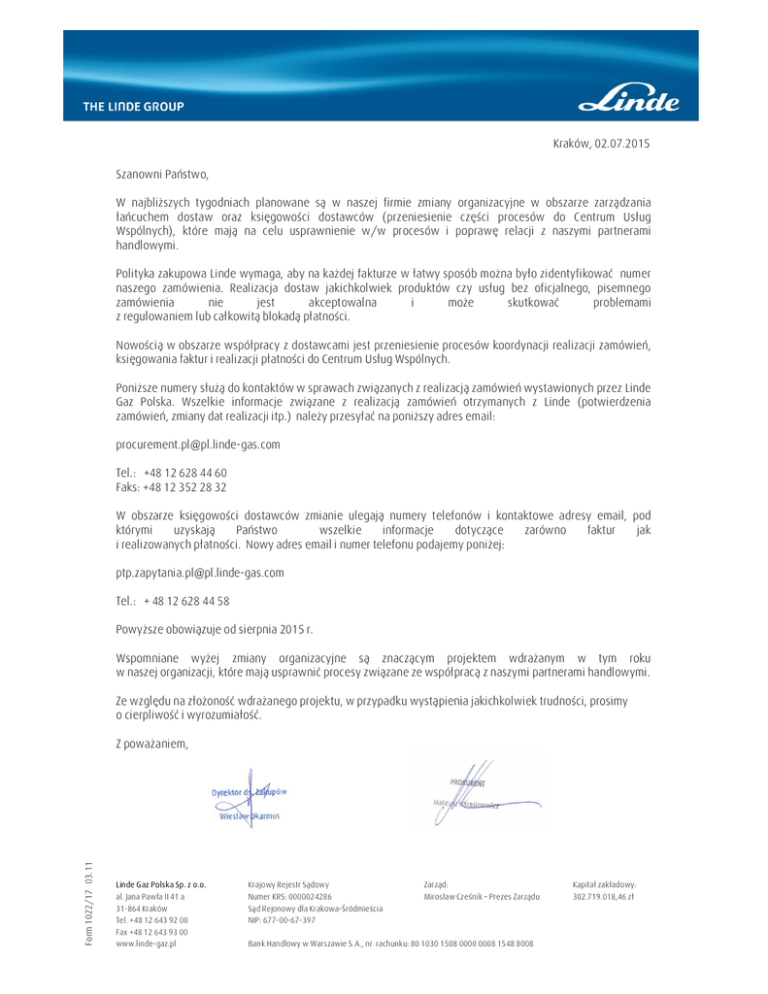 Kraków, 02.07.2015 Szanowni Państwo, W najbliższych tygodniach planowane są w naszej firmie zmiany organizacyjne w obszarze zarządzania łańcuchem dostaw oraz księgowości dostawców (przeniesienie części procesów do Centrum Usług Wspólnych), które mają na celu usprawnienie w/w procesów i poprawę relacji z naszymi partnerami handlowymi. Polityka zakupowa Linde wymaga, aby na każdej fakturze w łatwy sposób można było zidentyfikować numer naszego zamówienia. Realizacja dostaw jakichkolwiek produktów czy usług bez oficjalnego, pisemnego zamówienia nie jest akceptowalna i może skutkować problemami z regulowaniem lub całkowitą blokadą płatności. Nowością w obszarze współpracy z dostawcami jest przeniesienie procesów koordynacji realizacji zamówień, księgowania faktur i realizacji płatności do Centrum Usług Wspólnych. Poniższe numery służą do kontaktów w sprawach związanych z realizacją zamówień wystawionych przez Linde Gaz Polska. Wszelkie informacje związane z realizacją zamówień otrzymanych z Linde (potwierdzenia zamówień, zmiany dat realizacji itp.) należy przesyłać na poniższy adres email: [email protected] Tel.: +48 12 628 44 60 Faks: +48 12 352 28 32 W obszarze księgowości dostawców zmianie ulegają numery telefonów i kontaktowe adresy email, pod którymi uzyskają Państwo wszelkie informacje dotyczące zarówno faktur jak i realizowanych płatności. Nowy adres email i numer telefonu podajemy poniżej: [email protected] Tel.: + 48 12 628 44 58 Powyższe obowiązuje od sierpnia 2015 r. Wspomniane wyżej zmiany organizacyjne są znaczącym projektem wdrażanym w tym roku w naszej organizacji, które mają usprawnić procesy związane ze współpracą z naszymi partnerami handlowymi. Ze względu na złożoność wdrażanego projektu, w przypadku wystąpienia jakichkolwiek trudności, prosimy o cierpliwość i wyrozumiałość. Form 1022/17 03.11 Z poważaniem, Linde Gaz Polska Sp. z o.o. al. Jana Pawła II 41 a 31-864 Kraków Tel. +48 12 643 92 00 Fax +48 12 643 93 00 www.linde-gaz.pl Krajowy Rejestr Sądowy Numer KRS: 0000024286 Sąd Rejonowy dla Krakowa-Śródmieścia NIP: 677-00-67-397 Zarząd: Mirosław Cześnik – Prezes Zarządu Bank Handlowy w Warszawie S.A., nr rachunku: 80 1030 1508 0000 0008 1548 8008 Kapitał zakładowy: 302.719.018,46 zł