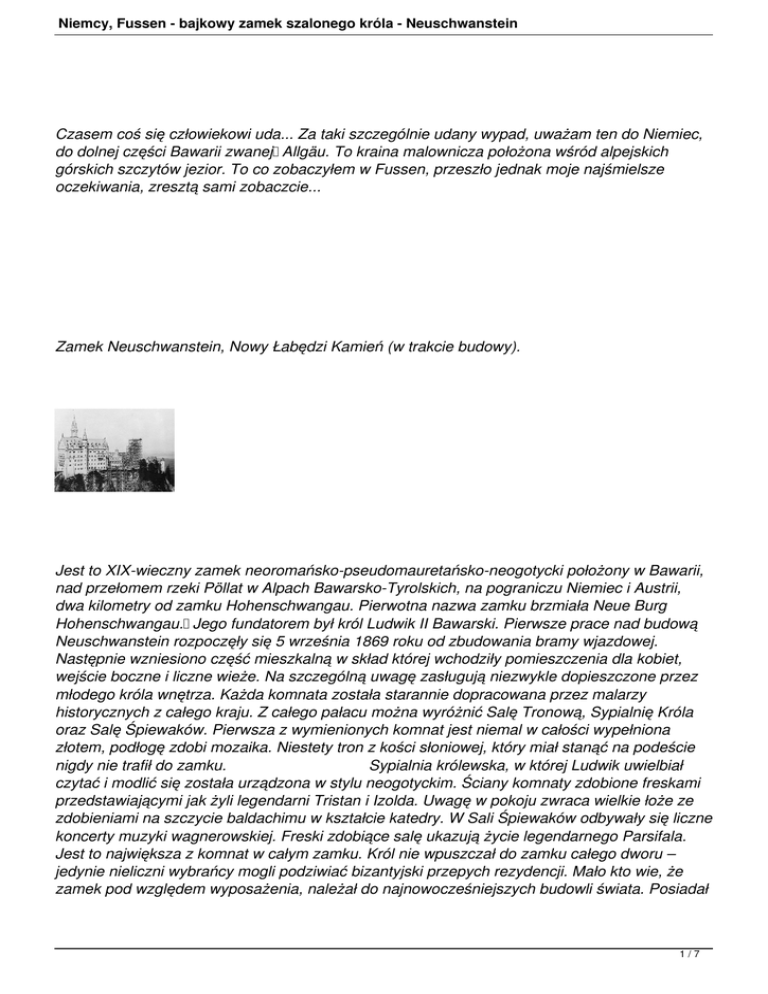 Niemcy, Fussen - bajkowy zamek szalonego króla - Neuschwanstein Czasem coś się człowiekowi uda... Za taki szczególnie udany wypad, uważam ten do Niemiec, do dolnej części Bawarii zwanej Allgäu. To kraina malownicza położona wśród alpejskich górskich szczytów jezior. To co zobaczyłem w Fussen, przeszło jednak moje najśmielsze oczekiwania, zresztą sami zobaczcie... Zamek Neuschwanstein, Nowy Łabędzi Kamień (w trakcie budowy). Jest to XIX-wieczny zamek neoromańsko-pseudomauretańsko-neogotycki położony w Bawarii, nad przełomem rzeki Pöllat w Alpach Bawarsko-Tyrolskich, na pograniczu Niemiec i Austrii, dwa kilometry od zamku Hohenschwangau. Pierwotna nazwa zamku brzmiała Neue Burg Hohenschwangau. Jego fundatorem był król Ludwik II Bawarski. Pierwsze prace nad budową Neuschwanstein rozpoczęły się 5 września 1869 roku od zbudowania bramy wjazdowej. Następnie wzniesiono część mieszkalną w skład której wchodziły pomieszczenia dla kobiet, wejście boczne i liczne wieże. Na szczególną uwagę zasługują niezwykle dopieszczone przez młodego króla wnętrza. Każda komnata została starannie dopracowana przez malarzy historycznych z całego kraju. Z całego pałacu można wyróżnić Salę Tronową, Sypialnię Króla oraz Salę Śpiewaków. Pierwsza z wymienionych komnat jest niemal w całości wypełniona złotem, podłogę zdobi mozaika. Niestety tron z kości słoniowej, który miał stanąć na podeście nigdy nie trafił do zamku. Sypialnia królewska, w której Ludwik uwielbiał czytać i modlić się została urządzona w stylu neogotyckim. Ściany komnaty zdobione freskami przedstawiającymi jak żyli legendarni Tristan i Izolda. Uwagę w pokoju zwraca wielkie łoże ze zdobieniami na szczycie baldachimu w kształcie katedry. W Sali Śpiewaków odbywały się liczne koncerty muzyki wagnerowskiej. Freski zdobiące salę ukazują życie legendarnego Parsifala. Jest to największa z komnat w całym zamku. Król nie wpuszczał do zamku całego dworu – jedynie nieliczni wybrańcy mogli podziwiać bizantyjski przepych rezydencji. Mało kto wie, że zamek pod względem wyposażenia, należał do najnowocześniejszych budowli świata. Posiadał 1/7 Niemcy, Fussen - bajkowy zamek szalonego króla - Neuschwanstein pierwszą prawdopodobnie w Niemczech instalację centralnego ogrzewania, windę itp. Słów kilka o fundatorze zamku. Ludwik II, niem. Ludwig Friedrich Wilhelm von Wittelsbach, znany również jako Ludwik Szalony lub Bajkowy Król. Urodził się 25 sierpnia 1845 w Monachium, w pałacu Nymphenburg nieopodal Monachium jako pierwsze dziecko Maksymiliana II i księżniczki pruskiej Marii. Wstąpił na tron po śmierci ojca, w wieku 18 lat. Za jego panowania Bawaria została włączona do Rzeszy Niemieckiej, czemu był osobiście niechętny. Podpisał on co prawda wystosowany z inicjatywy Bismarcka list do Wilhelma I, w którym jako najpotężniejszy po królu pruskim władca niemiecki wezwał go do objęcia tronu cesarskiego, ale zdecydowały o tym względy finansowe (zadłużony Ludwik za swoją zgodę przyjął od Bismarcka 6 milionów marek w złocie). Ludwik był ekscentryczną osobą, np. utożsamiał się z Parsifalem. Jego dziwactwo (przez niektórych uznawane za chorobę psychiczną) postępowało wraz z kolejnymi niepowodzeniami w polityce zagranicznej i wewnętrznej. Pod koniec rządów praktycznie odseparował się od świata, spędzając czas w swoich baśniowych pałacach w Alpach. Najsłynniejszy z nich, Neuschwanstein, nigdy nie został ukończony, lecz mimo to jest jedną z najpopularniejszych 2/7 Niemcy, Fussen - bajkowy zamek szalonego króla - Neuschwanstein niemieckich atrakcji turystycznych i symbolem Bawarii. Wielu współczesnych badaczy uważa, że "nietypowe" zachowania bawarskiego króla nie wynikały z obłędu, lecz stresu i problemów nieodłącznie związanych ze sprawowaniem władzy przez wrażliwą jednostkę. Ludwik II był nie tylko wielkim budowniczym niesamowitych pałaców (poza Neuschwanstein wybudował również pałace Herrenchiemsee i Linderhof; czwarty z pałaców - Falkenstein - pozostał w sferze planów). Zasłynął również jako mecenas Ryszarda Wagnera. Jest wielce prawdopodobne, że gdyby nie królewskie wsparcie pieniężne, nigdy nie powstałby Pierścień Nibelunga. Ludwik nigdy się nie ożenił, choć był zaręczony z księżniczką bawarską – Zofią Charlottą, jego kuzynką i siostrą cesarzowej Elżbiety. Zaręczyny ogłoszono 22 stycznia 1867, ale po licznych zmianach daty ślubu, Ludwik wycofał się z danego słowa w październiku tego samego roku, Zofia zaś poślubiła Ferdynanda d'Alençon, wnuka Ludwika Filipa. Wydarzenia roku 1867 utwierdziły króla w przekonaniu o własnym homoseksualizmie, co, jako że Ludwik był gorliwym katolikiem, nie pozostało bez wpływu na jego i tak chwiejną psychikę. 9 czerwca 1886 Ludwik II został oficjalnie uznany za niepoczytalnego i pozbawiony tronu w wyniku spisku zawiązanego przez wrogich mu ministrów z jego wujem, księciem Luitpoldem, na czele. Następnie został uwięziony w zamku Berg, nad jeziorem Starnberg, na południe od Monachium. Niejasna jest jego śmierć w jeziorze Starnberg, rozważane było samobójstwo i morderstwo. 13 czerwca 1886 odnaleziono ciało Ludwika i jego lekarza Bernharda von Guddena, w jeziorze Starnberg, niedaleko brzegu. Ludwik został pochowany w kościele św. Michała w Monachium. Jest jednym z najbardziej charakterystycznych władców w całej historii Niemiec. Jego postać wciąż budzi żywe emocje i spory. W pamięci swoich poddanych zapisał się jako król-pacyfista (starał się unikać konfliktu zbrojnego z Prusami, a później z Francją). 3/7 Niemcy, Fussen - bajkowy zamek szalonego króla - Neuschwanstein Widok z parkingu na otoczenie zamków. Zamek Hohenschwangau, rezydencja położona tuż przy jeziorze, niedaleko Neuschwanstein. Zanim Ludwik wybudował swój bajkowy zamek, mieszkał tutaj... 